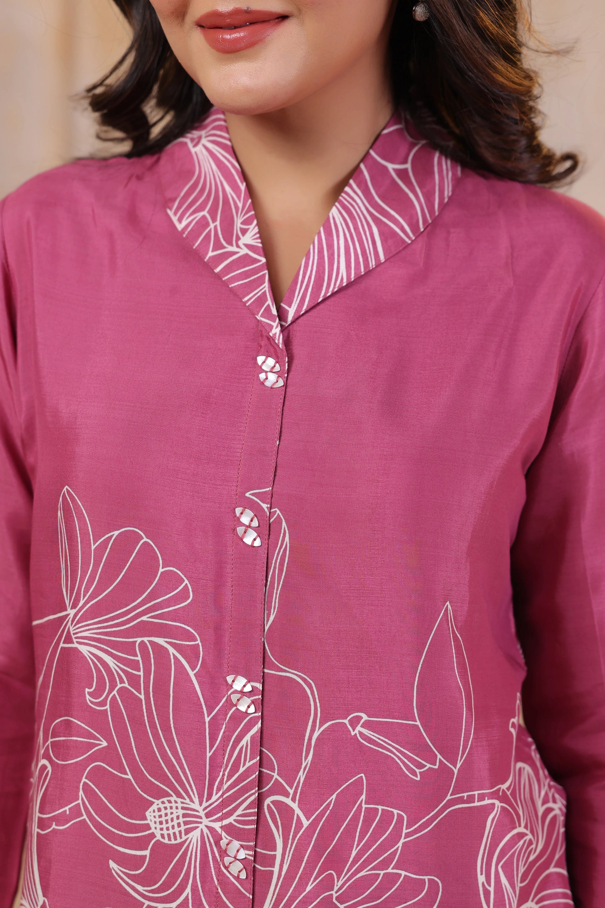 • Design: Lapel Collar, 3/4th Sleeves, Shell Button Closure, Soft Print