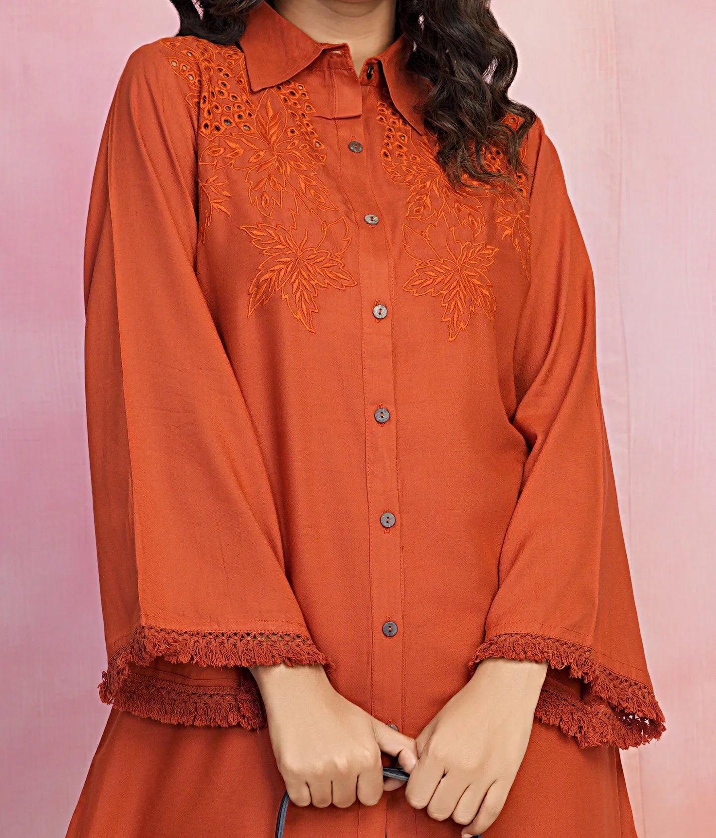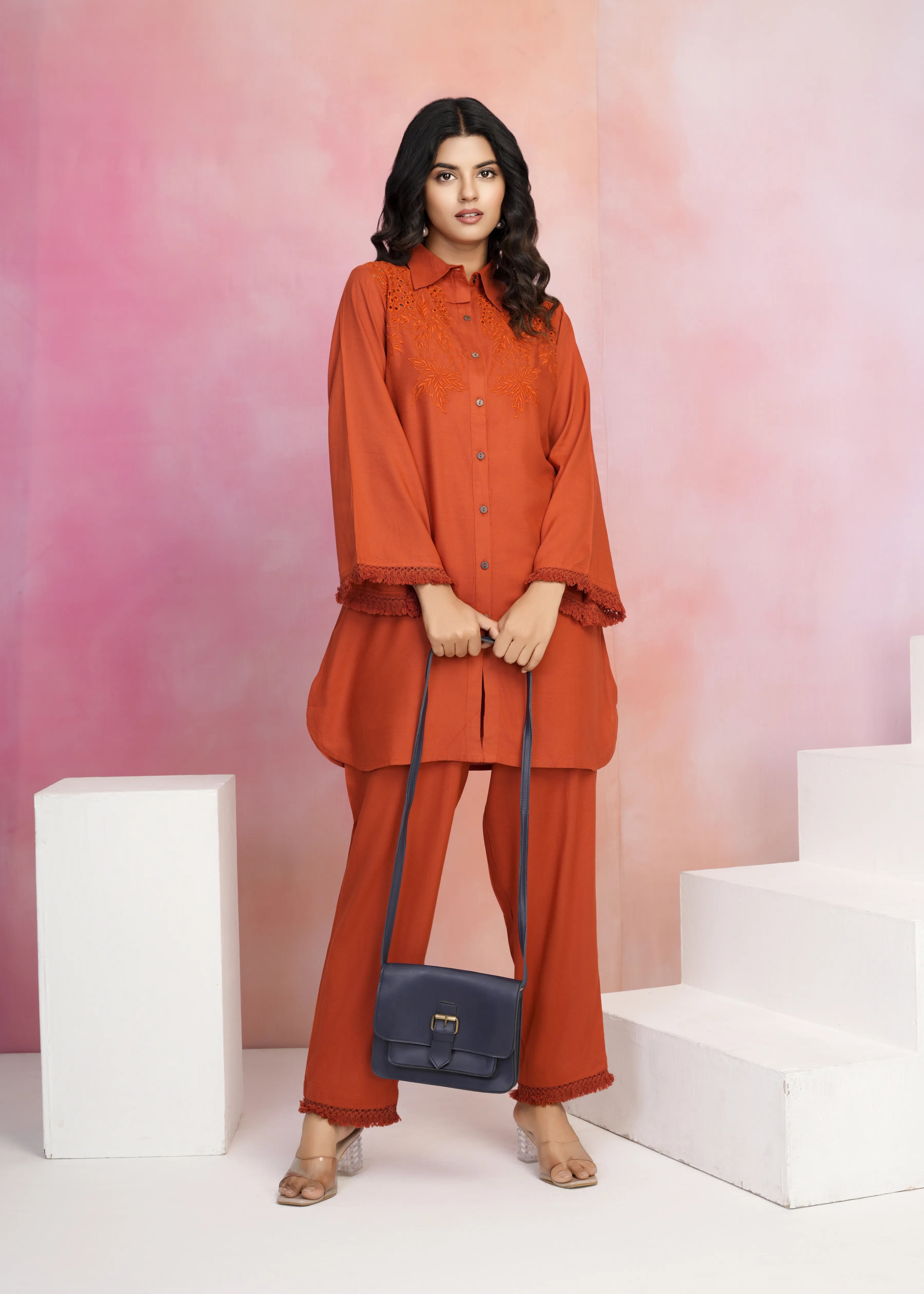 Add a touch of elegance to your wardrobe with this stunning red co-ord set, crafted from soft and breathable Viscose rayon for ultimate comfort. Featuring intricate embroidery on the front, wooden button detailing, and delicate lace accents, this ensemble is designed to elevate your style. The full sleeves enhance its sophisticated appeal, making it a perfect choice for casual outings or semi-formal occasions.