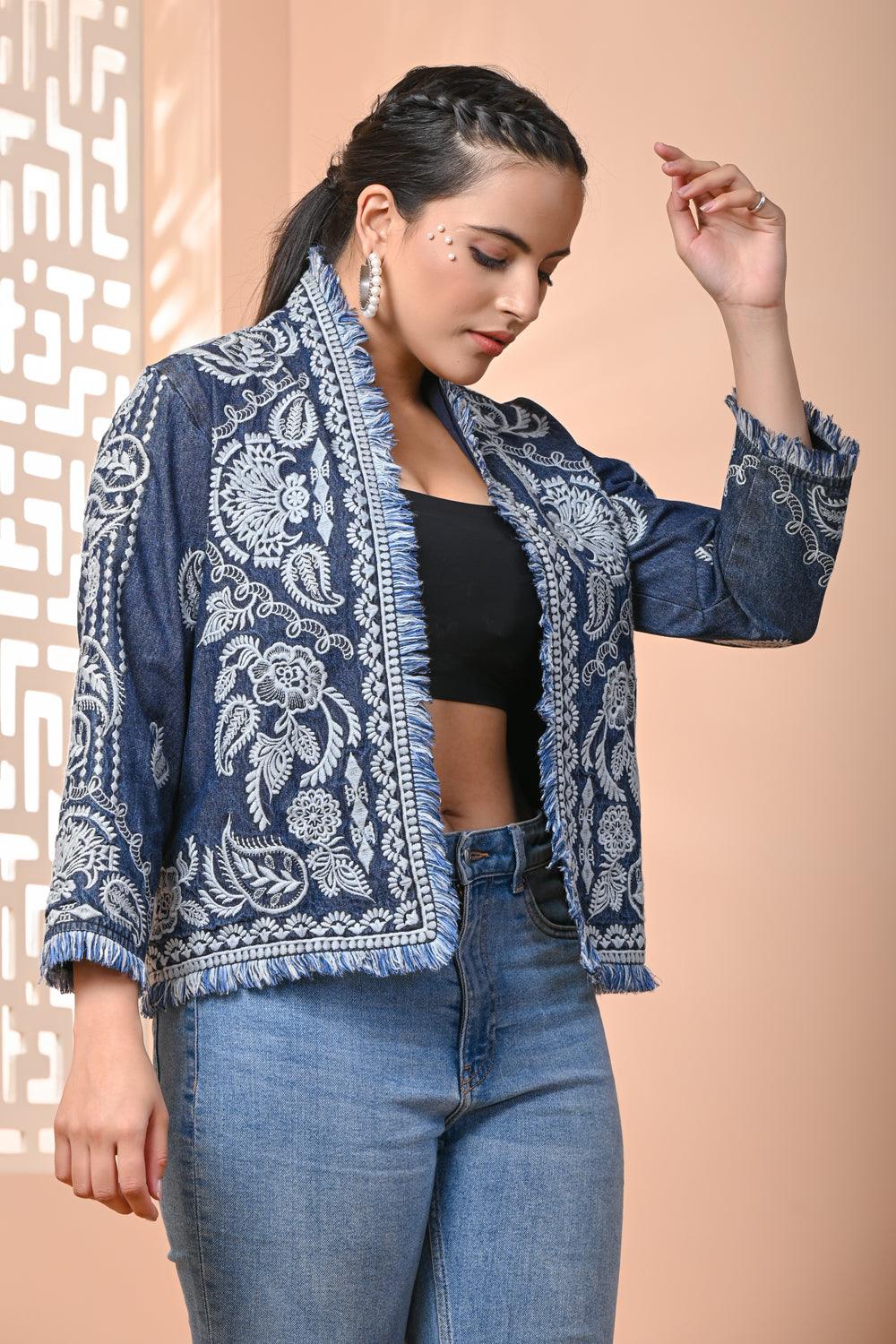 Introducing the Roop Denim Embroidered Cotton Jacket, a stunning fusion of traditional craftsmanship and contemporary style. Crafted from premium blue suede cotton, this jacket is densely adorned with intricate thread embroidery, showcasing subtle and sophisticated color combinations.