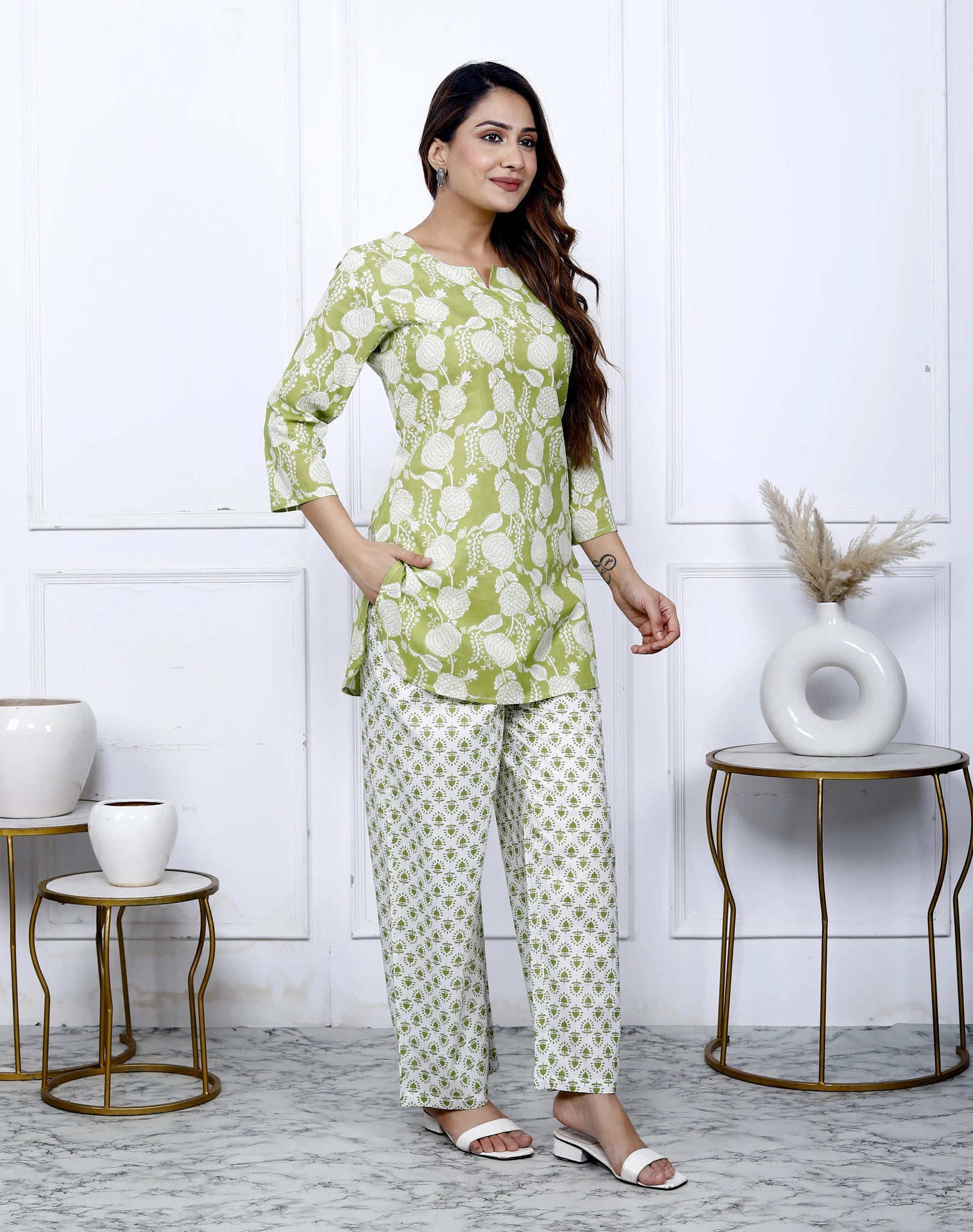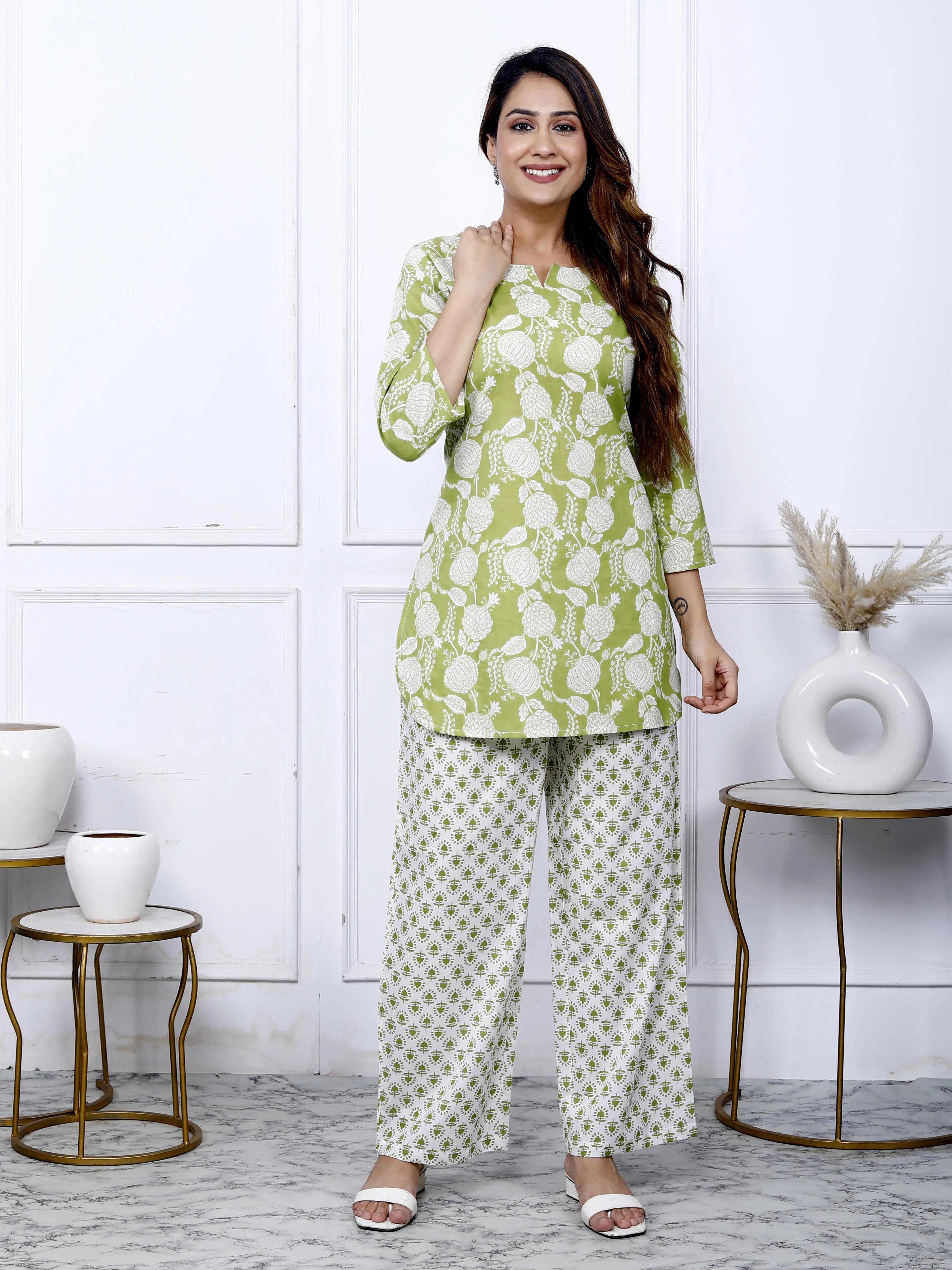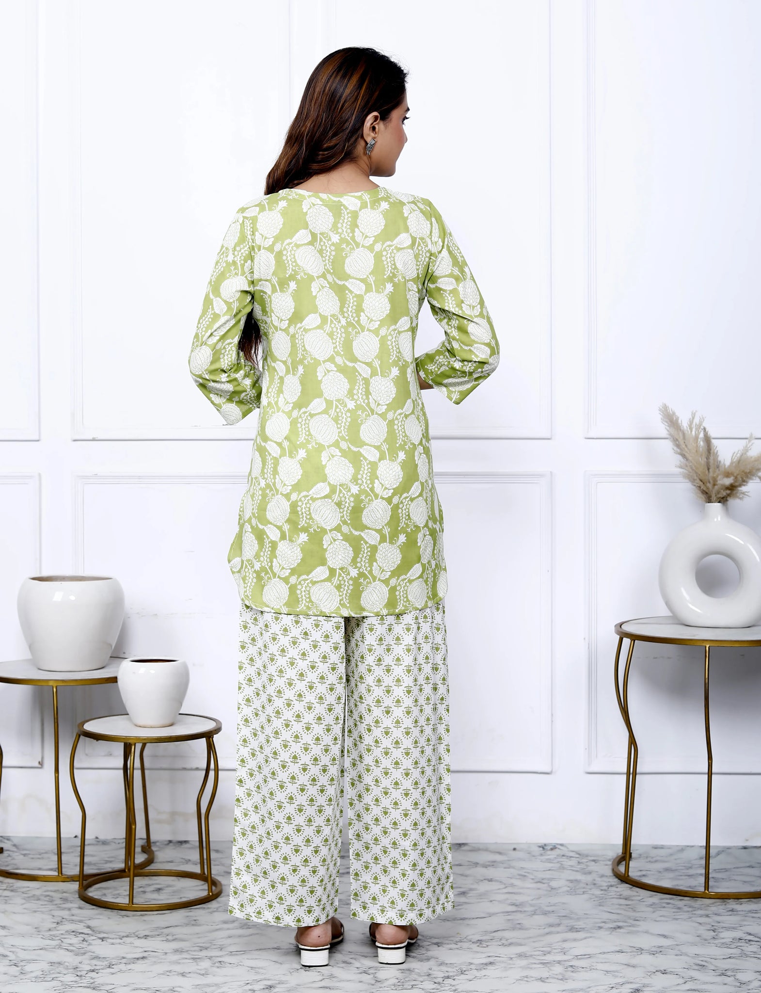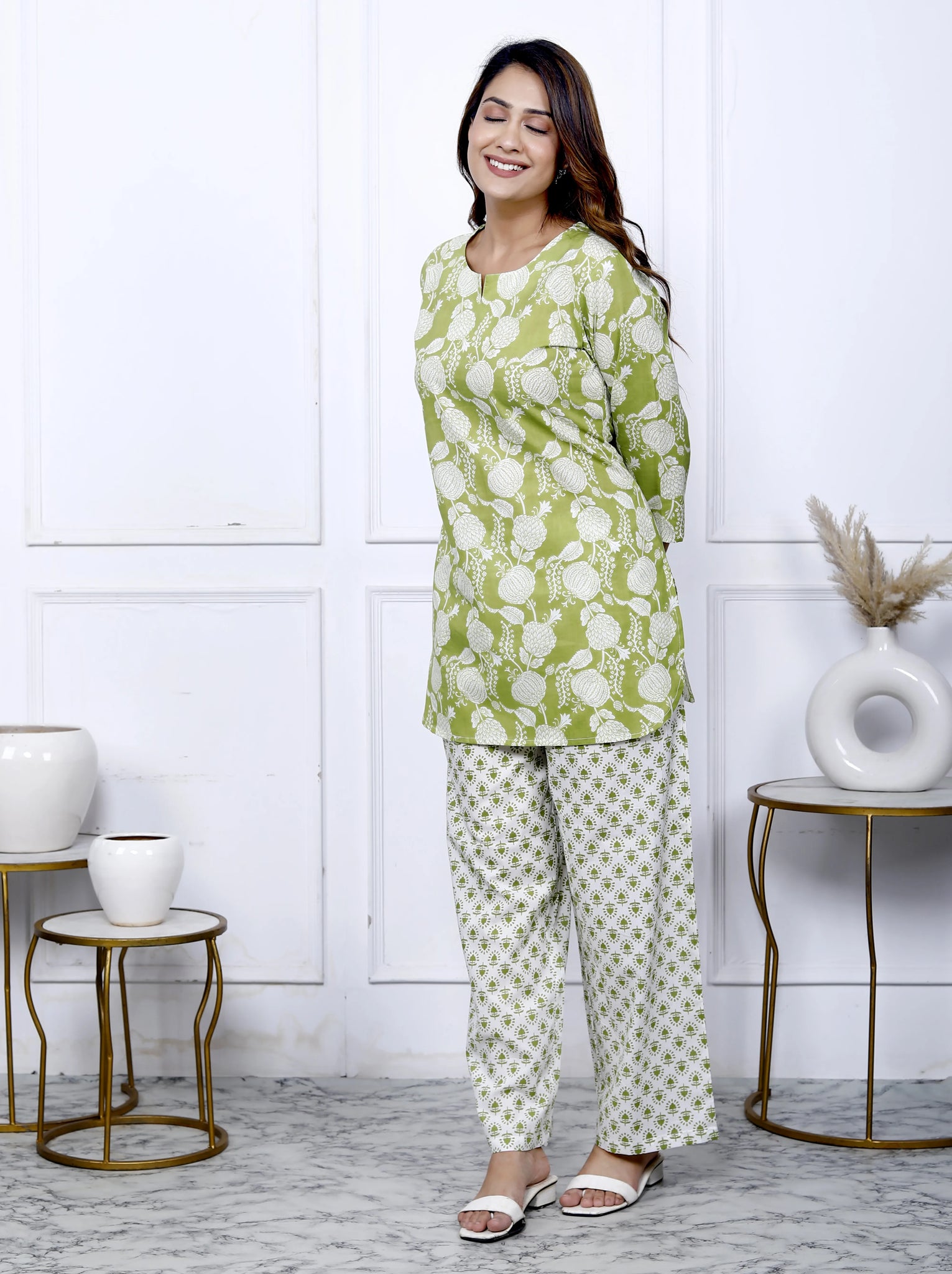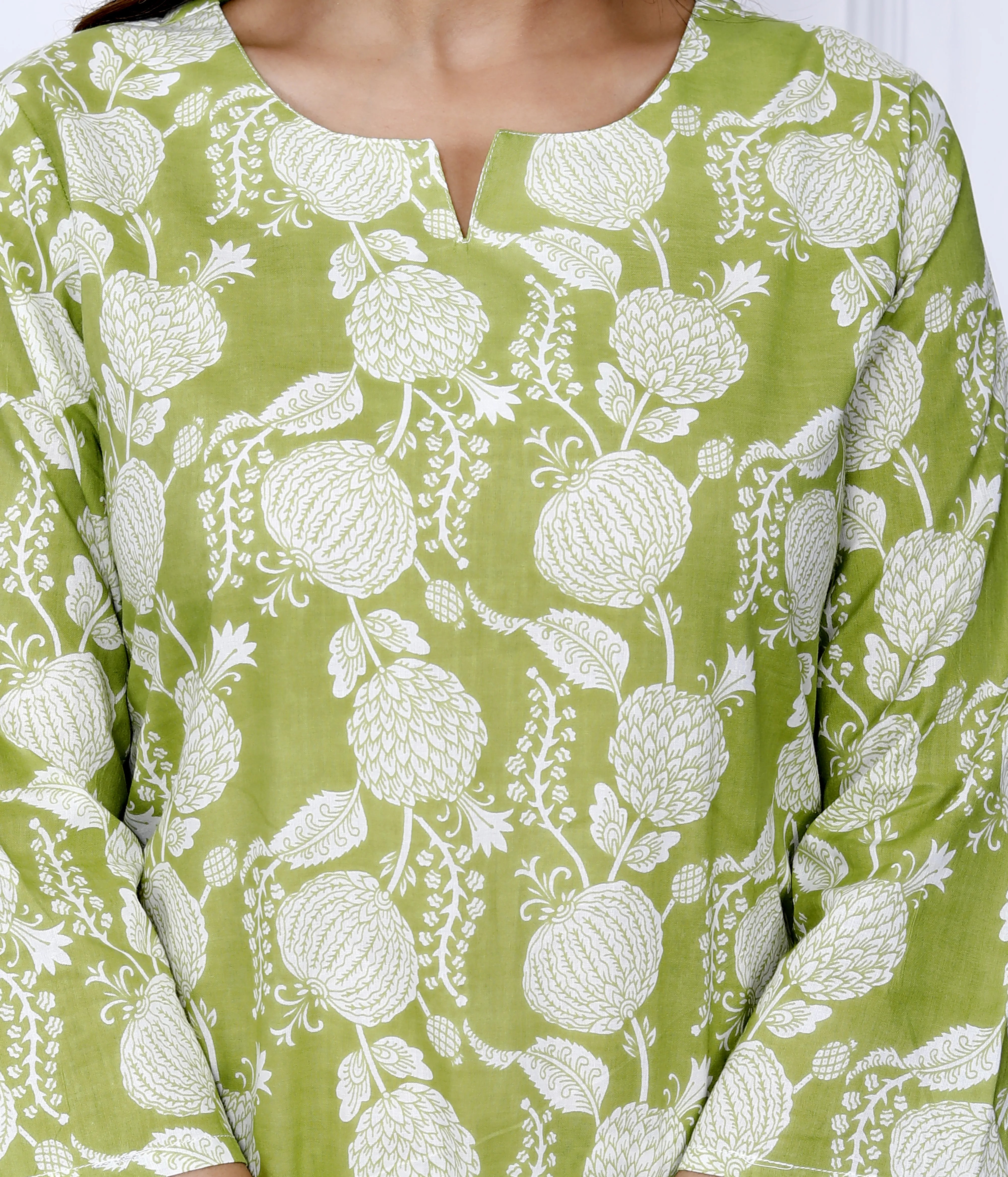 Sage Green Cotton Botanical Printed Kurta with Pant: Fresh & Elegant