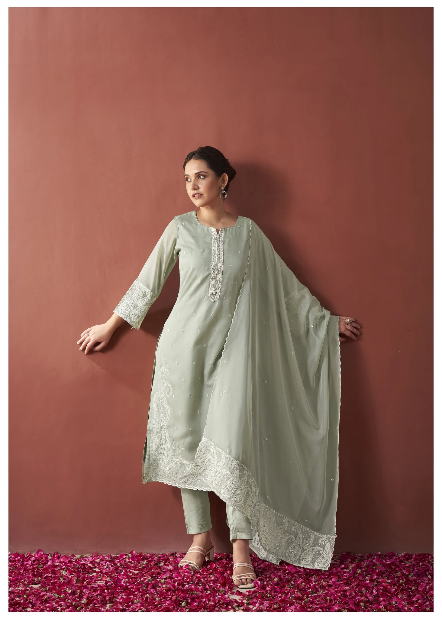 Exude sophistication with this Sage Green Paisley Embroidery Organza Ethnic Set, a timeless ensemble perfect for special occasions. This set combines traditional charm with modern elegance, featuring intricate embroidery, premium fabrics, and thoughtful detailing.