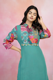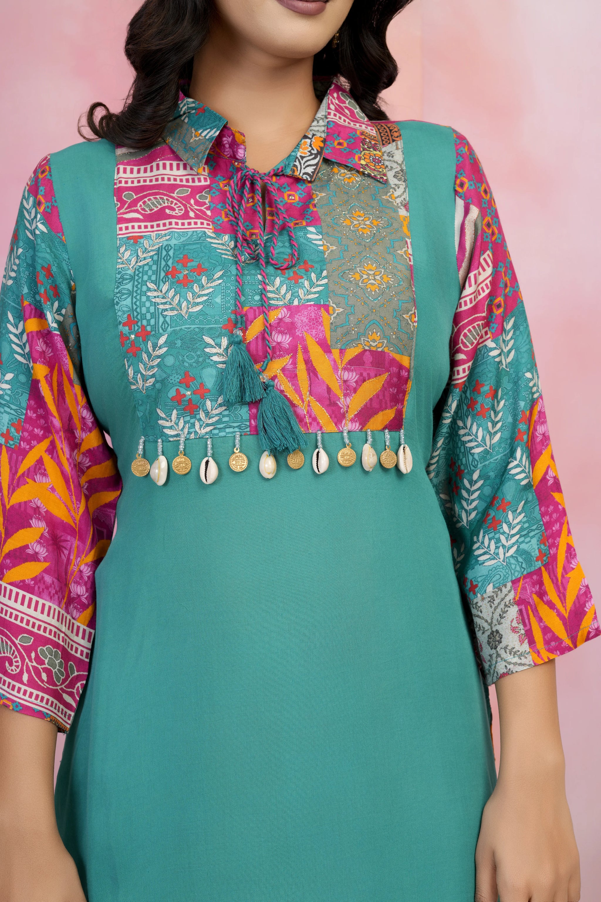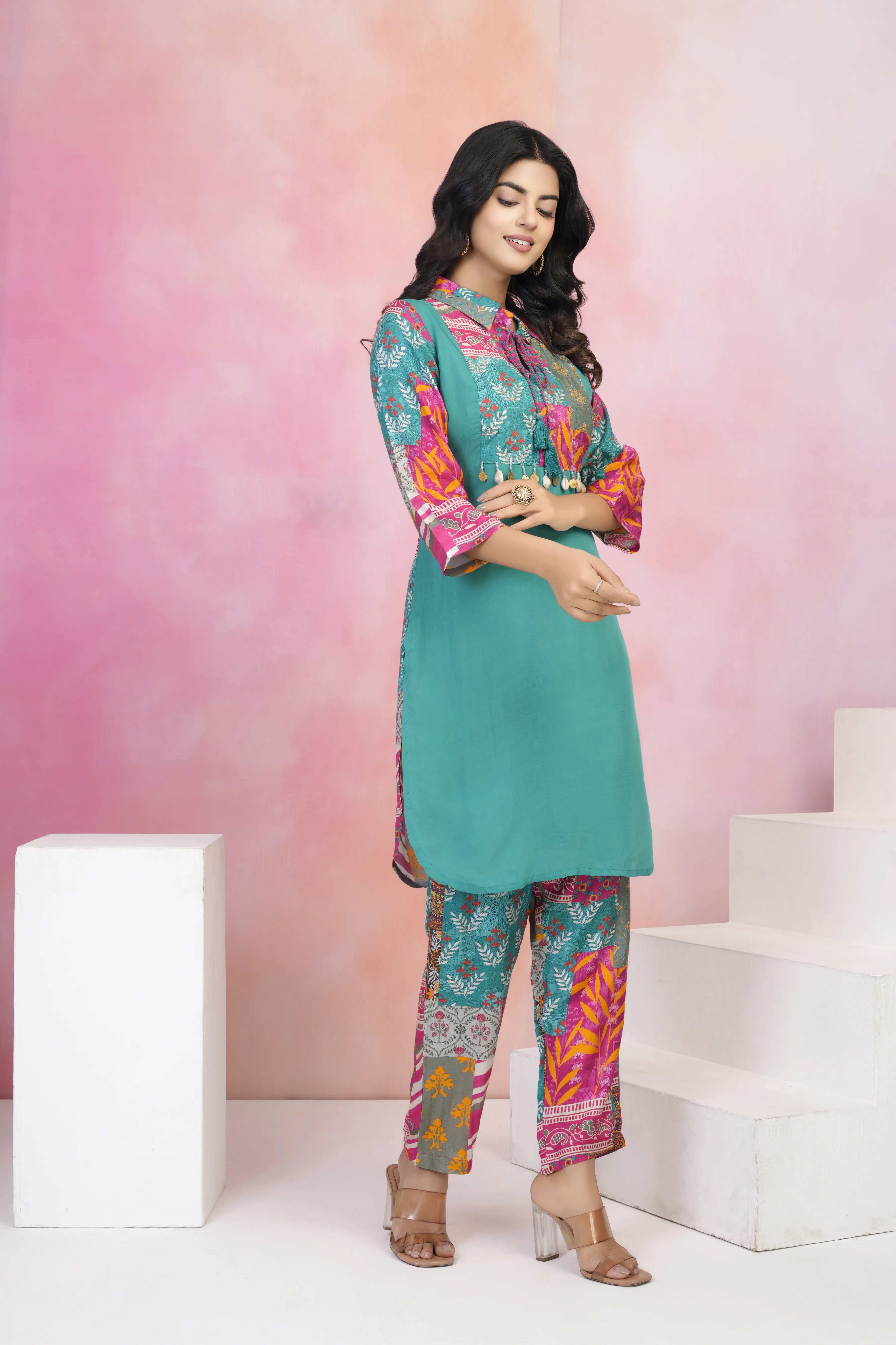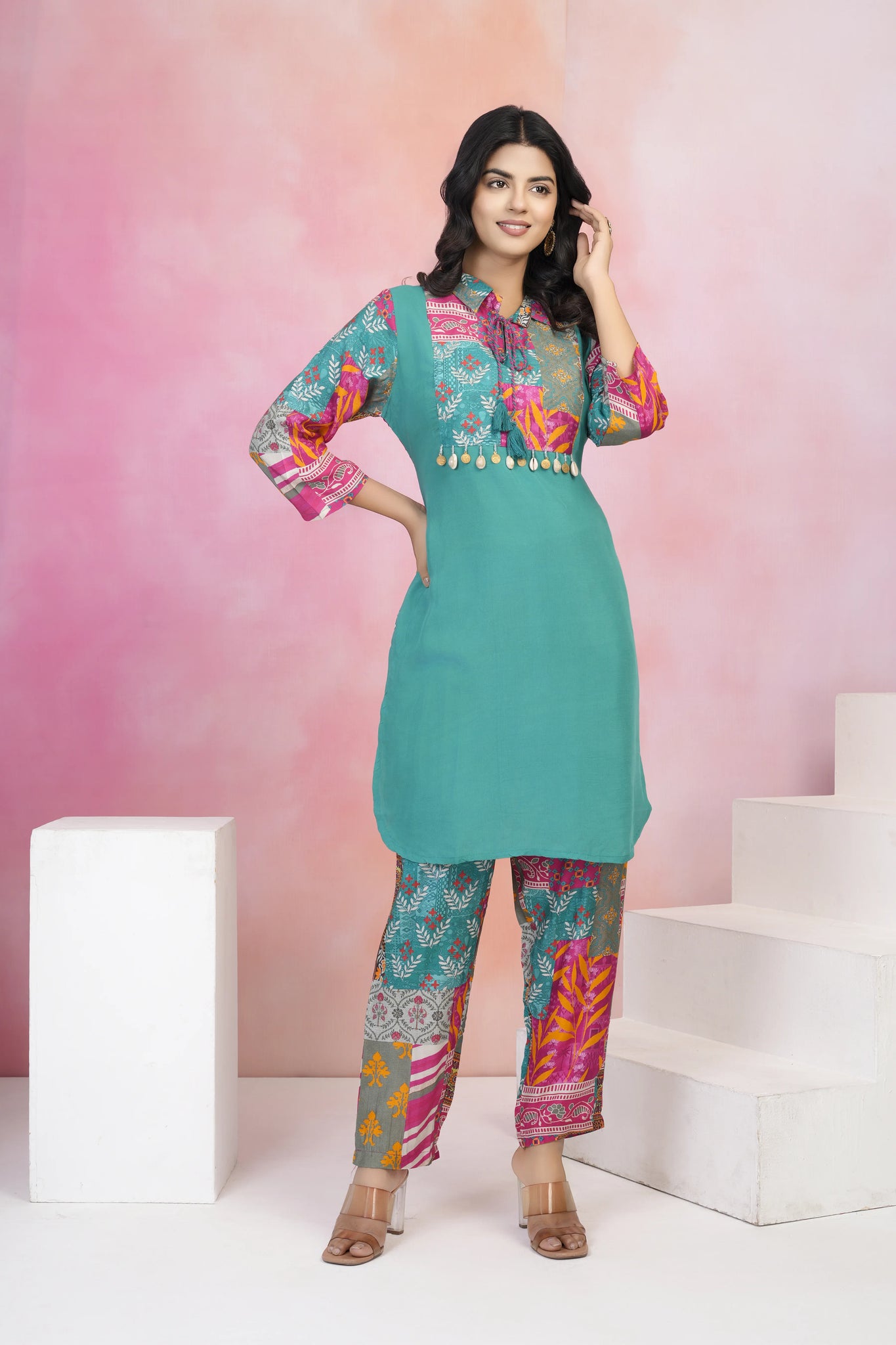Bring a refreshing vibe to your collection with this sea green co-ord set, where modern craftsmanship meets bohemian elegance for a look that’s effortlessly chic!