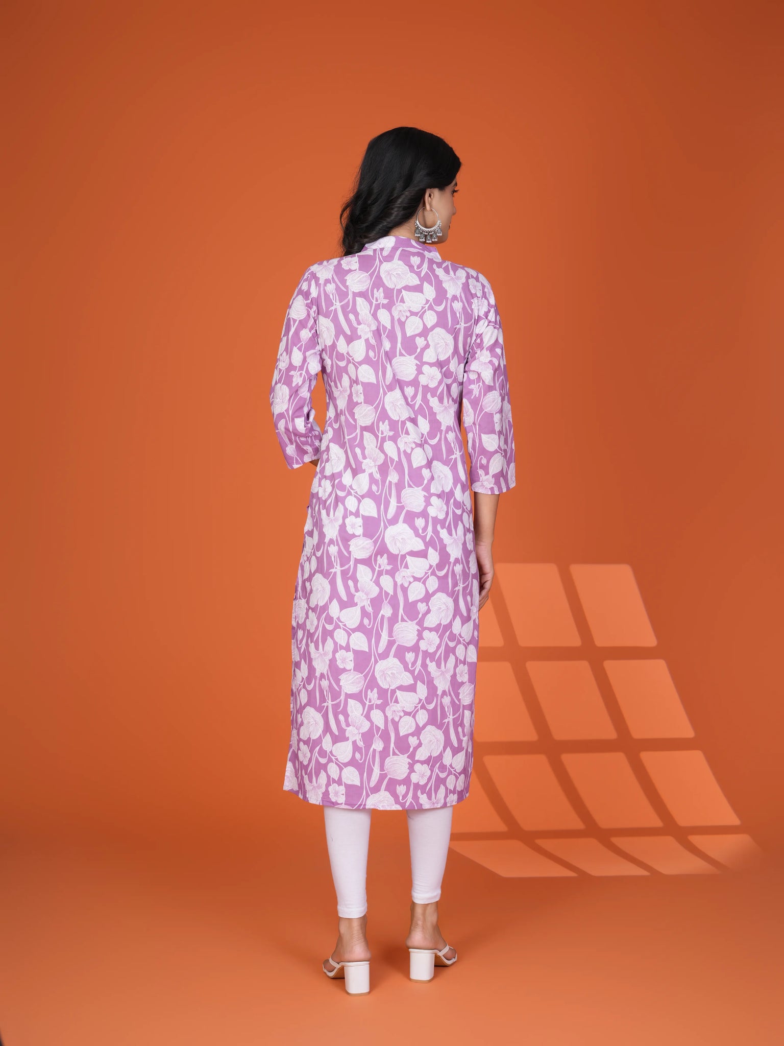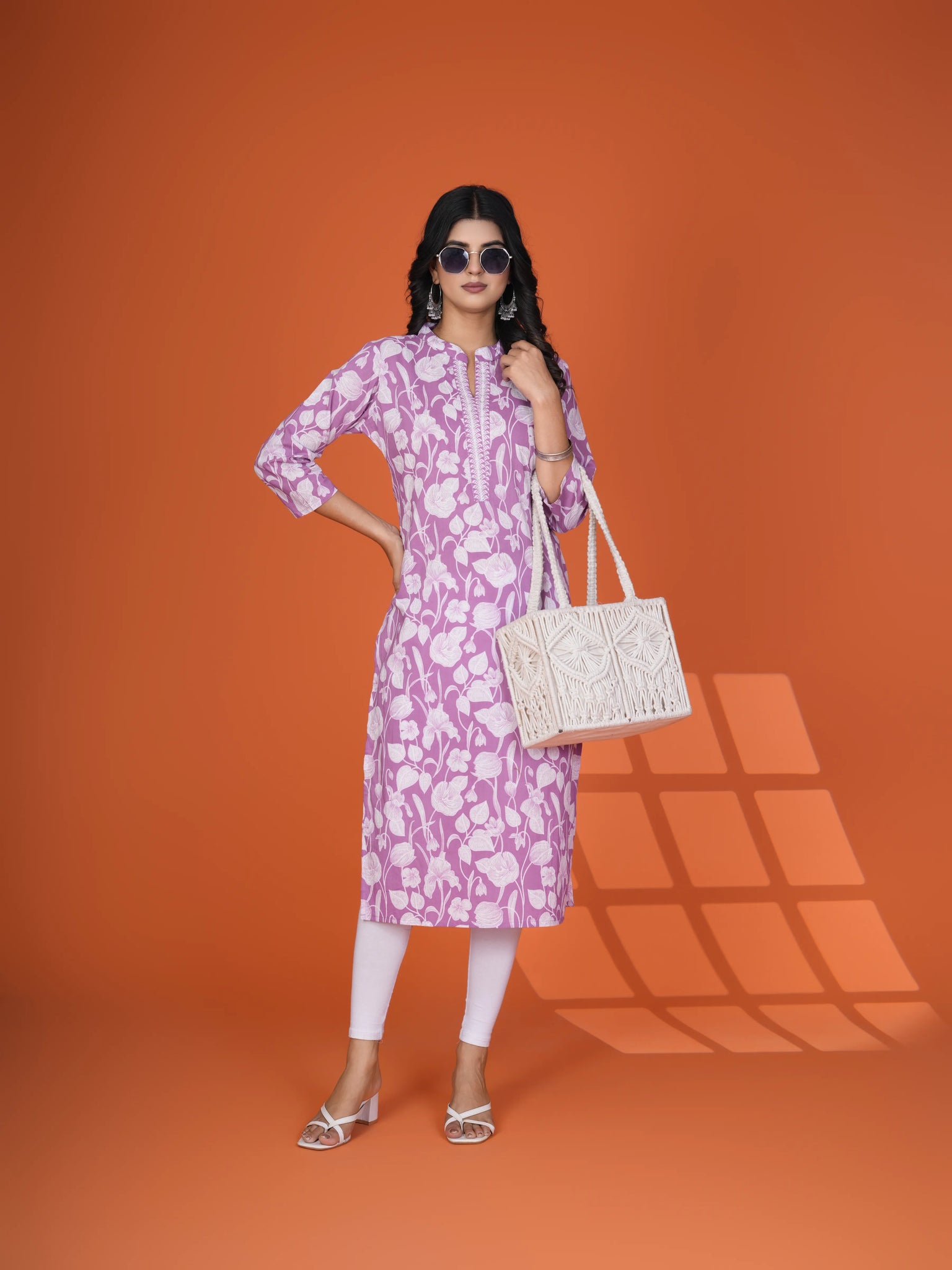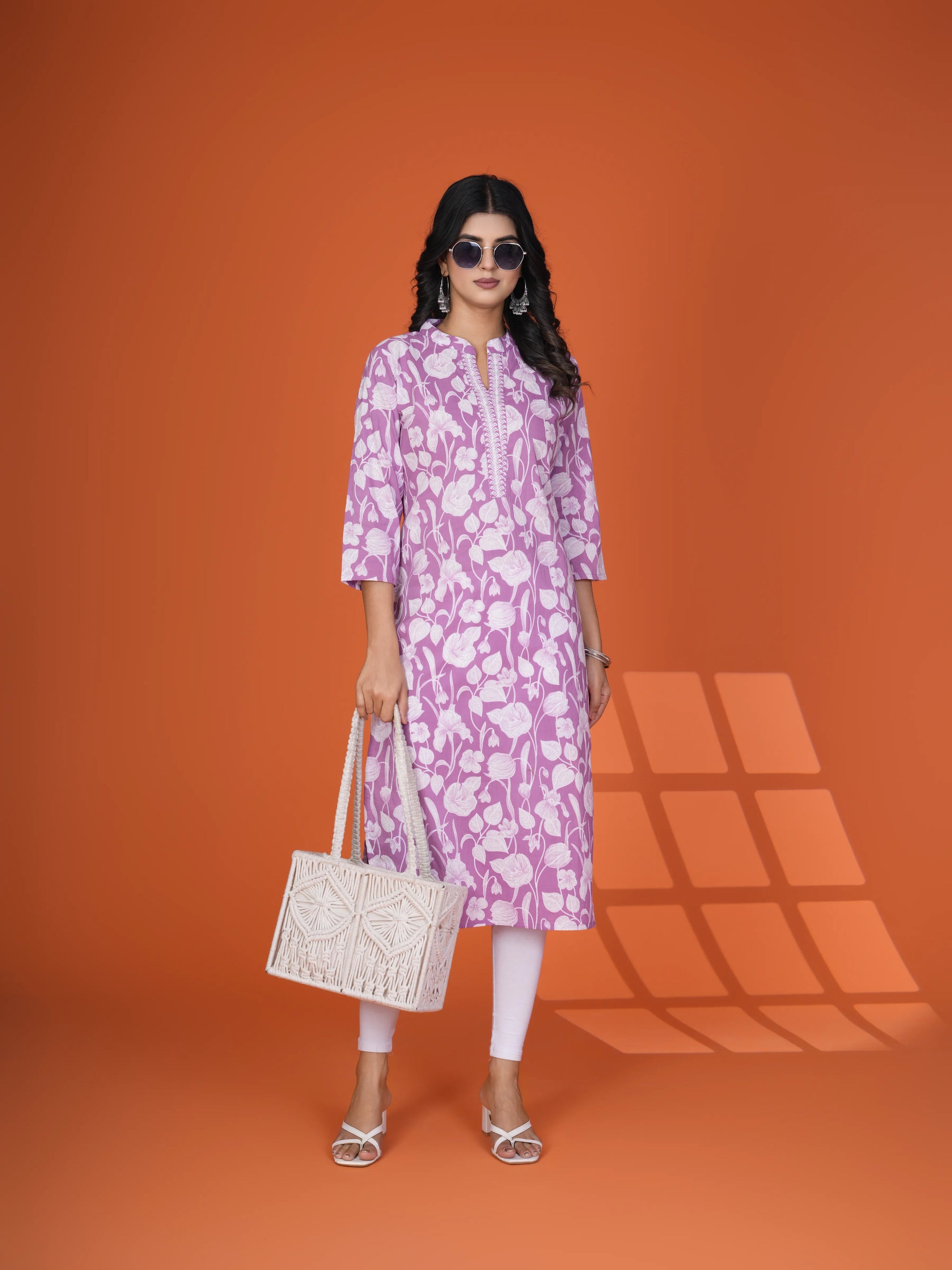 Lilac Bloom: Sequin-Embellished Floral Printed Long Kurti in Cotton Cambric