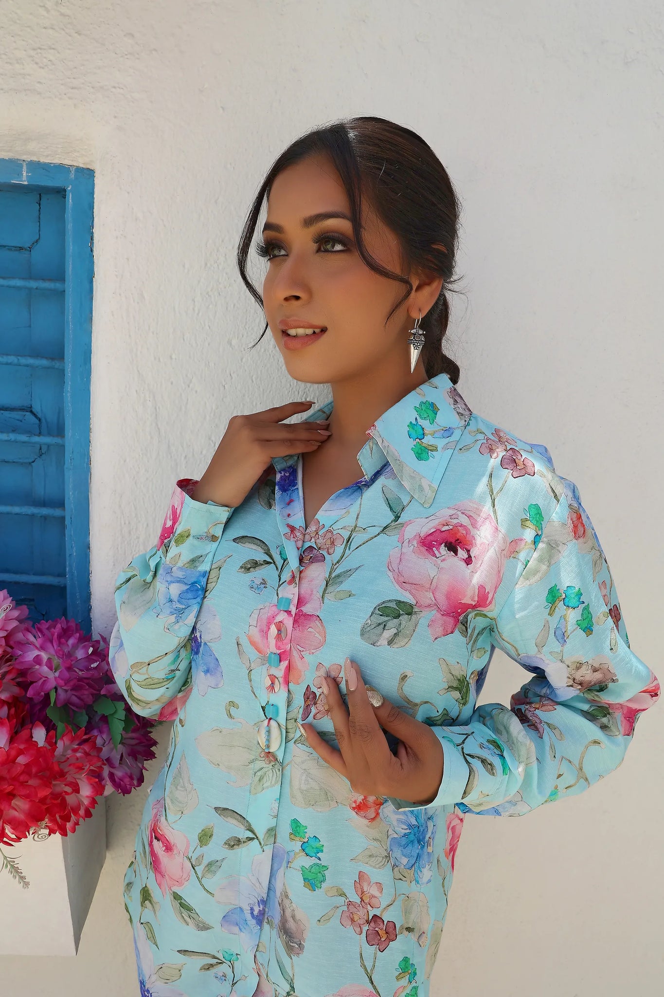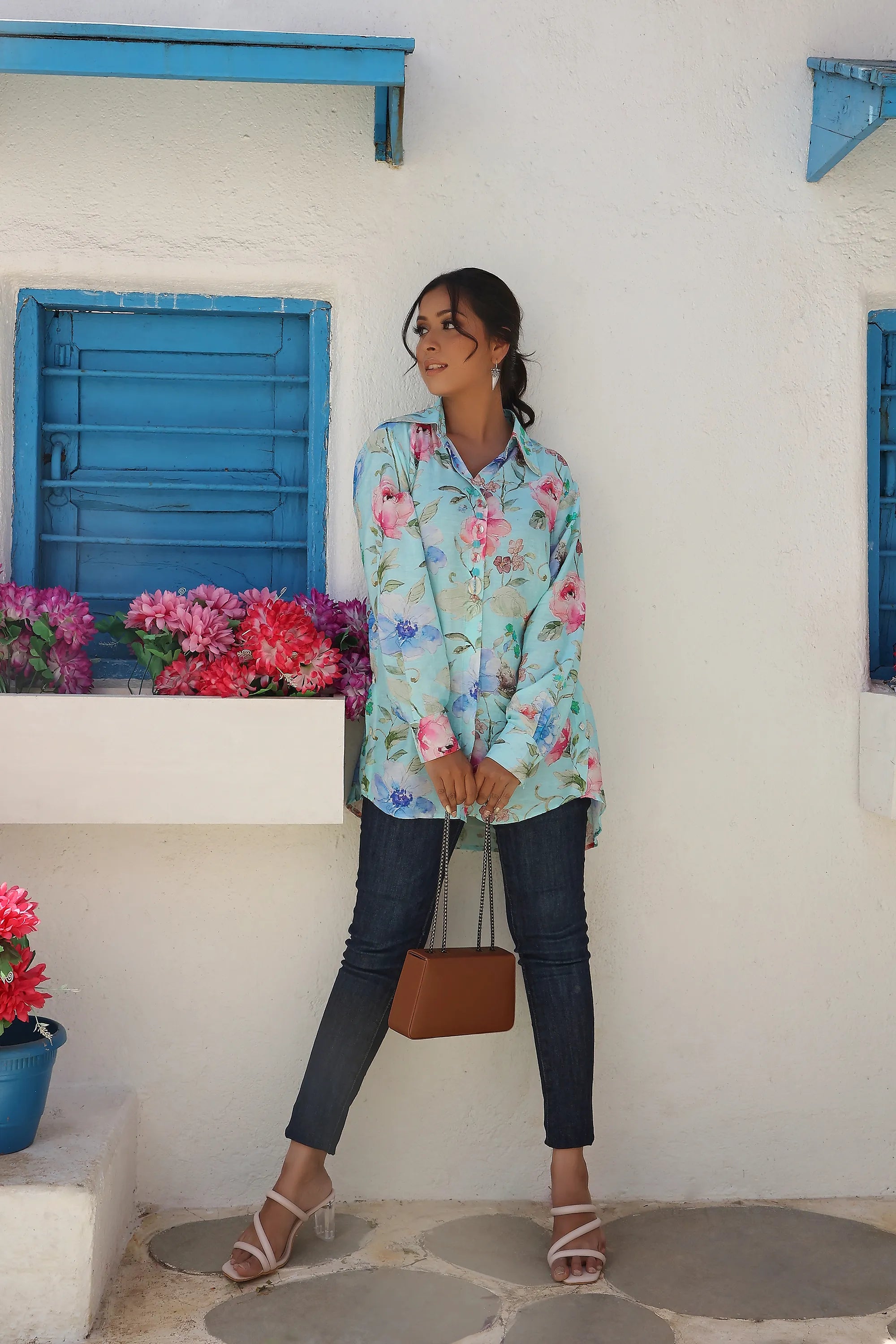 Elevate your everyday style with the Sky Blue Floral Print Shirt-Style Tunic, a perfect fusion of modern ease and timeless elegance. Designed for effortless sophistication, this tunic offers a relaxed yet polished silhouette, making it a versatile choice for casual outings and chic daywear.