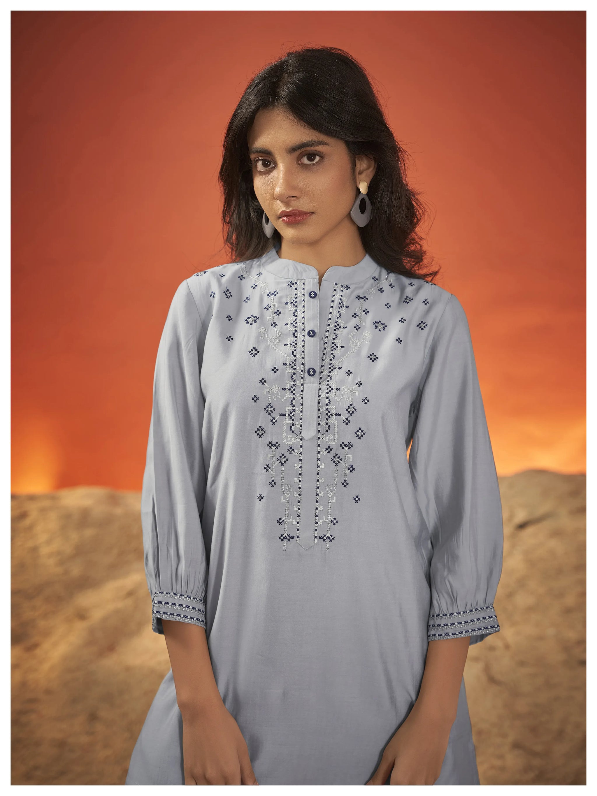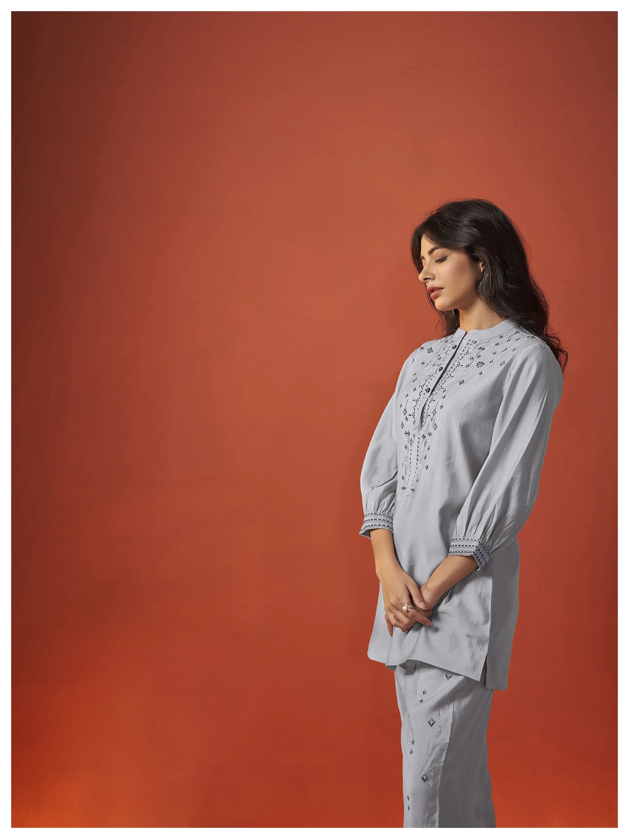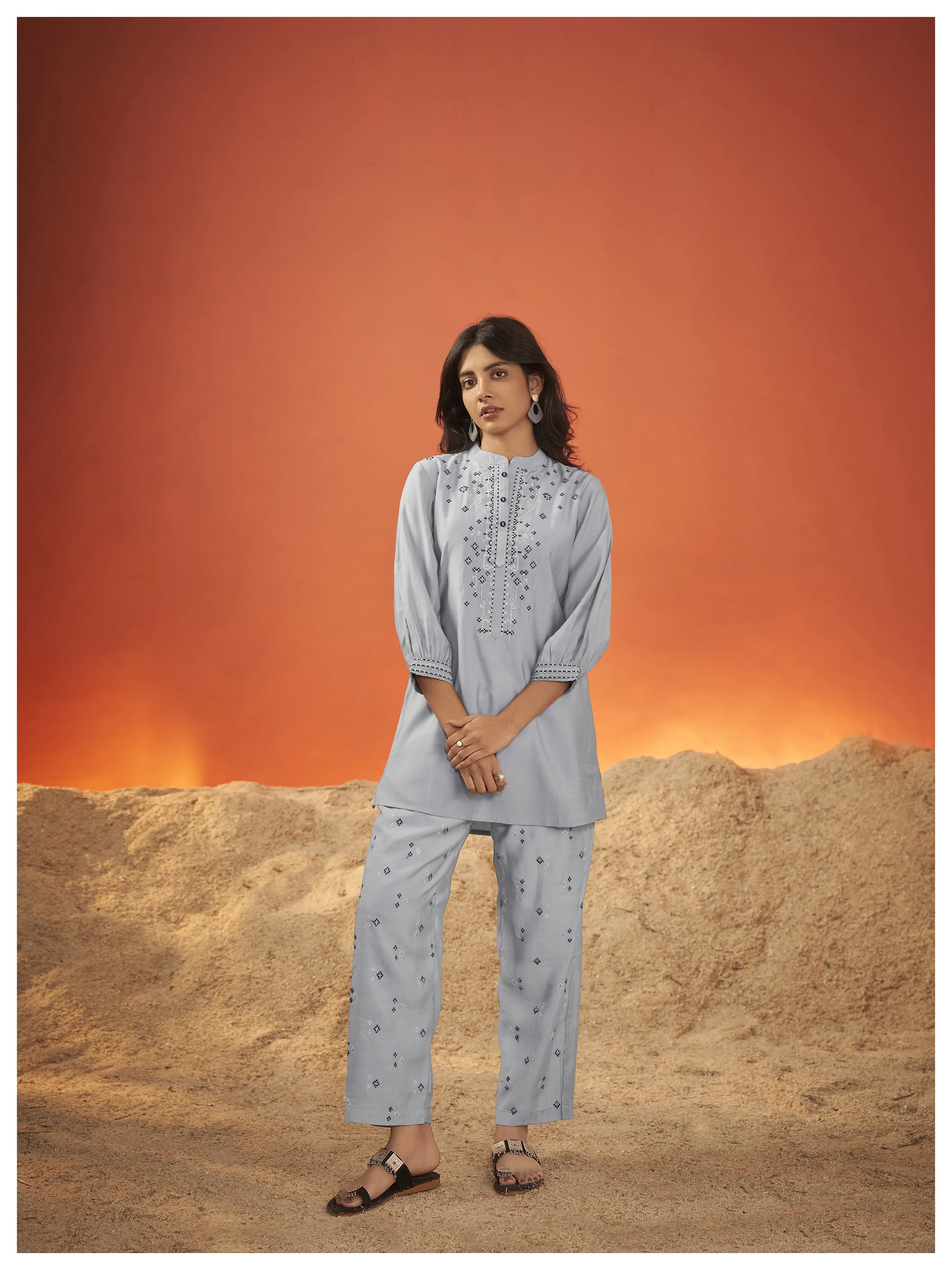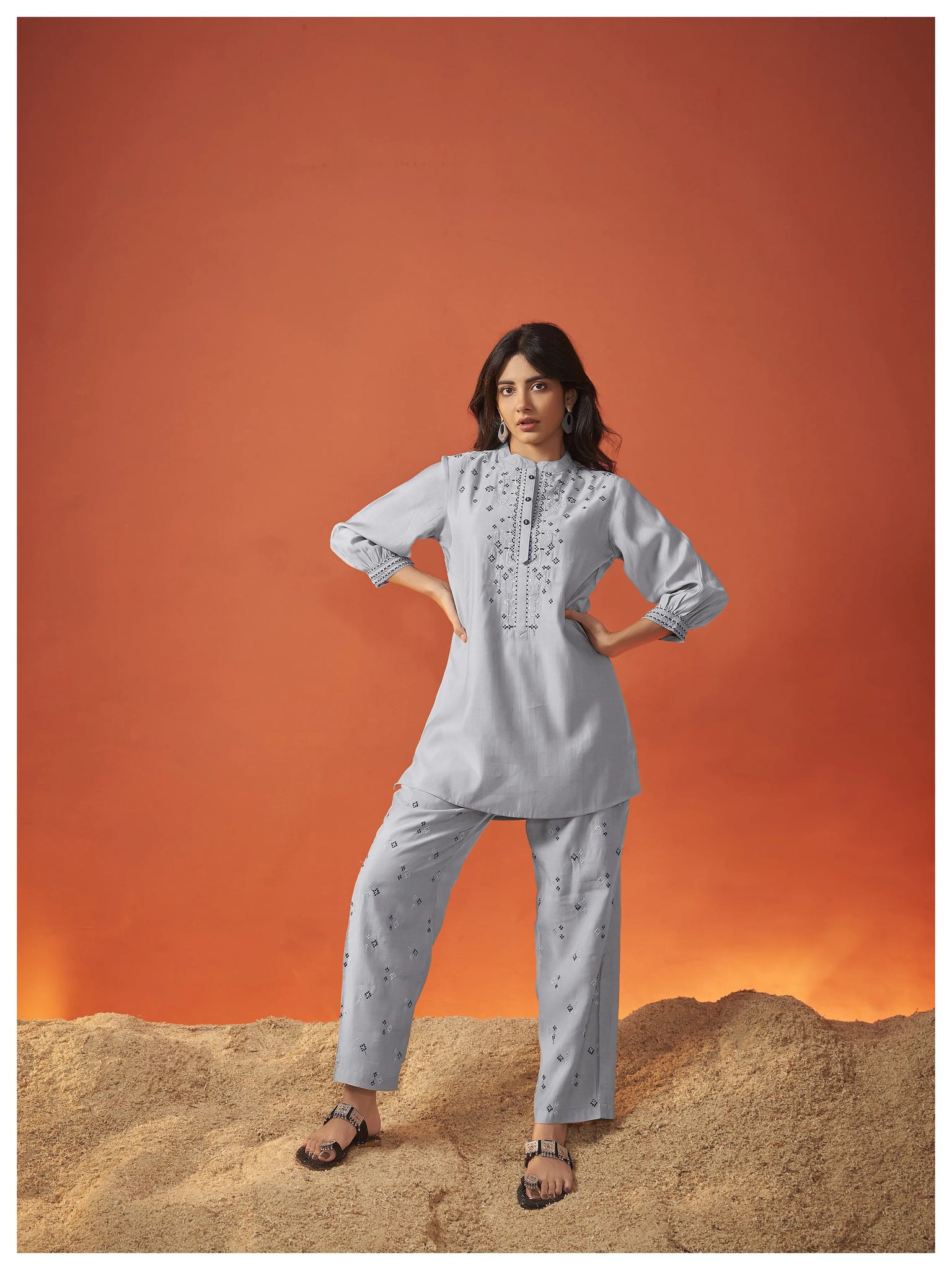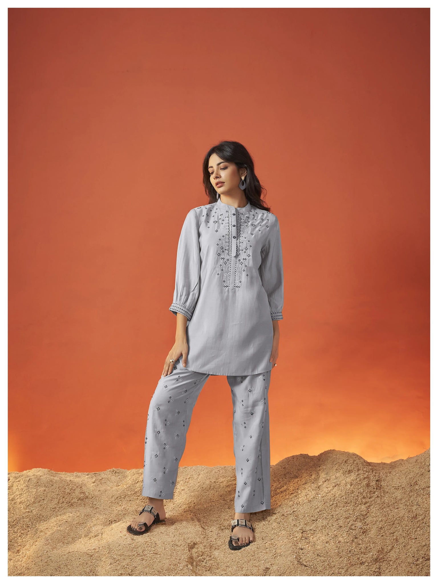 Elevate your wardrobe with this chic solid grey co-ord set, expertly crafted from soft viscose fabric. Featuring intricate embroidery on the top, this set is designed to add sophistication to your everyday look while ensuring comfort.