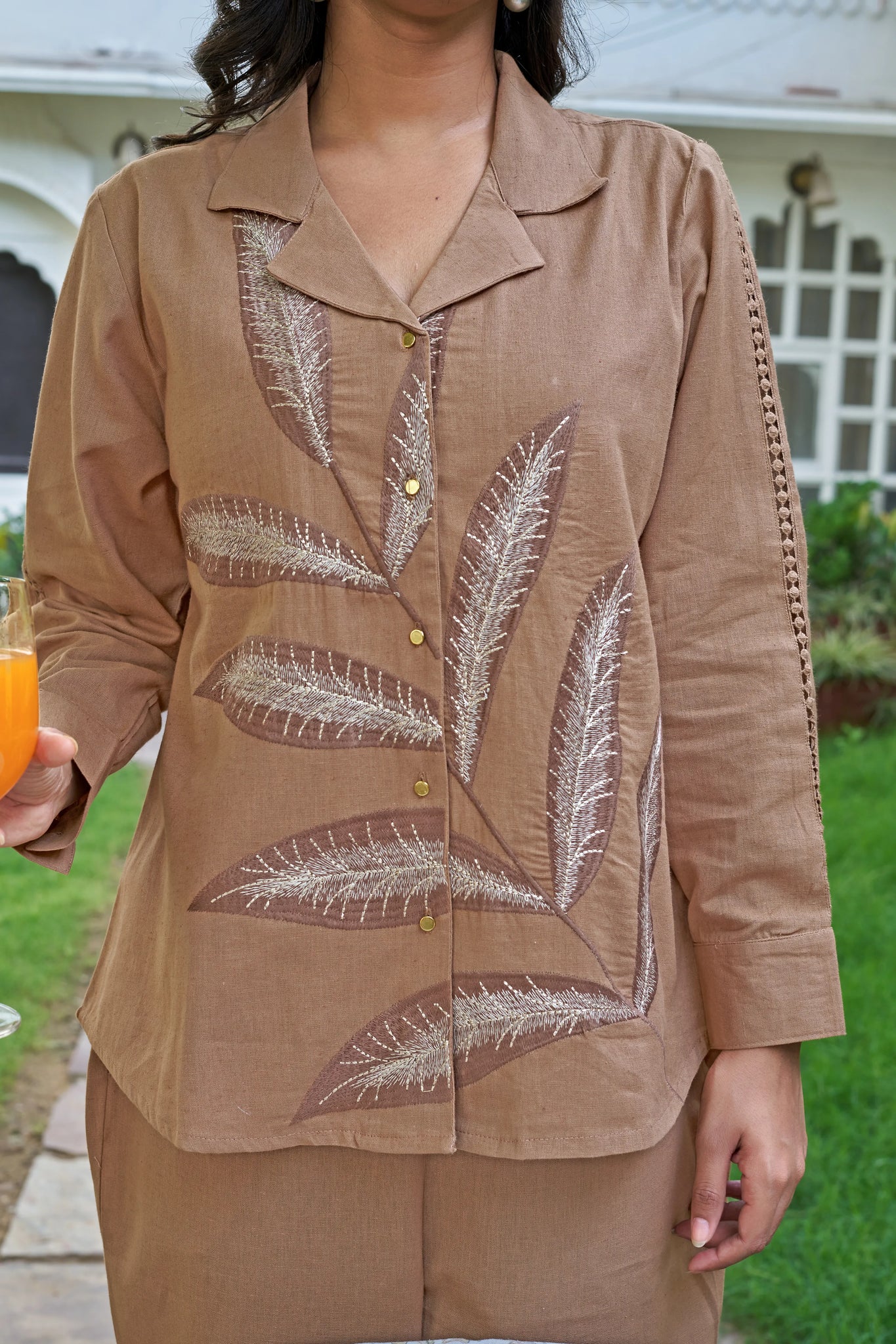 The shirt-style top features a chic notch collar, polished metal button fasteners, and full sleeves adorned with delicate lace detailing and structured cuffs. A statement big leaf embroidery cascades across the front panel, adding depth and texture to the warm tan base.
