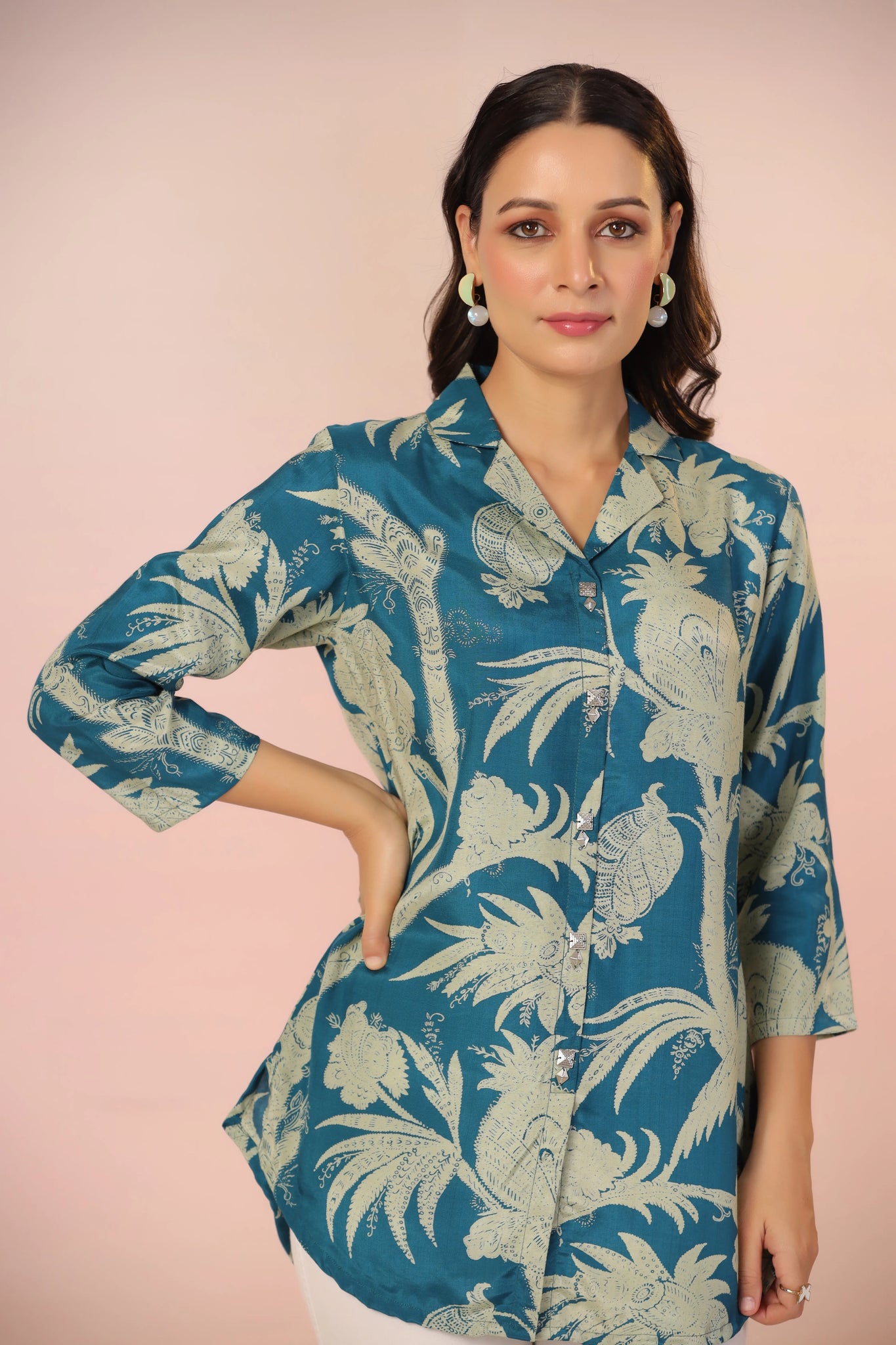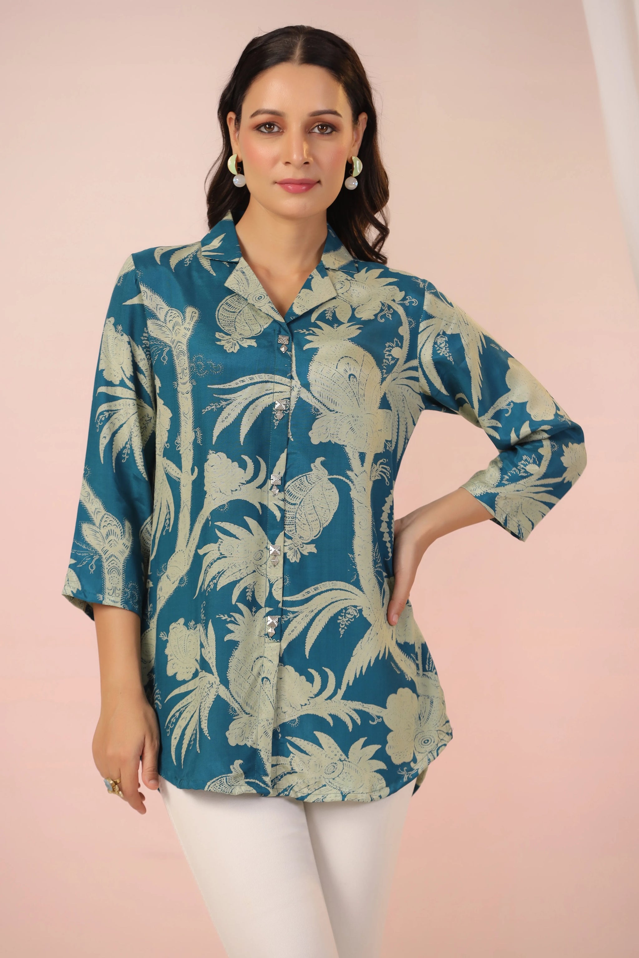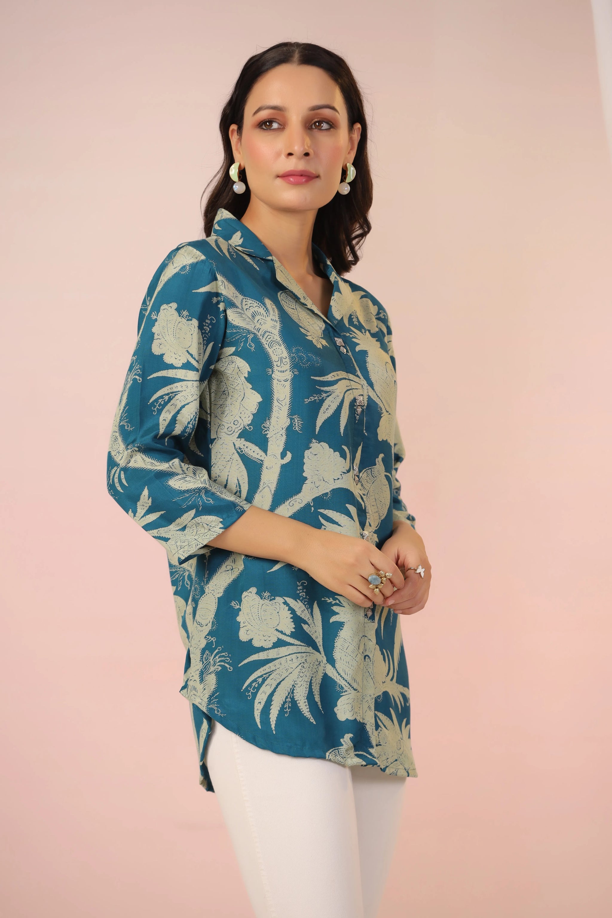 Infuse elegance and charm into your wardrobe with this stunning teal blue tunic, designed to make a bold statement. Featuring a captivating abstract floral print, this piece blends contemporary style with timeless sophistication. The lapel collar and regular-fit curved hem create a polished silhouette, while the ruched 3/4th sleeves add a refined, feminine touch.