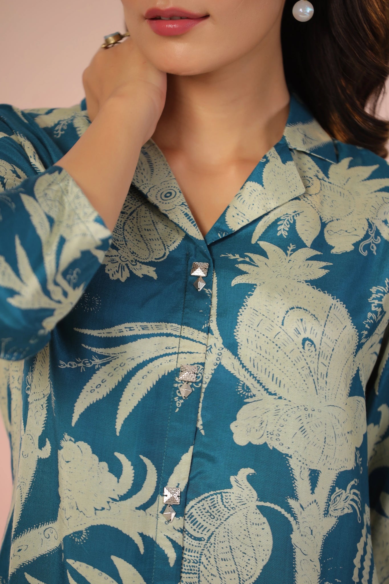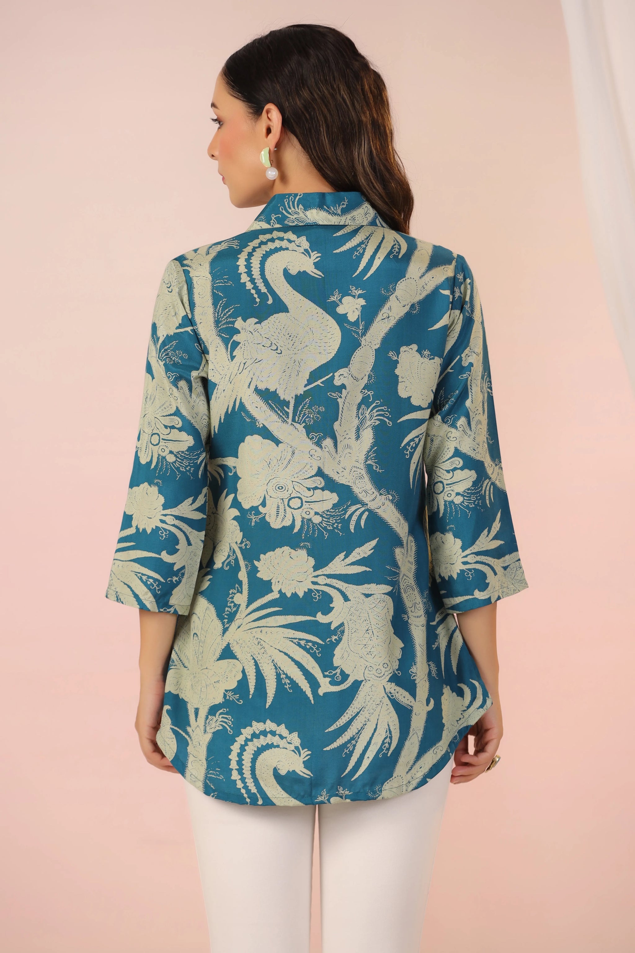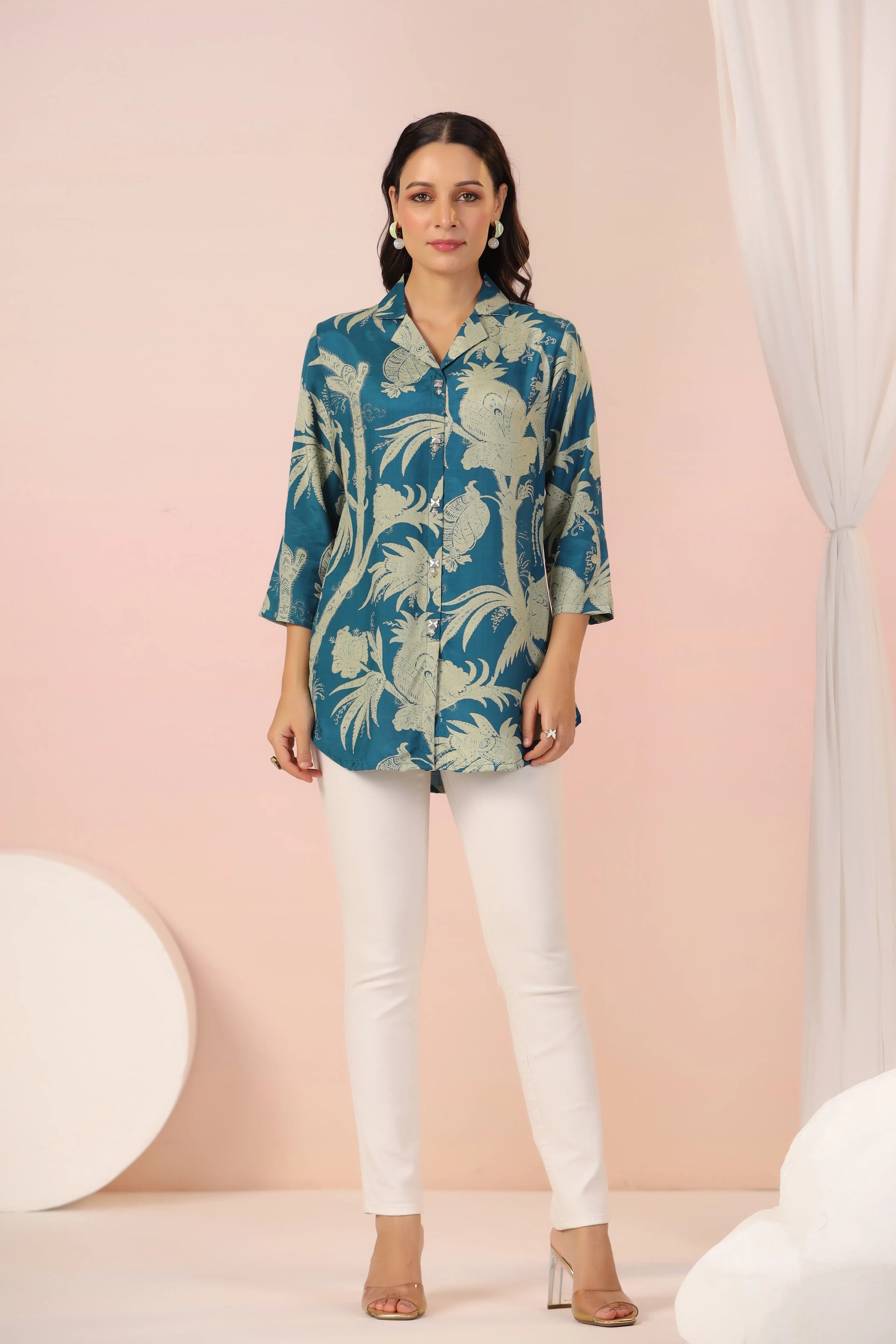 Infuse elegance and charm into your wardrobe with this stunning teal blue tunic, designed to make a bold statement. Featuring a captivating abstract floral print, this piece blends contemporary style with timeless sophistication. The lapel collar and regular-fit curved hem create a polished silhouette, while the ruched 3/4th sleeves add a refined, feminine touch.