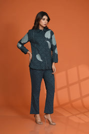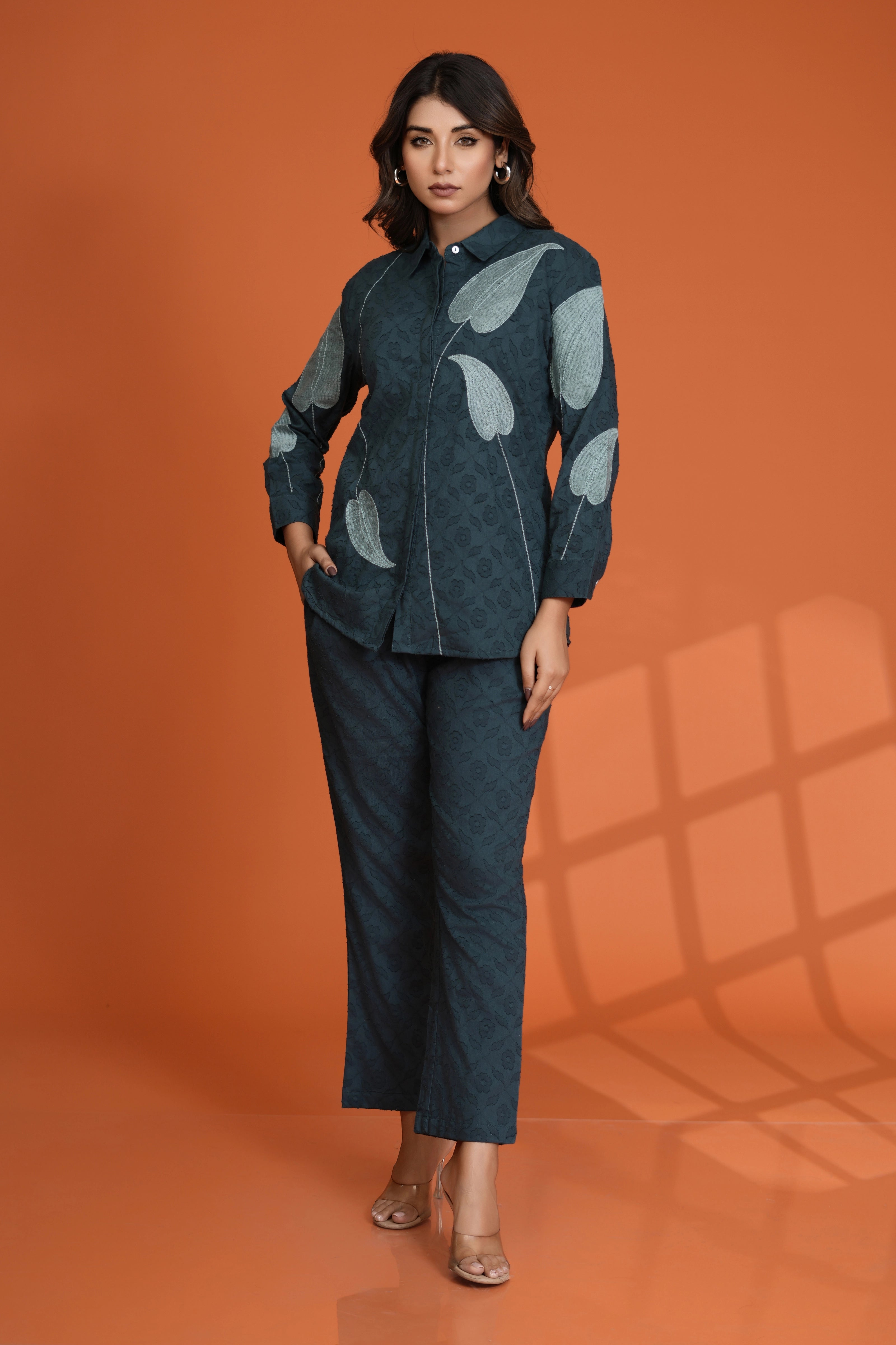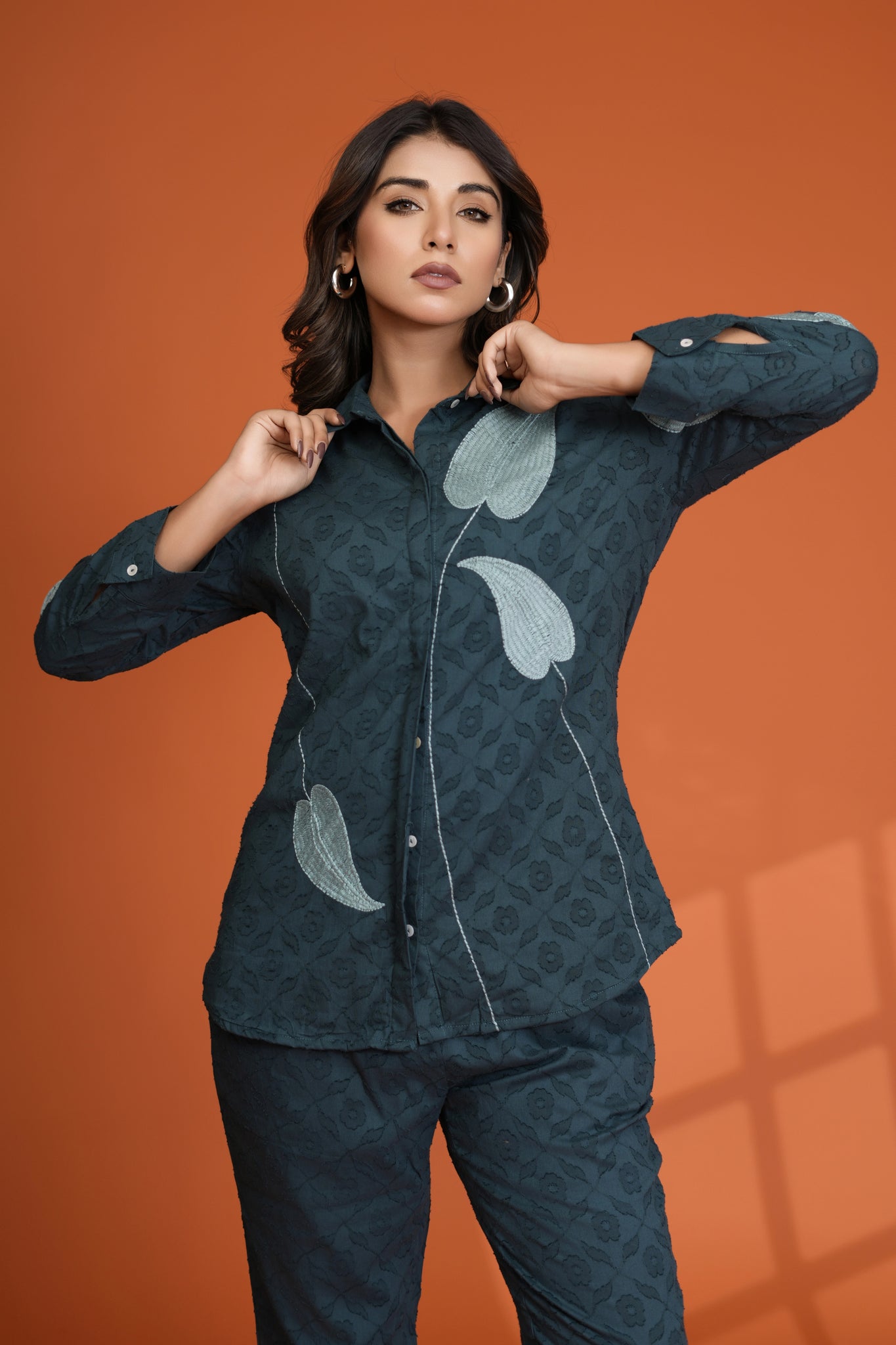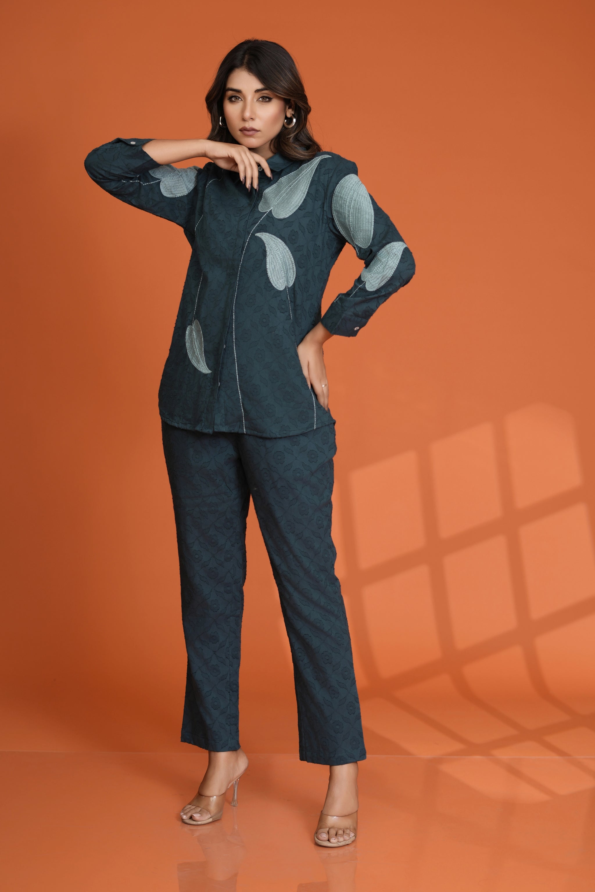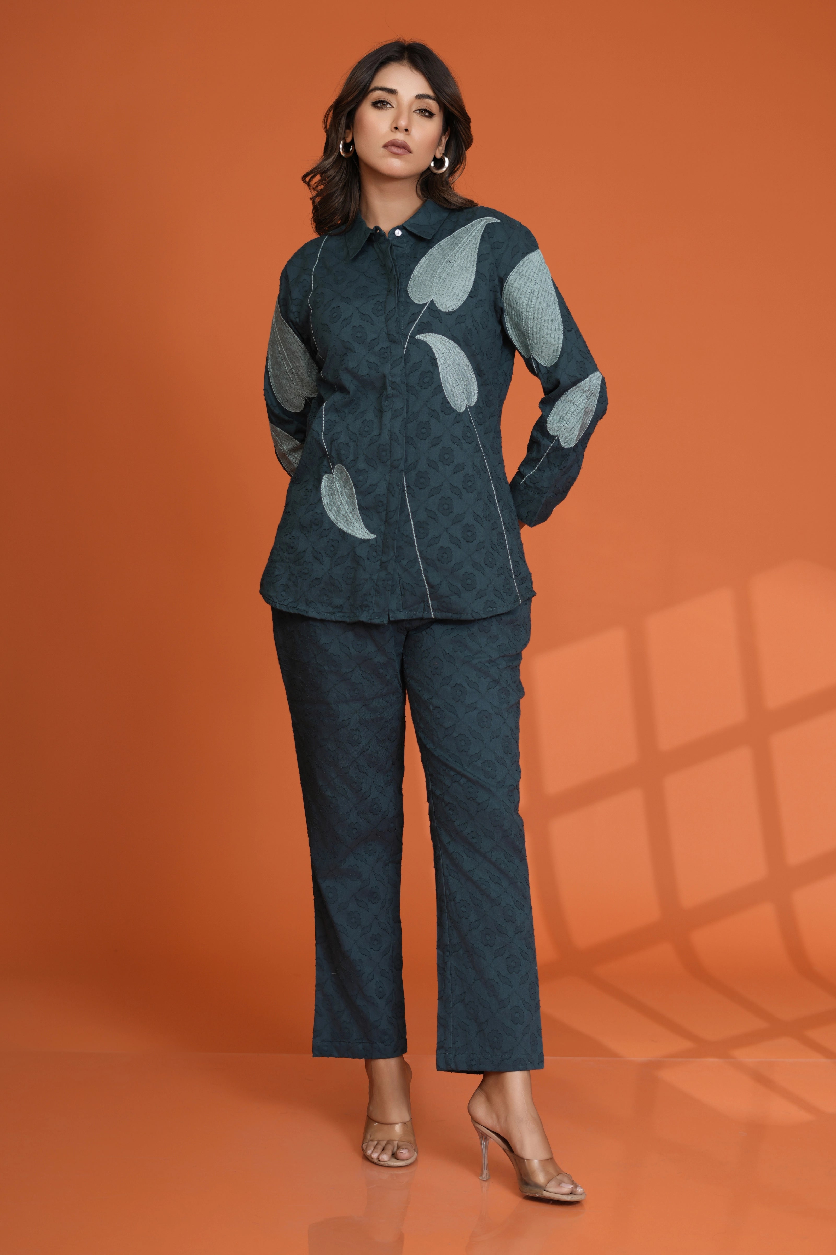 Redefine sophistication with this Teal Green Co-Ord Set, crafted to offer both style and comfort. The concealed placket button-front top features a delicate floral burnout pattern with leaf embroidery, adding an ethereal charm to the ensemble. Complemented by full sleeves for a refined touch, this outfit blends elegance with effortless wearability.