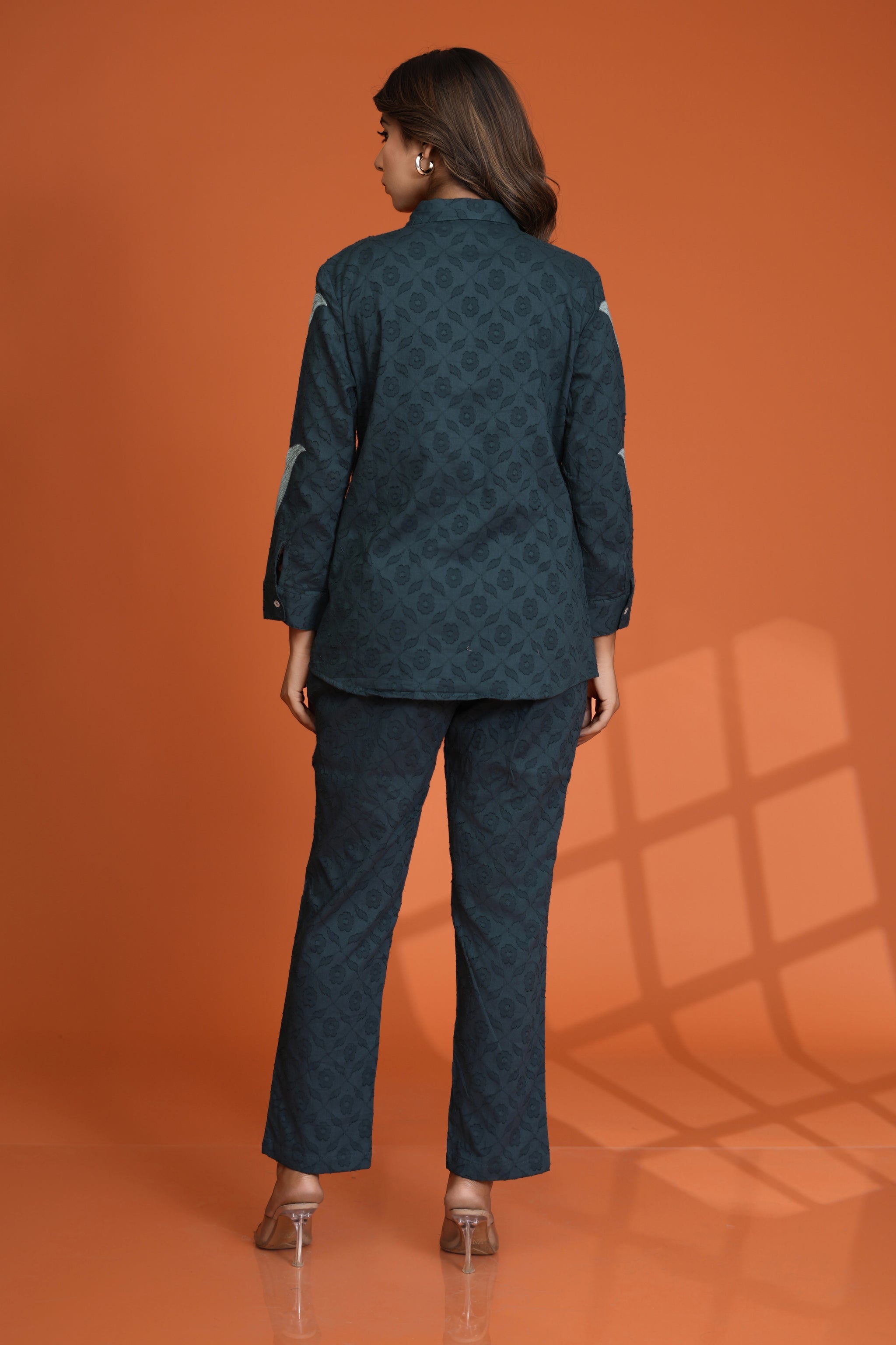 Timeless Elegance: Teal Green Floral Burnout Embroidered Co-Ord Set in Cotton