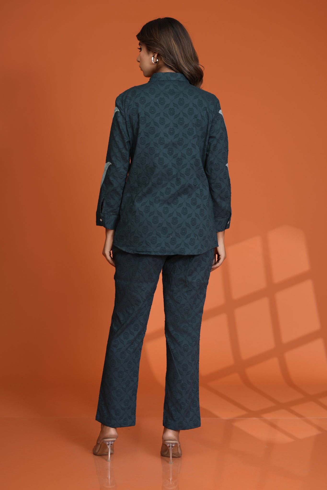 Teal Green Floral Burnout Embroidered Co-Ord Set in Cotton