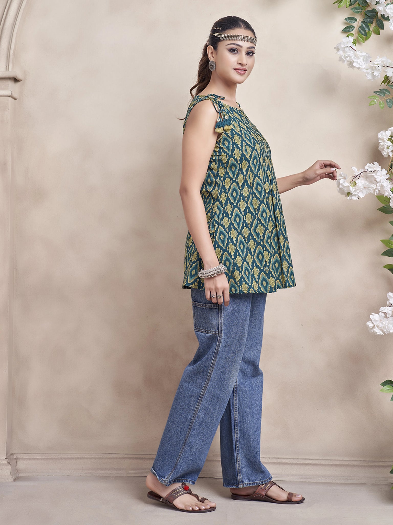 Step into effortless chic with this lighter teal green short kurti, adorned with geometric diamond-shaped Ikat prints in yellow. Designed in breathable cotton cambric, it features a blanket-stitched round neck, sleeveless cut, and playful drawstring tassel details on the shoulders—perfect for a relaxed yet stylish Indo-boho vibe.