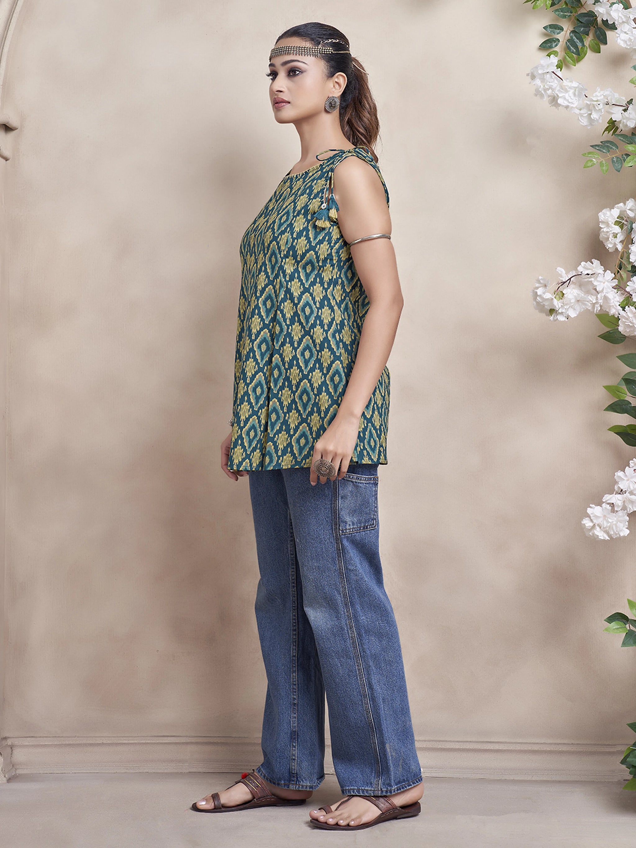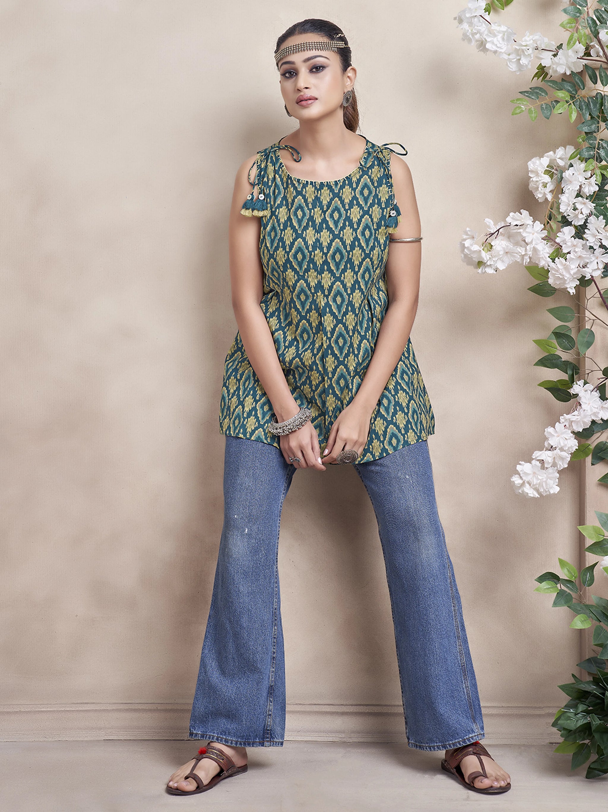 Teal Green Ikat Printed Cotton Cambric Short Kurti