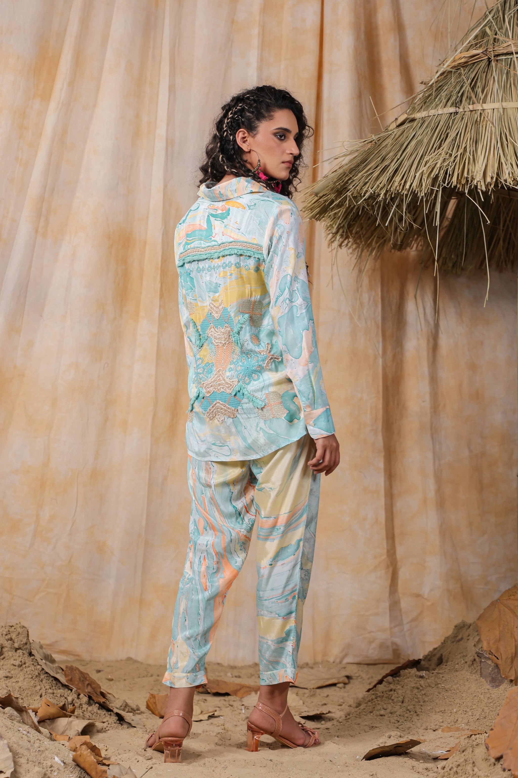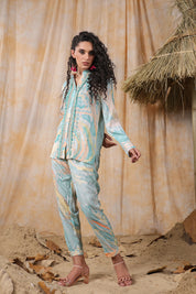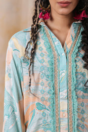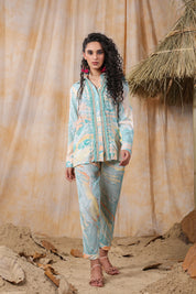Add a touch of charm to your wardrobe with the Turquoise Color Embroidered Muslin Co-Ord Set. This exquisite set features intricate marble print embroidery, bringing a fresh and artistic flair to your daywear. The collar is adorned with tassel details at the front, adding a playful yet sophisticated touch.