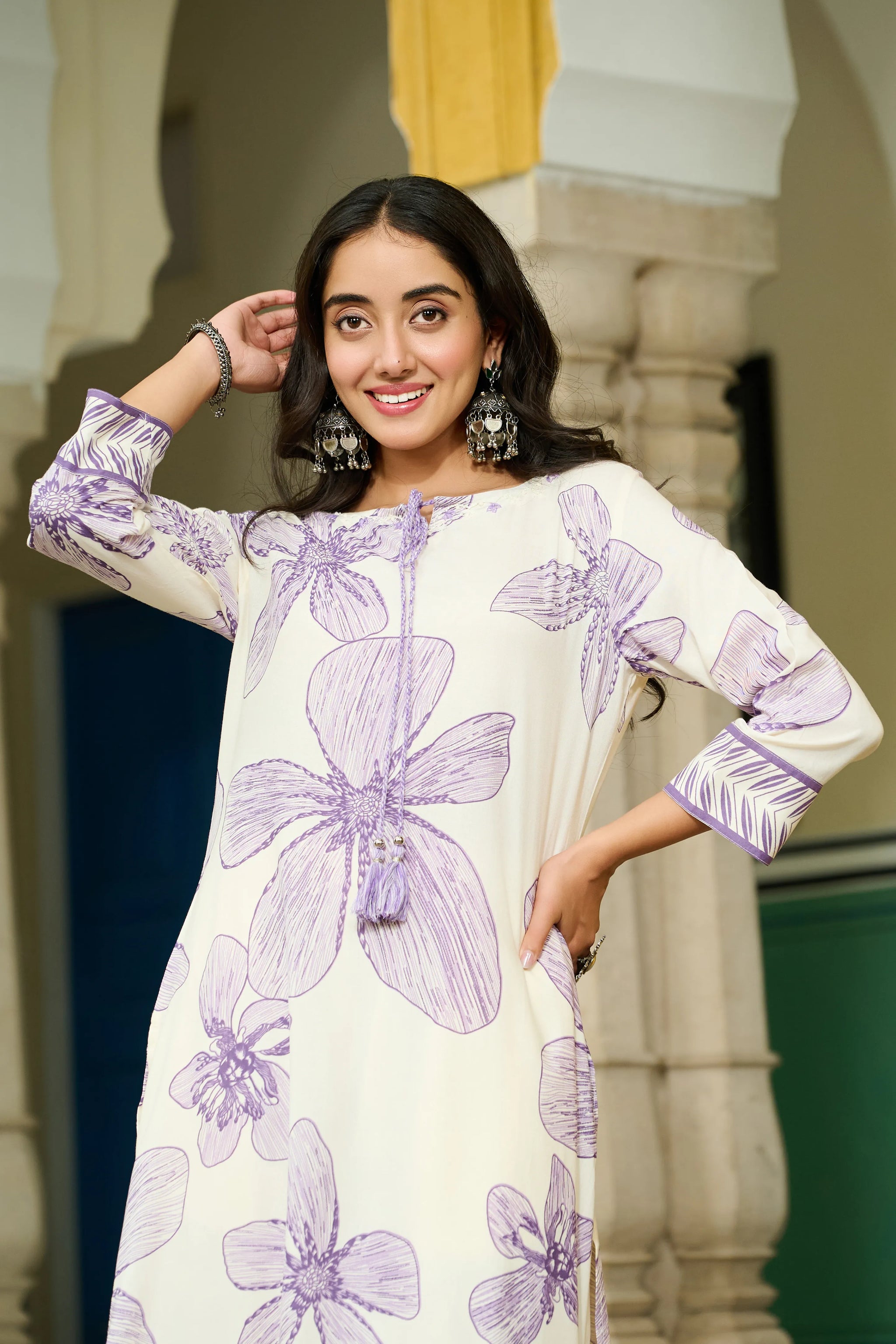 Fresh, graceful, and versatile — the Lavender Bloom Kurta Set is a soft take on bold style. Crafted from luxuriously smooth rayon, the lilac-hued long kurta features an allover bold floral print accented with a round neckline highlighted by an embroidered leaf motif and cord tassel ties. 3/4th sleeves, a border print hemline, and crochet lace trims elevate its elegance. The set is paired with solid cream wide-leg pants with two side pockets for ease and comfort.
