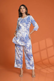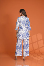 White & Blue Tree & Bird Motif Printed Cotton Cambric Co-Ord Set