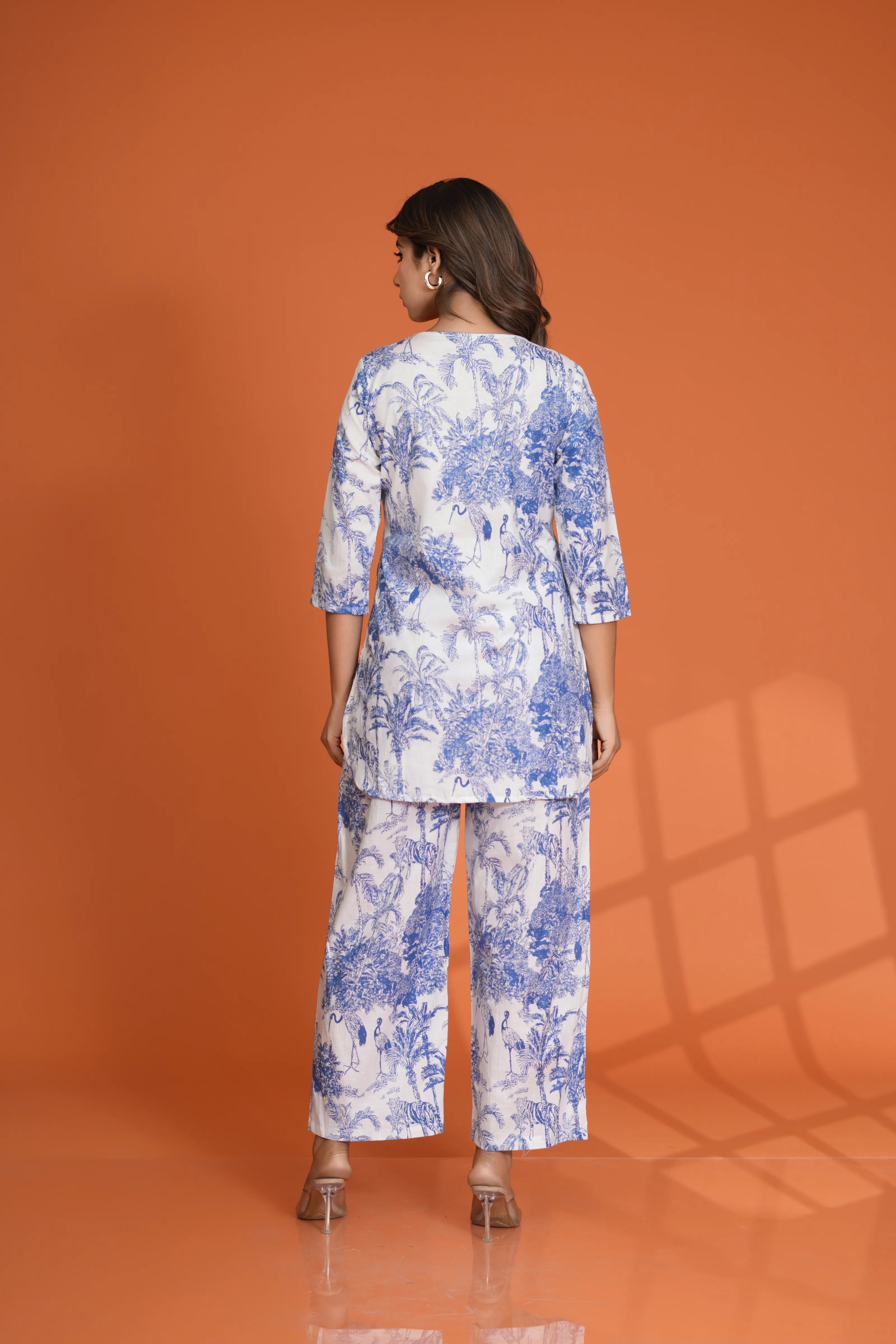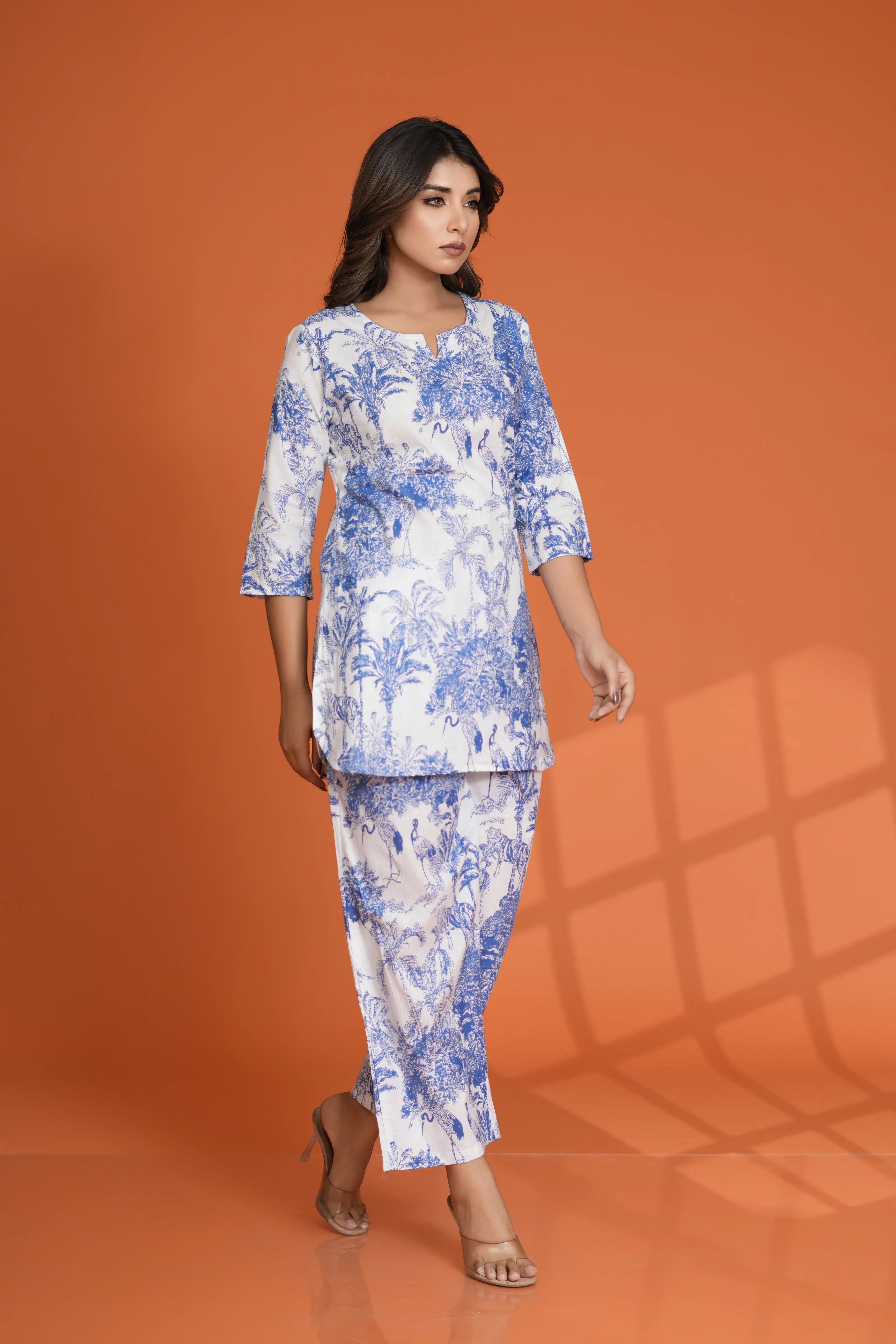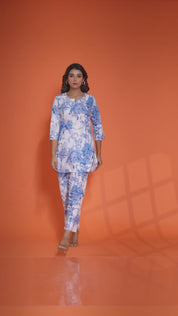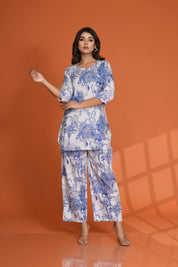 Step into a world of charm with this White Base Co-Ord Set featuring striking blue bold tree and bird motifs. Designed in soft, breathable cotton cambric, the set includes a round neck top with 3/4th sleeves and coordinated bottoms — combining comfort with artistic flair.