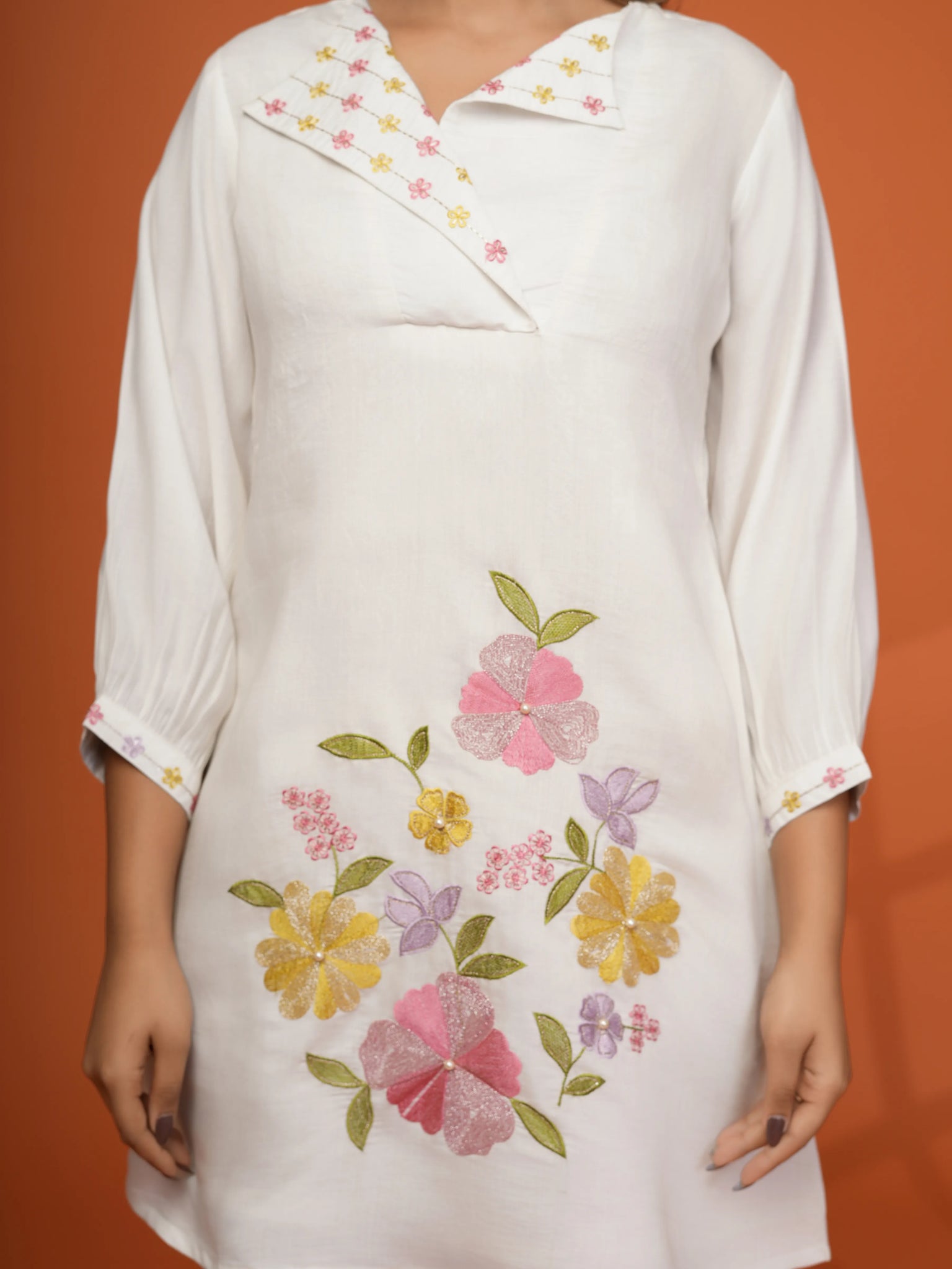 • Color: Classic white base with multicolor floral embroidery in pink, yellow, lilac, and green