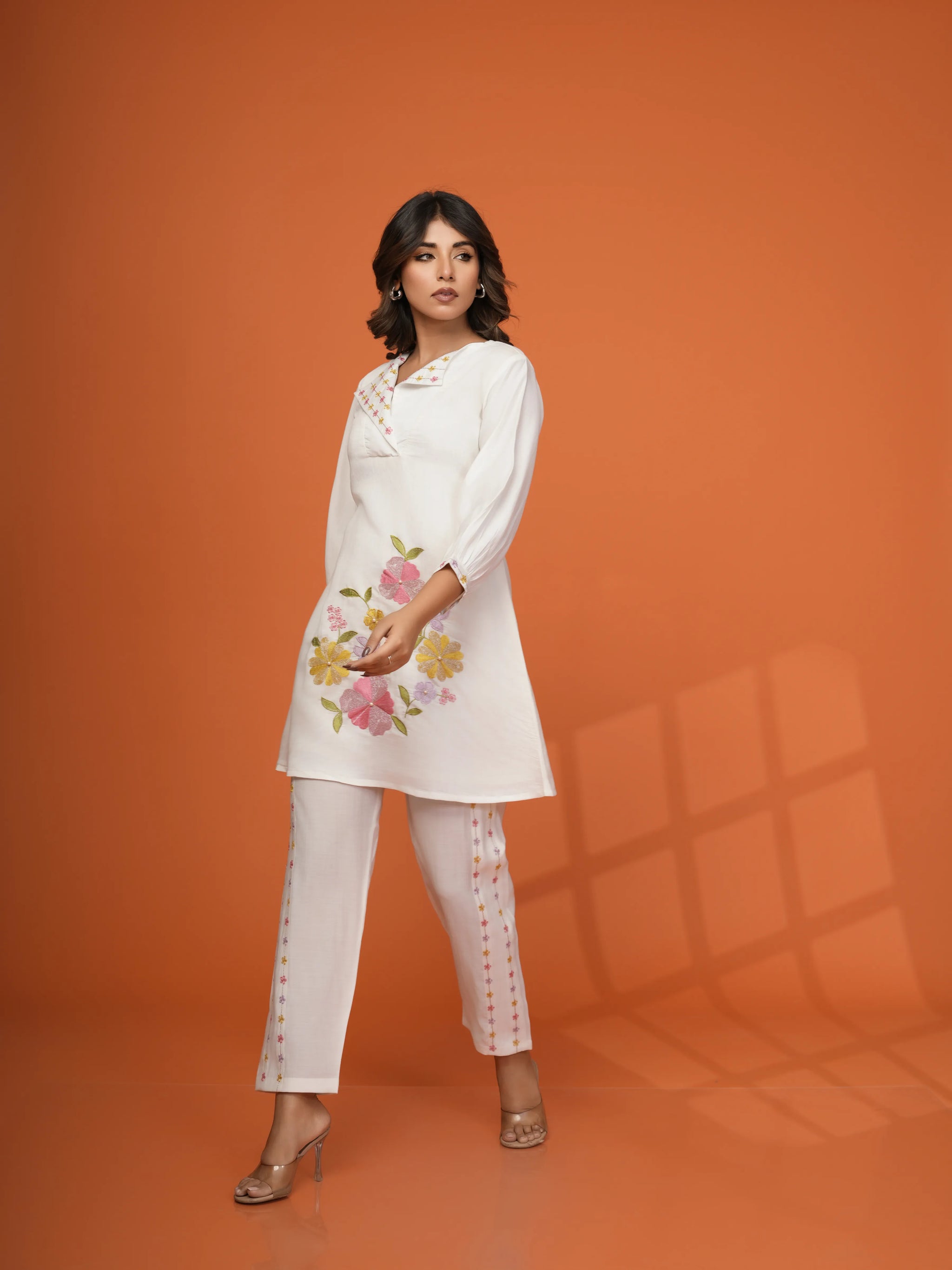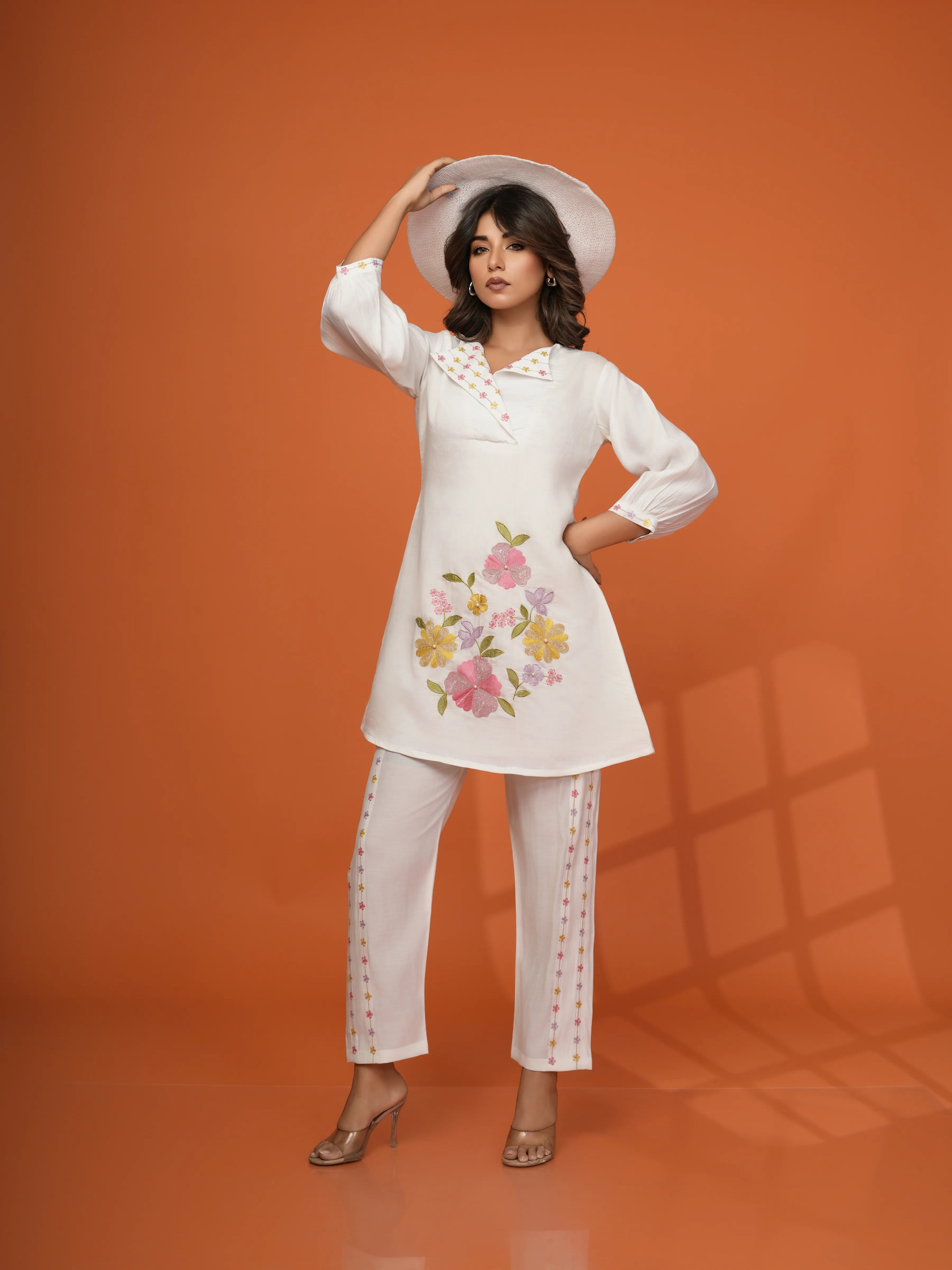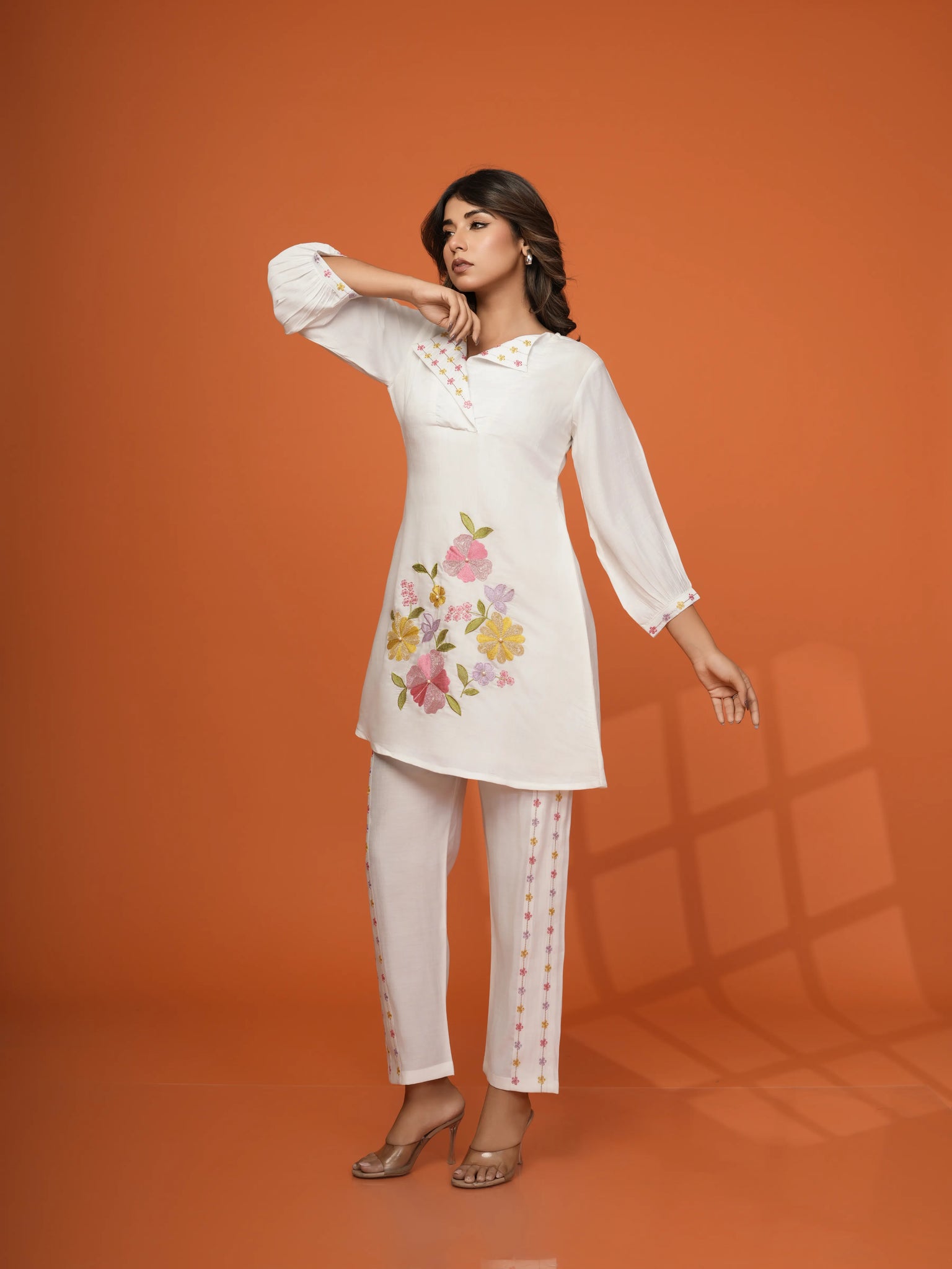 White Multicolor Floral Embroidered Co-ord Set in Roman Fabric