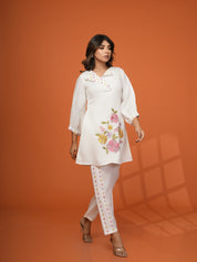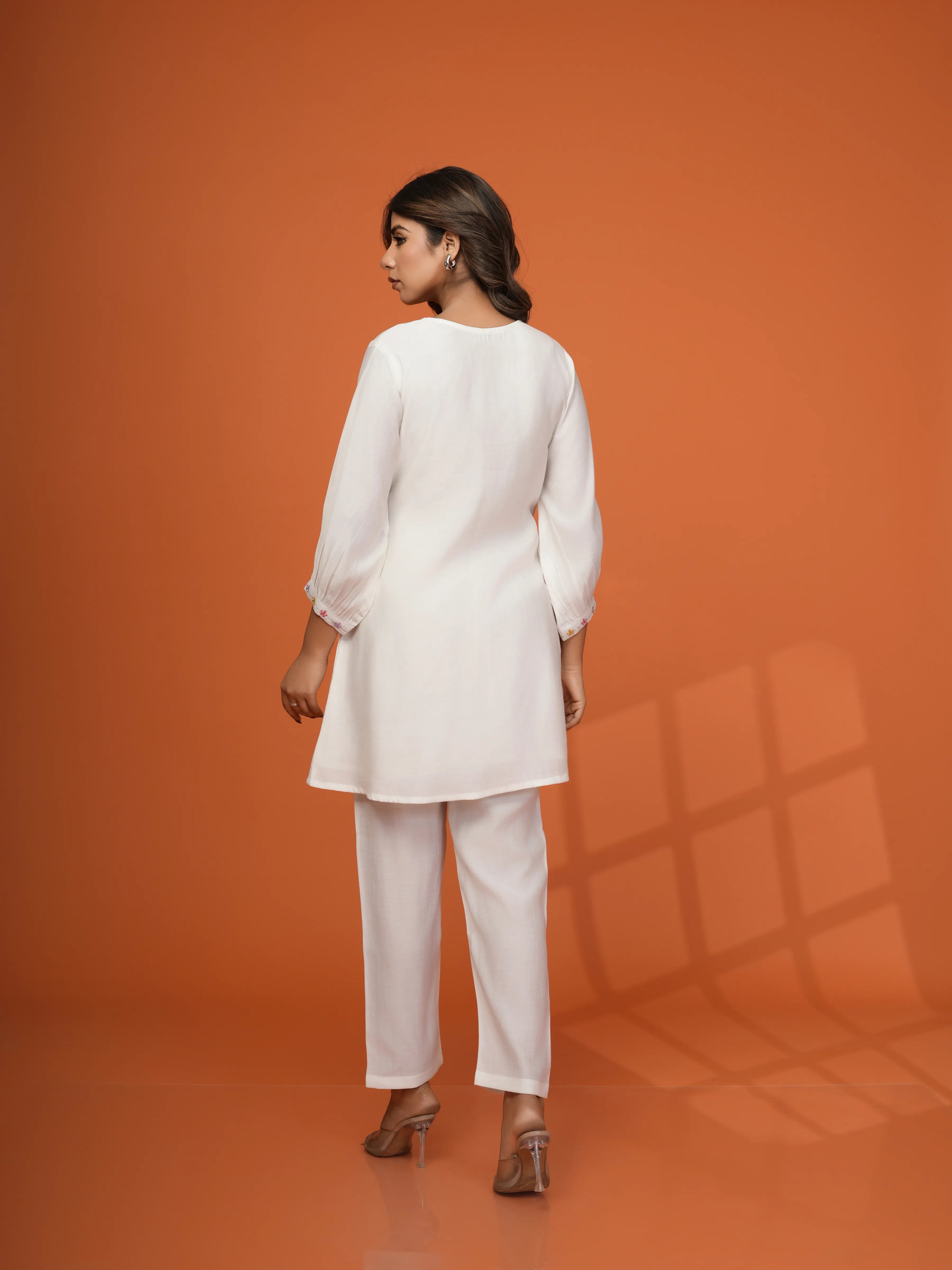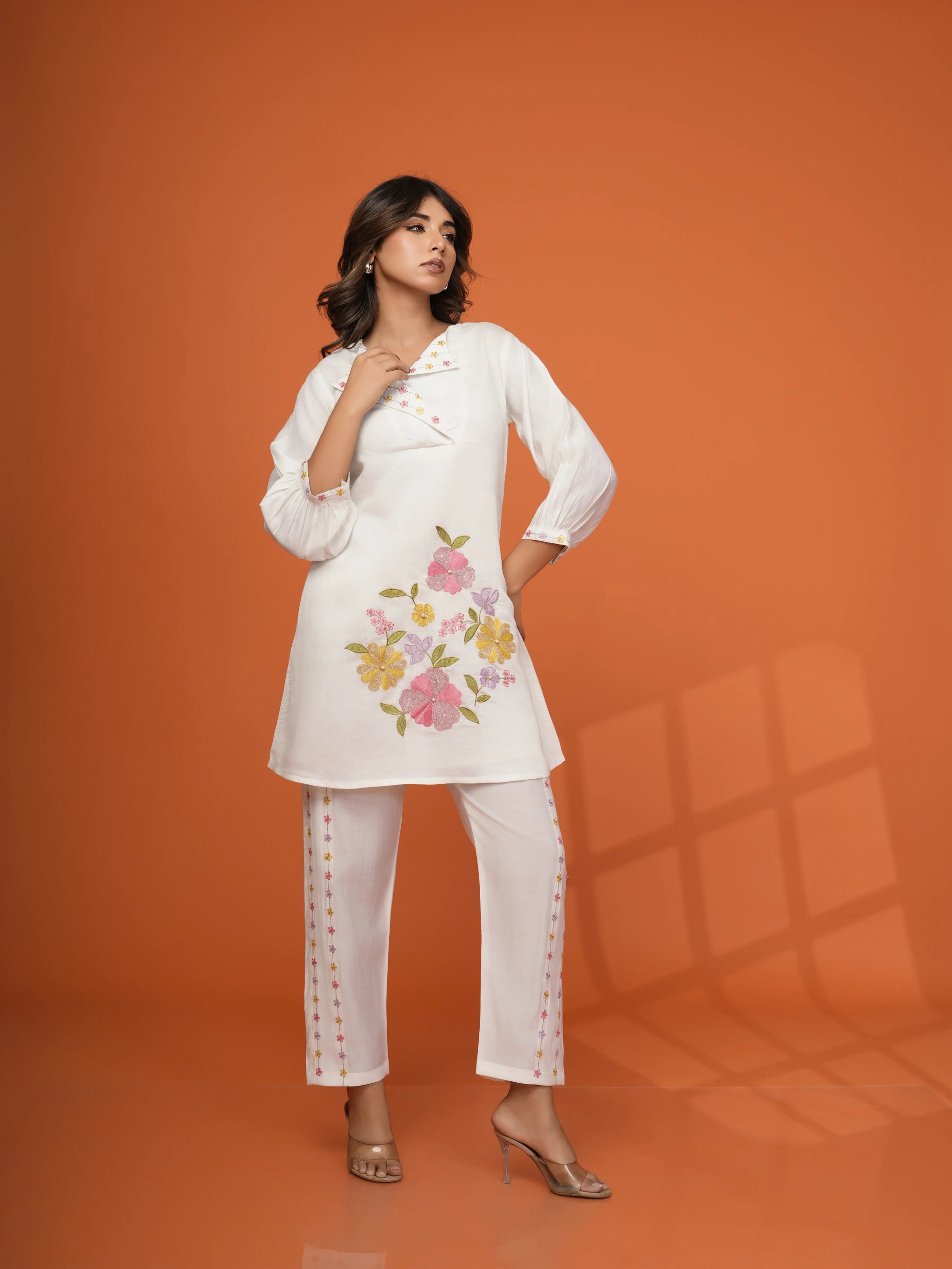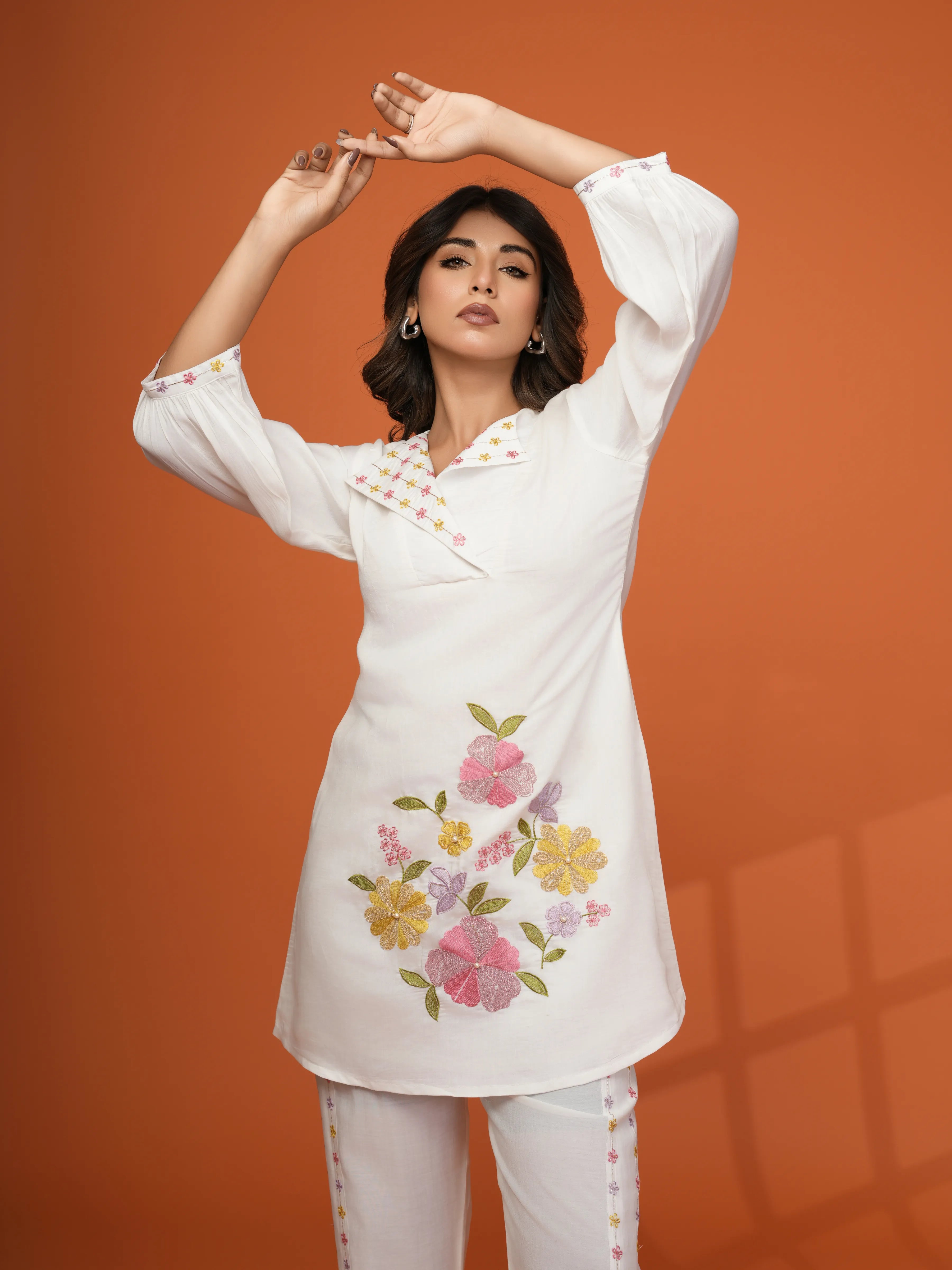 White Multicolor Floral Embroidered Co-ord Set in Roman Fabric