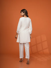 Bask in the bloom of spring year-round with this pristine white co-ord set, blooming with delicate multicolor floral embroidery. Crafted in soft and breathable Roman fabric, the set combines comfort with artisanal beauty—making it perfect for elegant daywear and intimate celebrations alike.