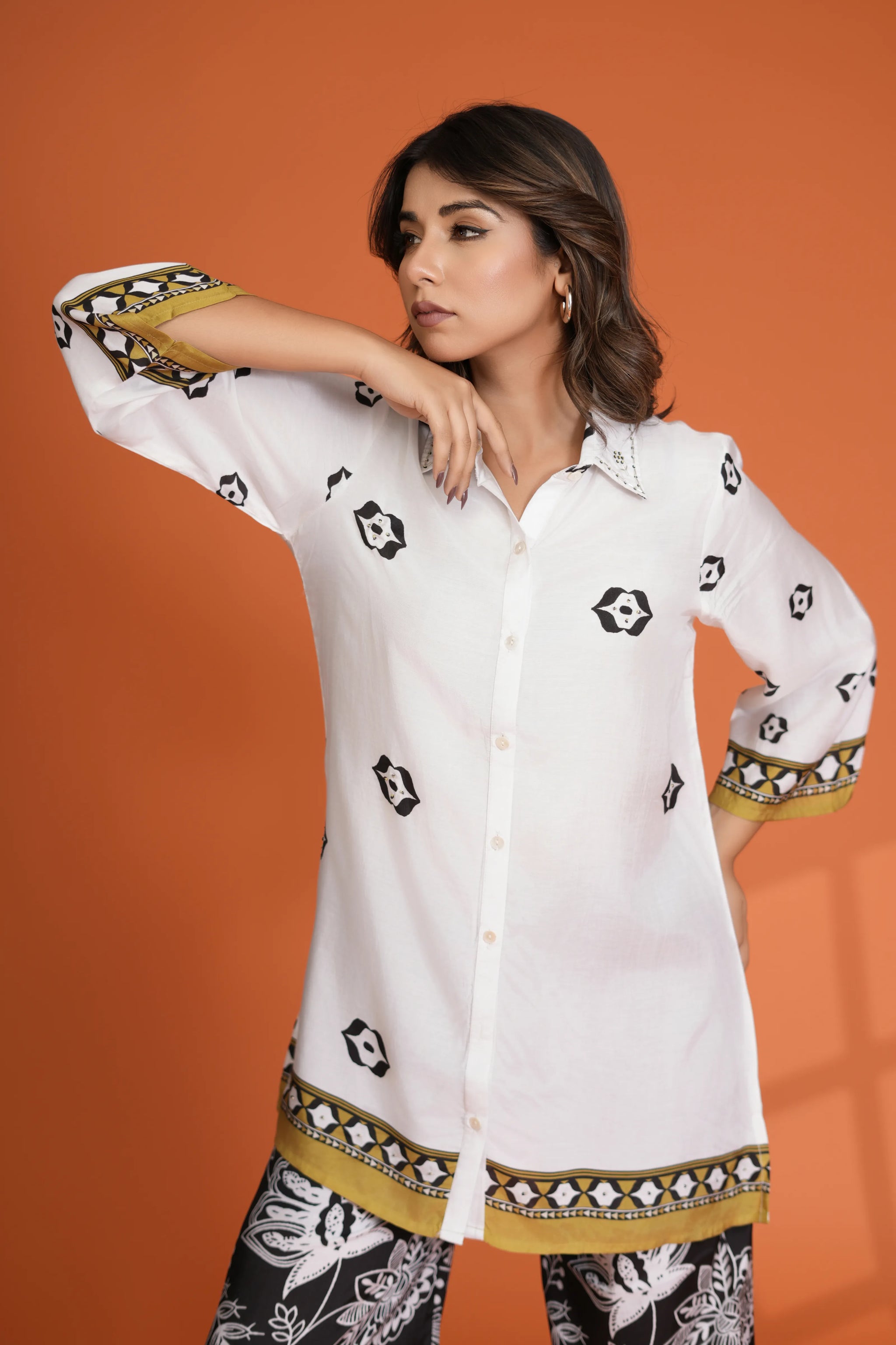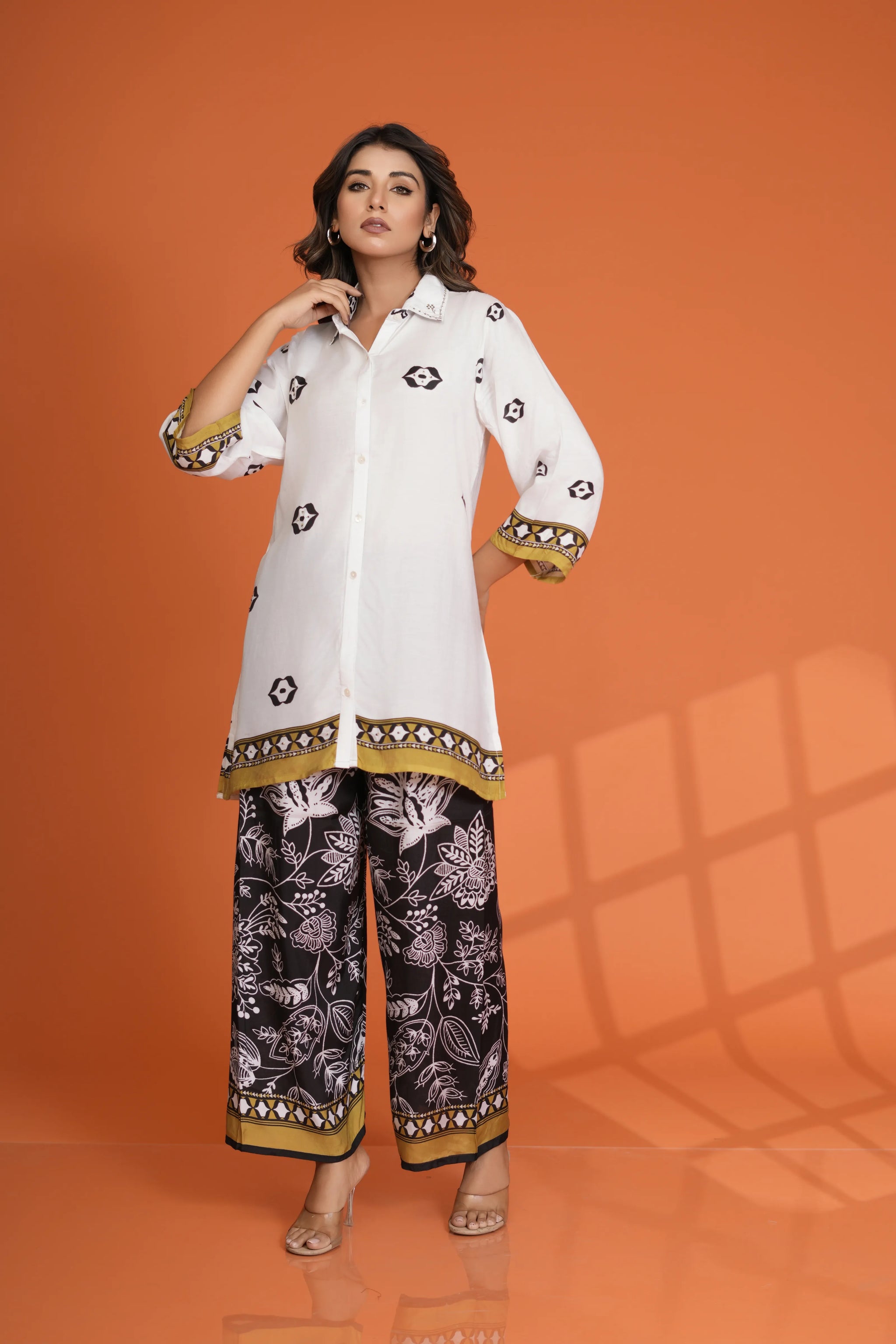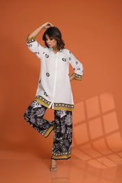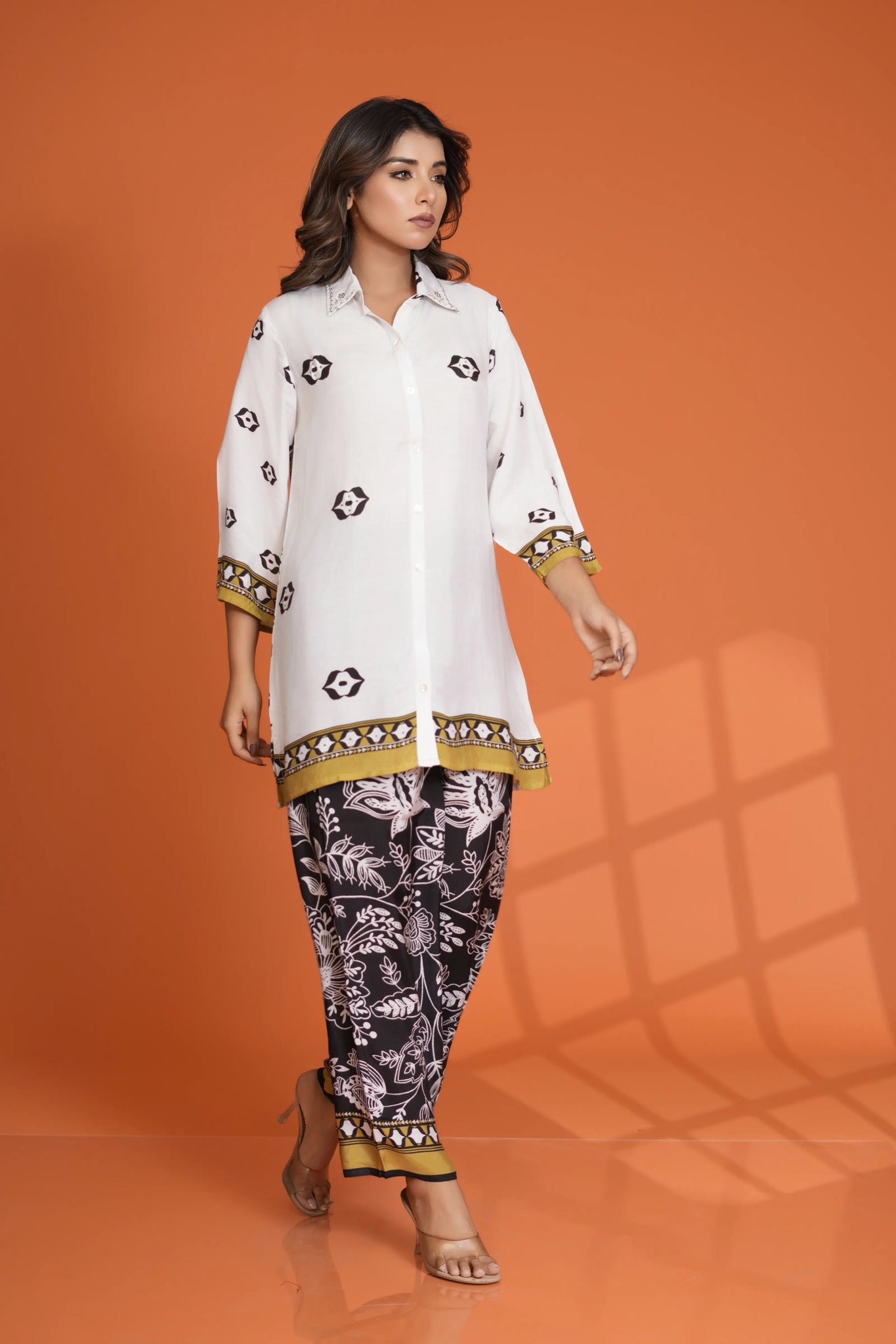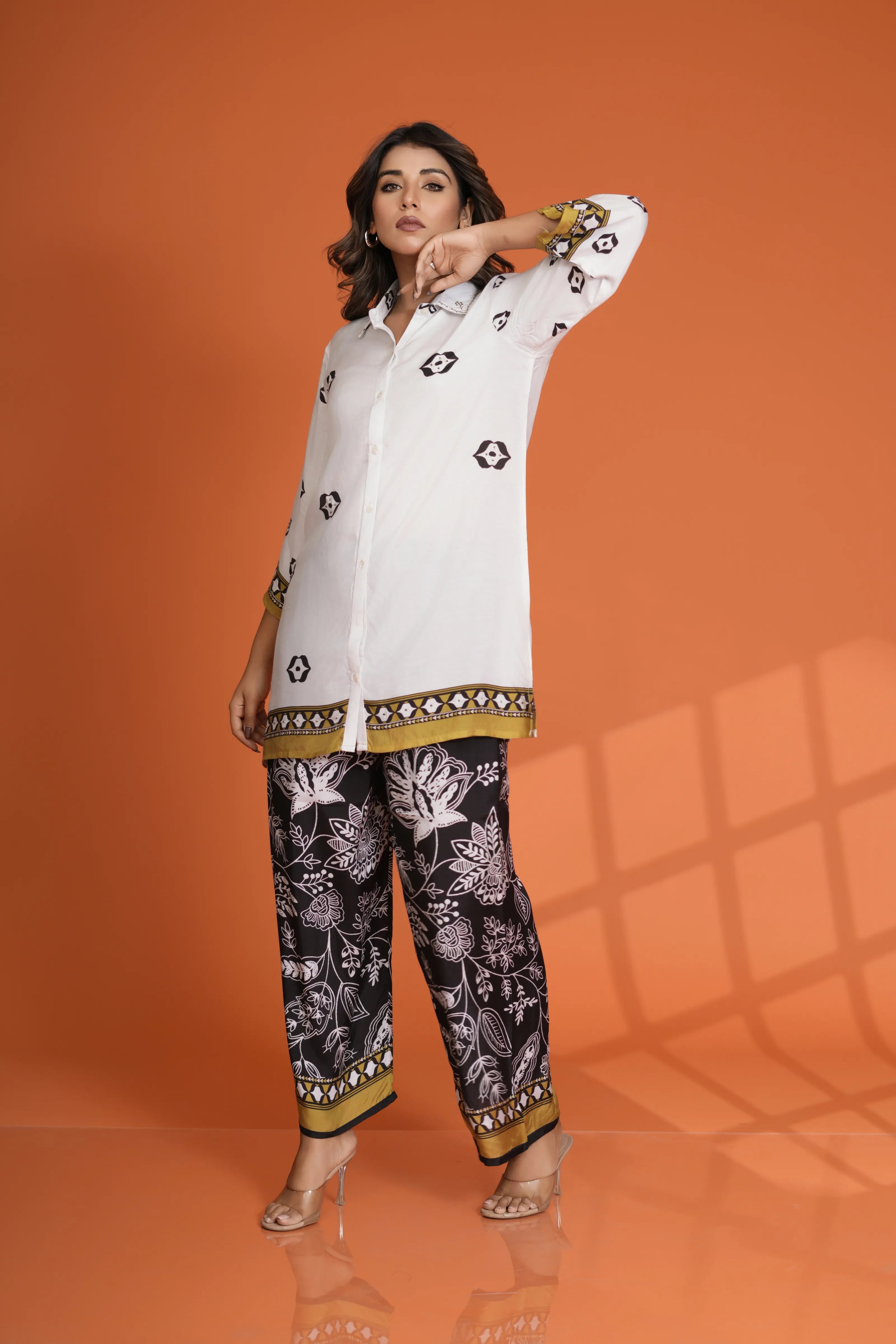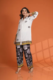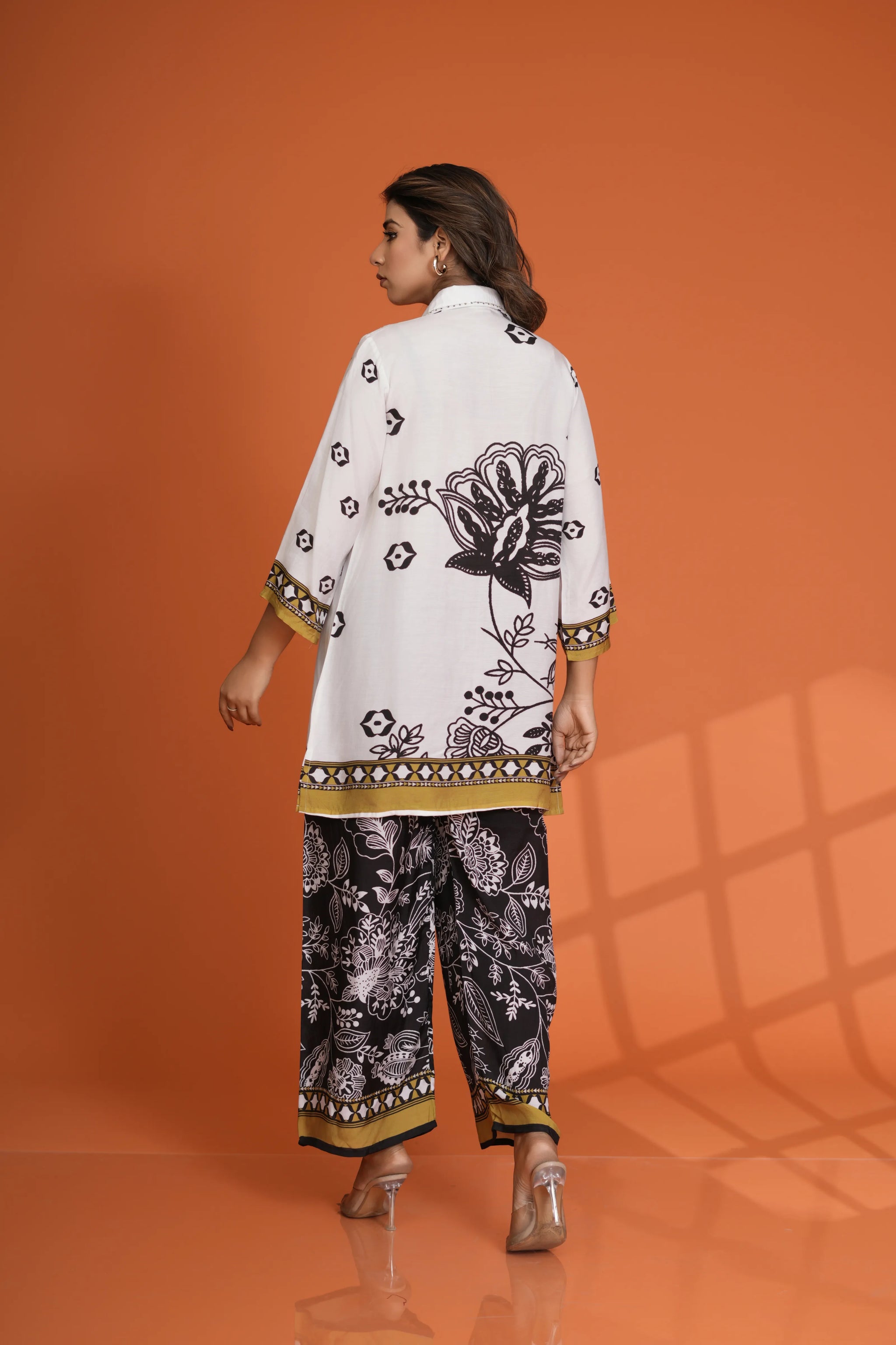 Celebrate effortless elegance with a contemporary twist on tribal charm. This white muslin co-ord set features a breezy button-down silhouette paired with bold black floral pants—both tied together through striking border detailing in mustard yellow and deep black.