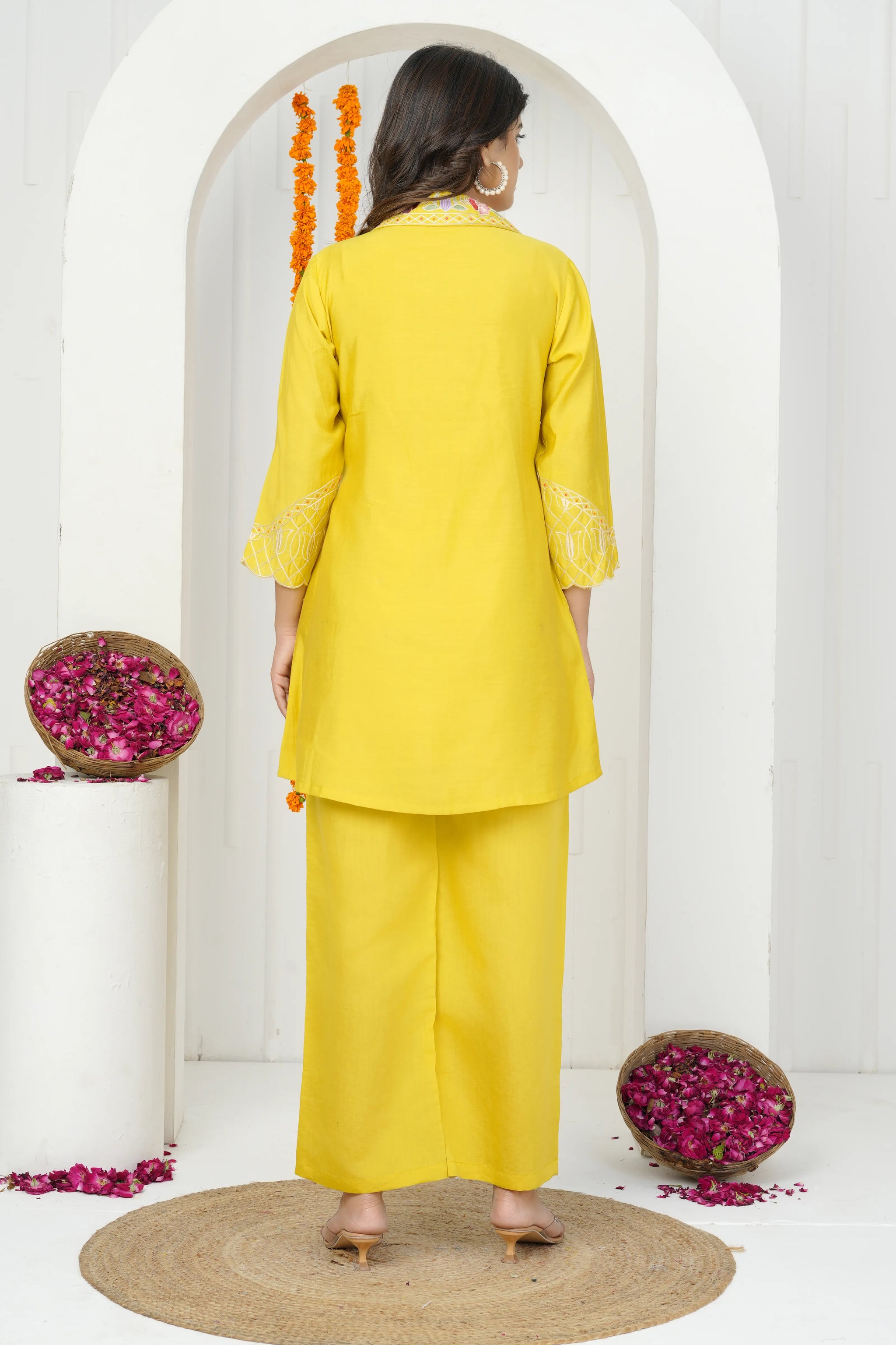 Yellow Base Floral Embroidered Co-ord Set in Yellow Roman Silk