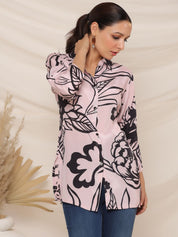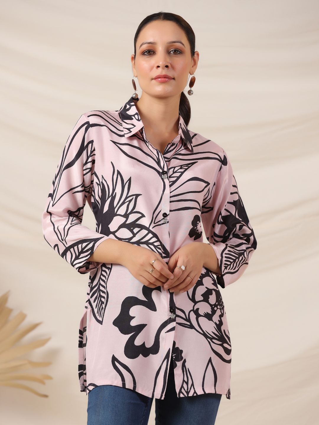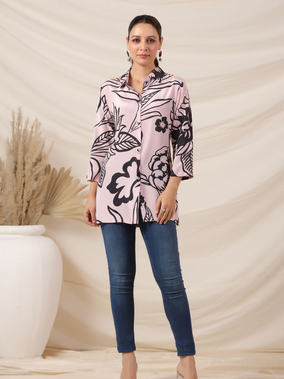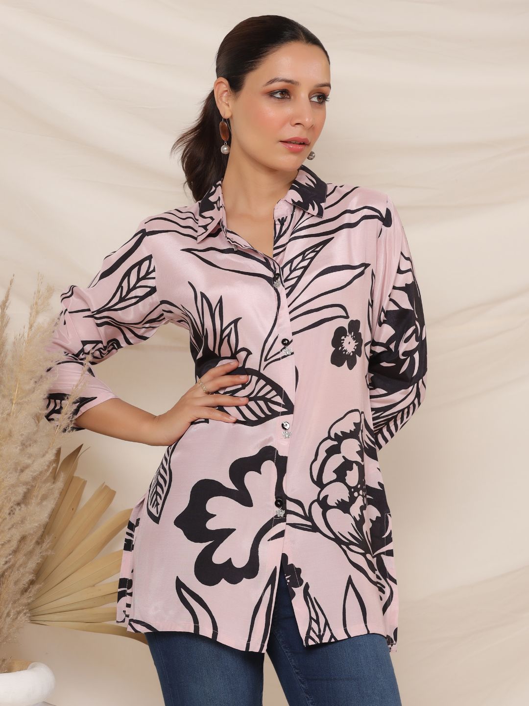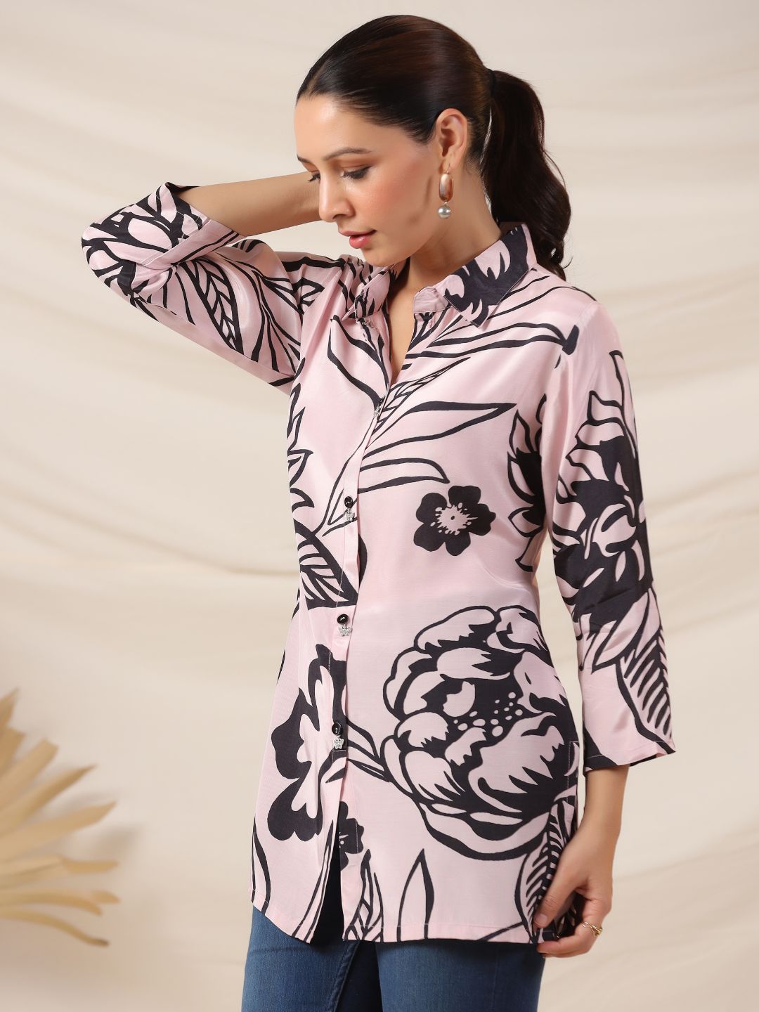 Add a touch of feminine sophistication to your wardrobe with the Baby Pink & Black Floral Printed Top, crafted from luxurious Russian silk for a soft, flowy drape. The classic shirt collar and 3/4th sleeves lend a polished look, while the delicate black floral print on a baby pink base creates a striking contrast, perfect for both casual and semi-formal occasions.