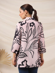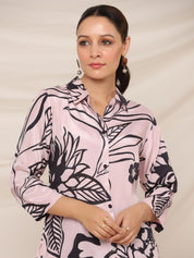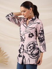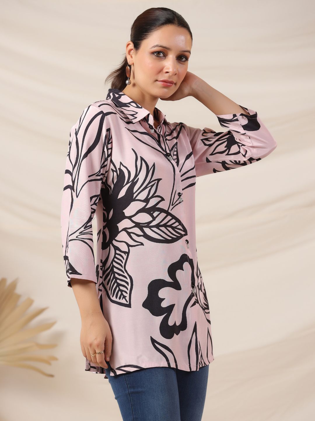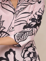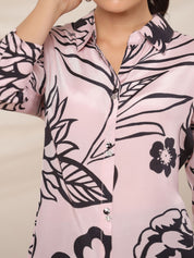 • Top: Shirt Collar, 3/4th Sleeves, Black Floral Print on Baby Pink Base