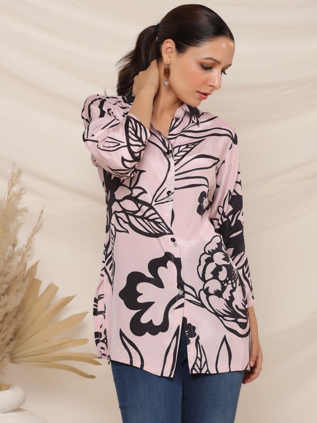 Baby Pink & Black Floral Printed Top in Russian Silk