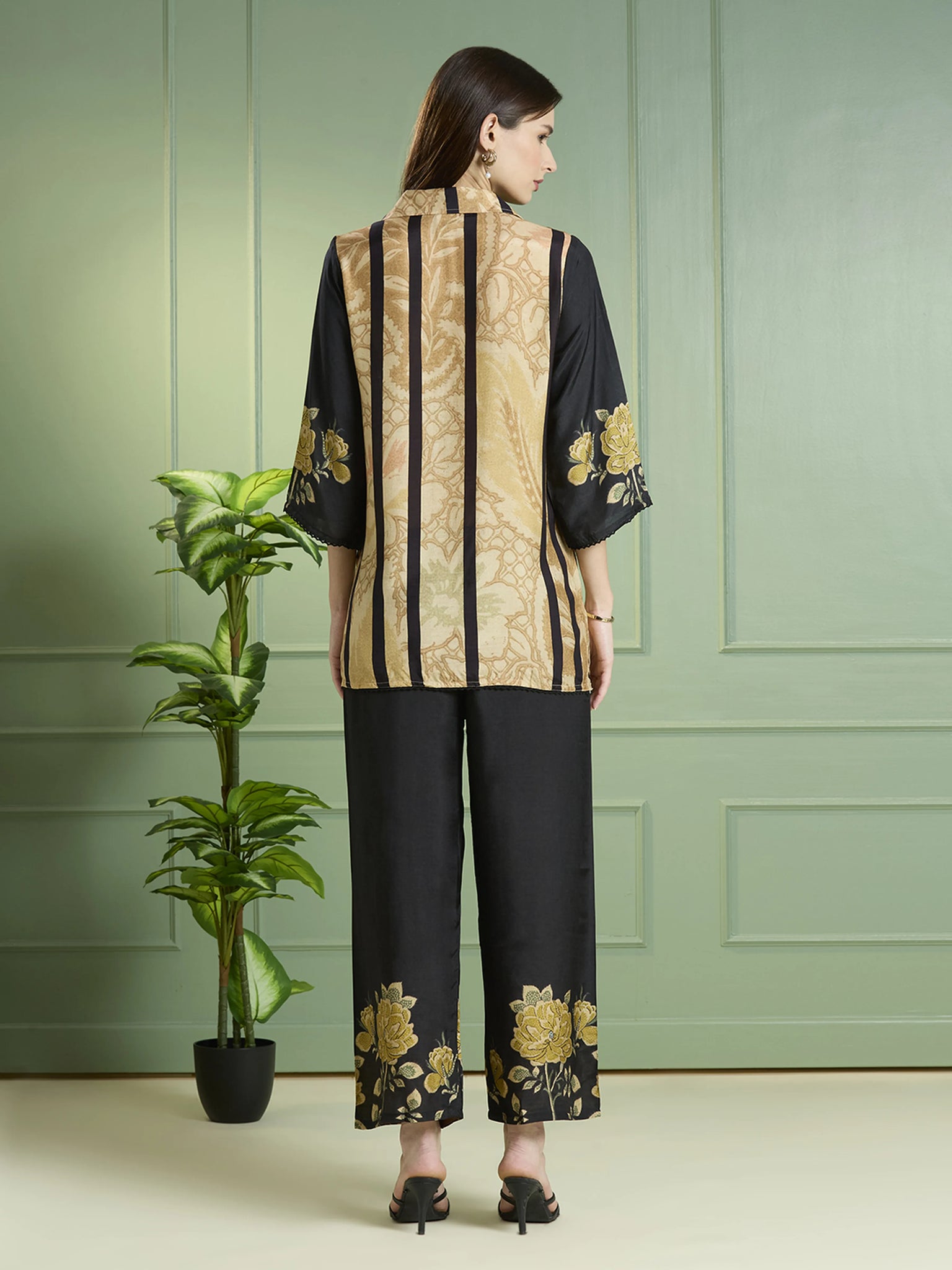 The top features a shirt collar with fabric-covered buttons, lending a sleek tailored edge. Its multi-color floral print in muted gold and ivory tones creates a chic noir palette, while 3/4th sleeves finished with delicate lace detailing add a hint of femininity. The straight hemline flows gracefully, enhancing the silhouette’s contemporary appeal.
