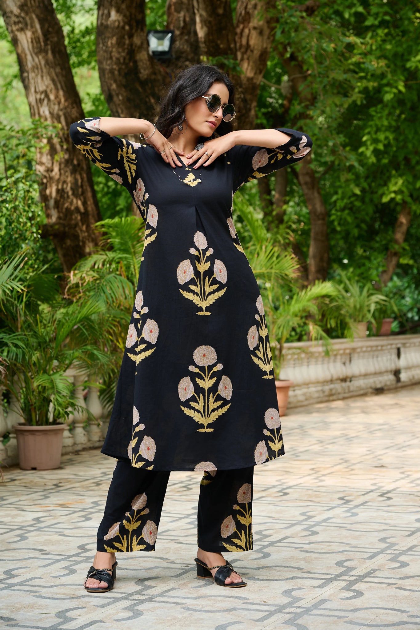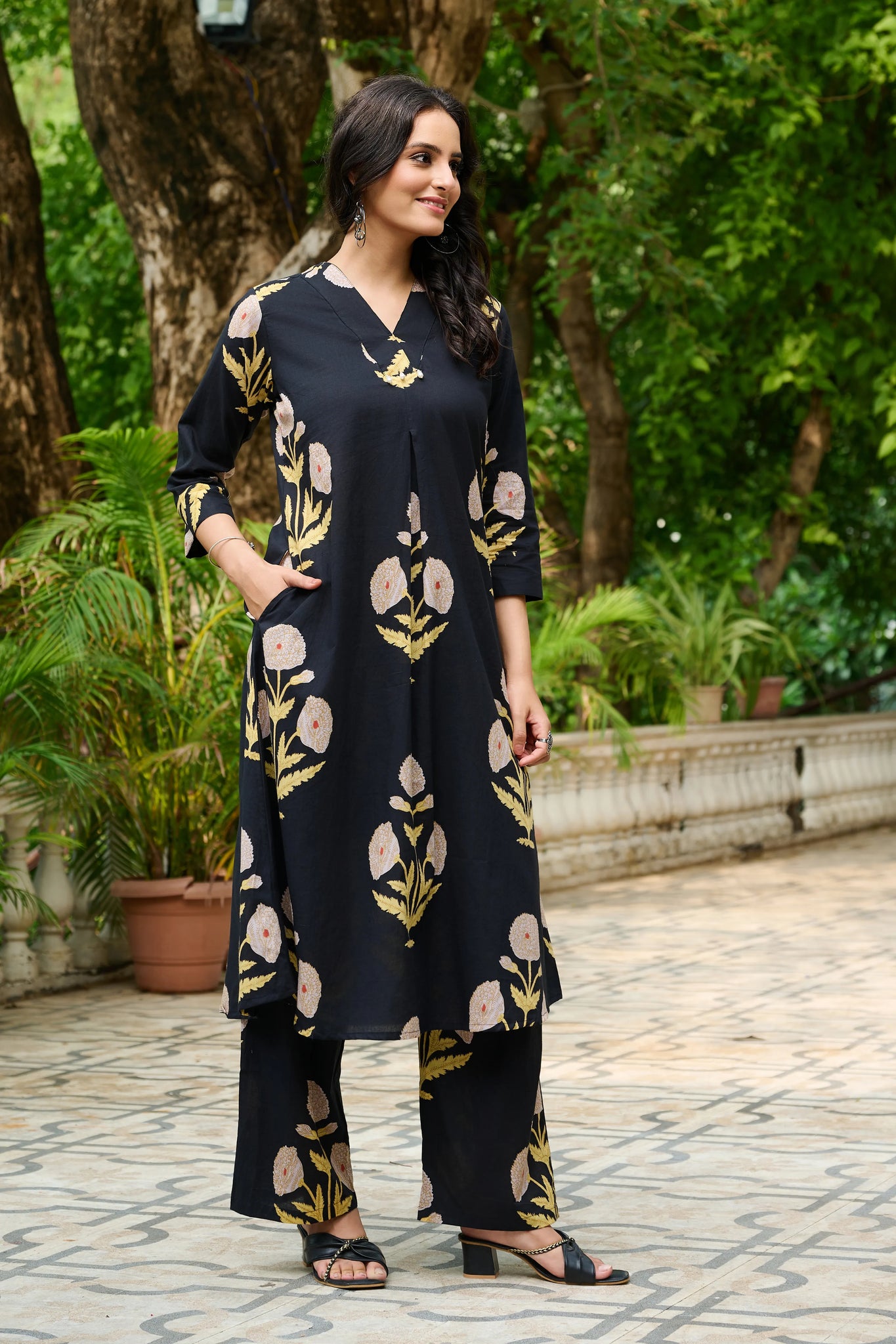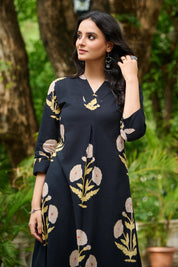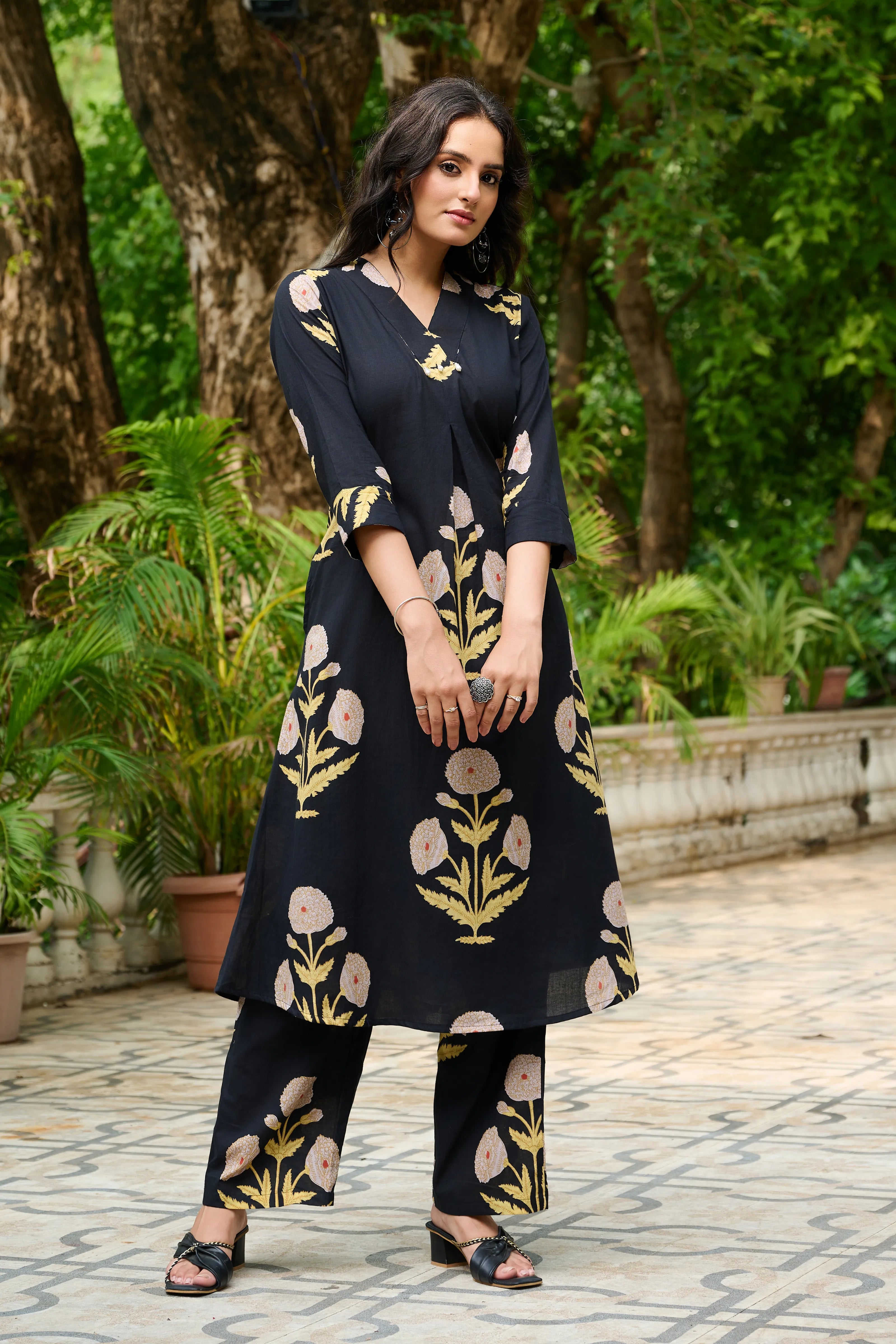 Botanic Noir: Black Cotton Cambric Floral A-Line Kurta Set