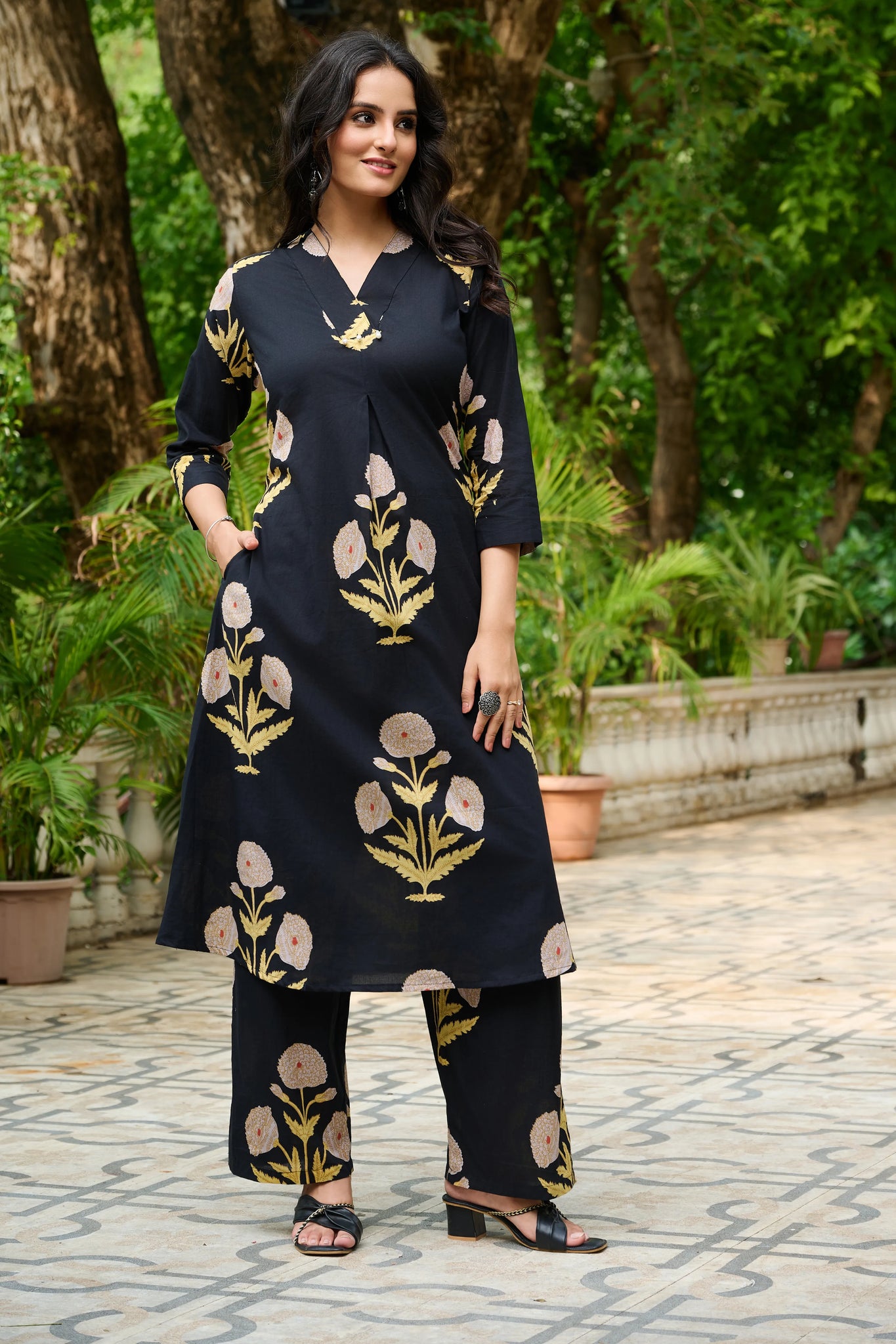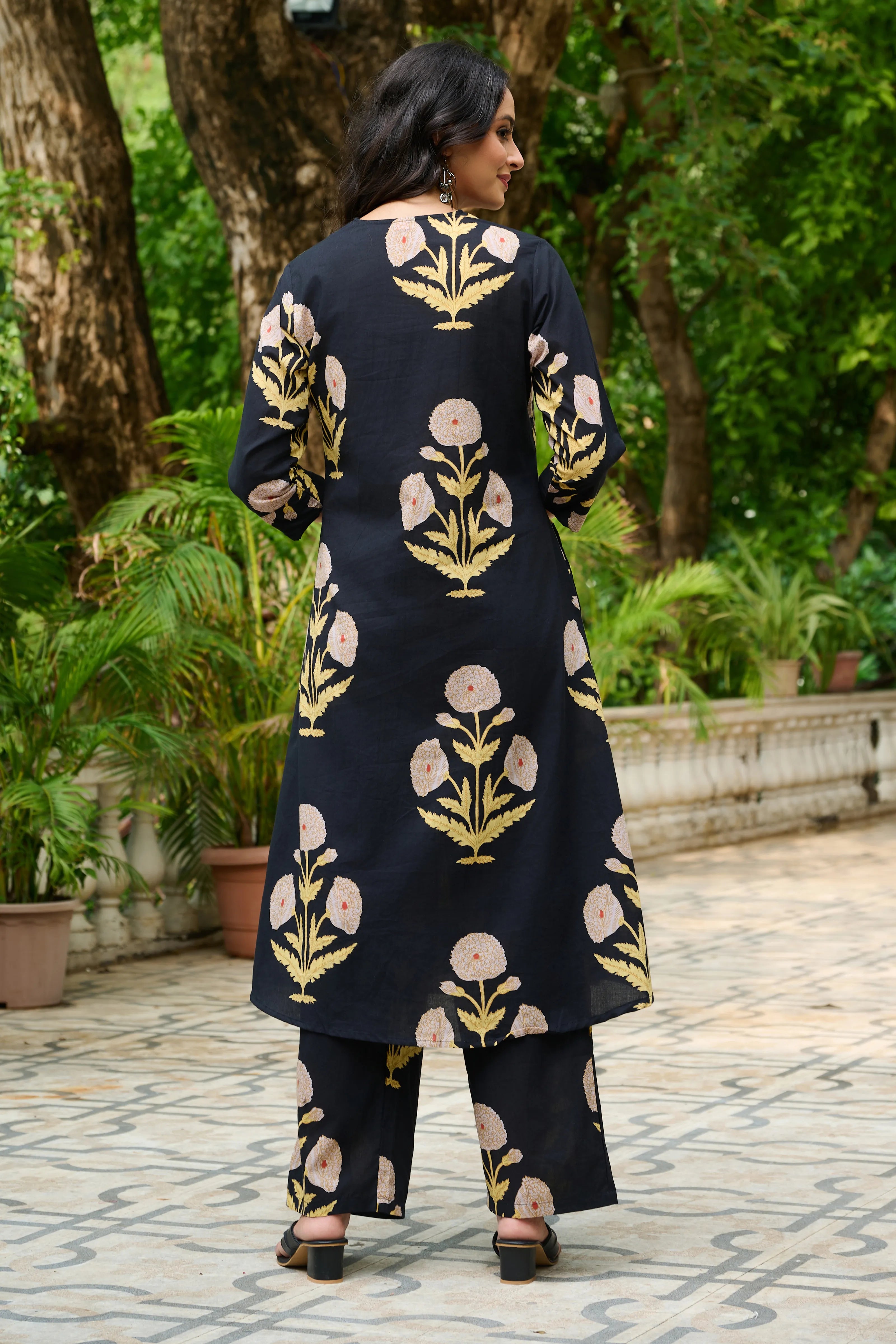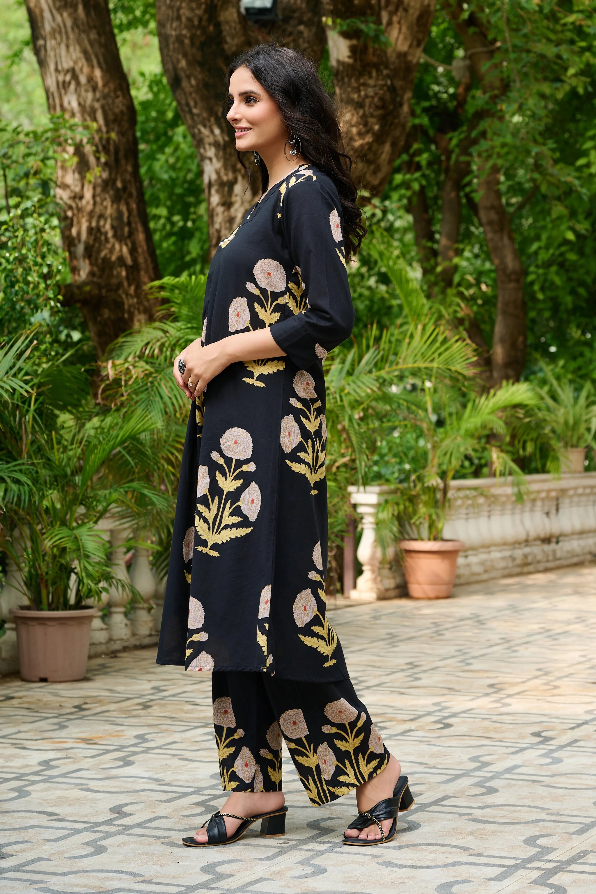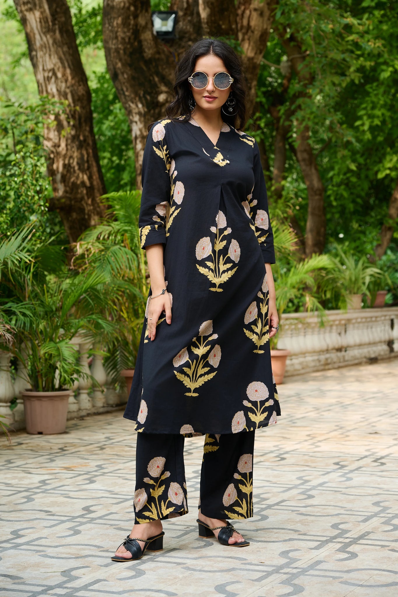 Botanic Noir: Black Cotton Cambric Floral A-Line Kurta Set
