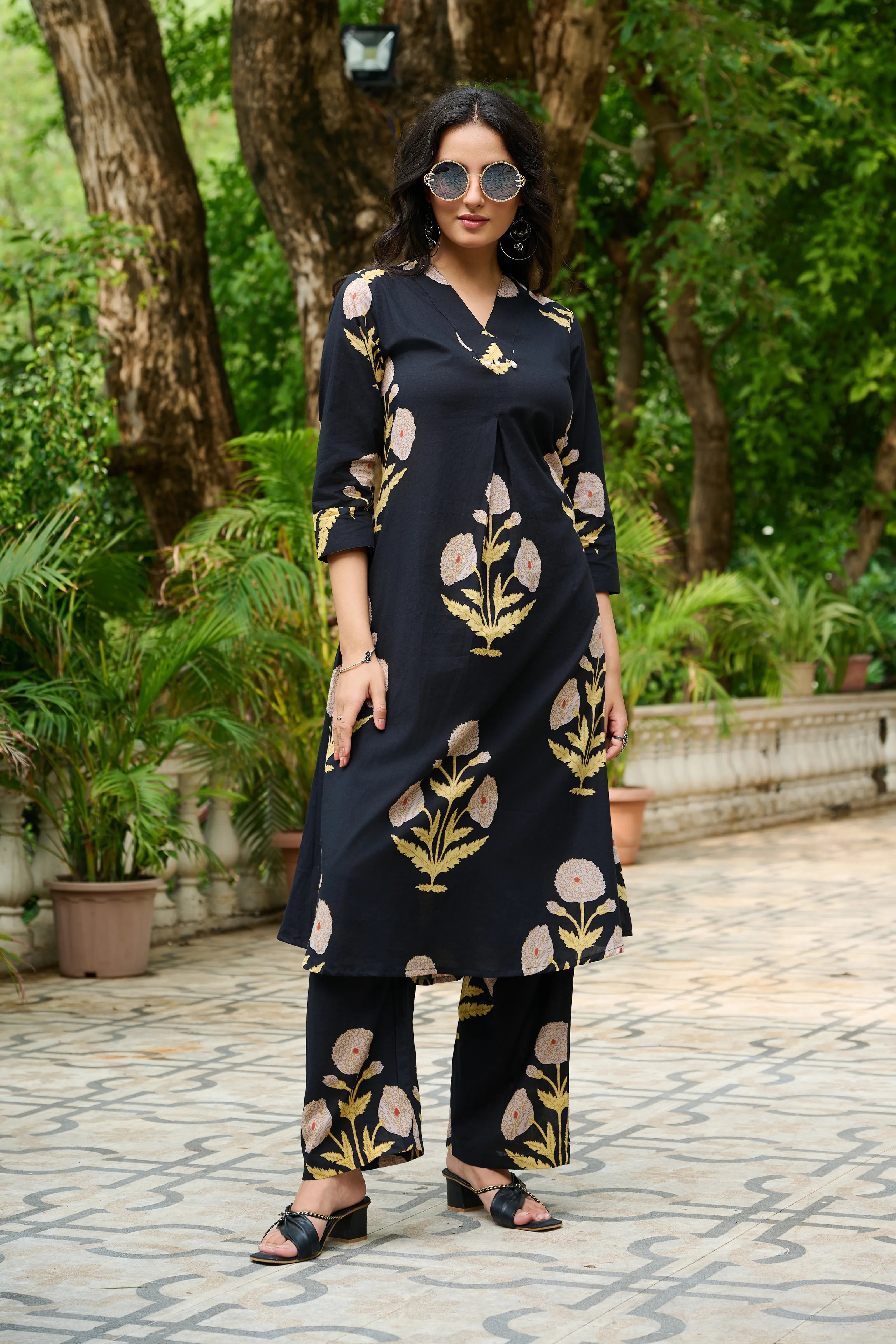 Step into a world of subtle elegance with Botanic Noir — a black cotton cambric co-ord set that brings floral charm to the forefront. Adorned with bold cream-yellow flower prints all over, this V-neck A-line kurta is tailored with a single pleat and side pocket for functionality wrapped in style.