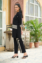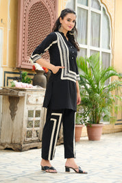 Traditional craftsmanship meets bold minimalism in Noir Craft — a timeless black co-ord set elevated with intricate cream crochet lace. This striking ensemble features an angular lace layout on the bodice and pant that gives the whole look a geometric elegance.