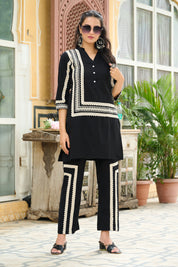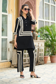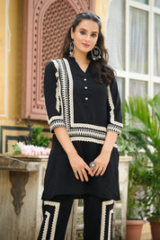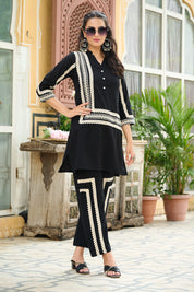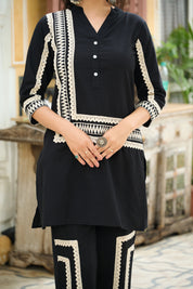 Noir Craft: Black Cotton Flex Co-ord Set with Cream Crochet Lace