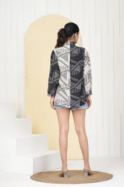 Make a statement with this Black & Cream Abstract Printed Top, designed for those who love effortless elegance with a touch of glamour. Crafted from luxurious viscose, this top features an eye-catching all-over abstract print, a chic tie-up collar, and rhinestone embellishments that add a subtle shimmer.