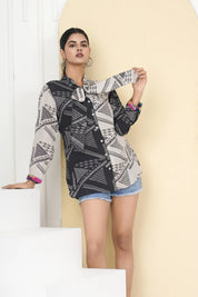 Add artistic flair to your wardrobe with this Black & Cream Abstract Printed Tie-Collar Top, a perfect blend of modern style and timeless elegance!