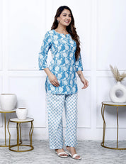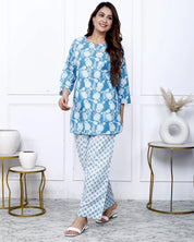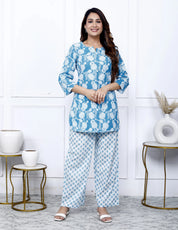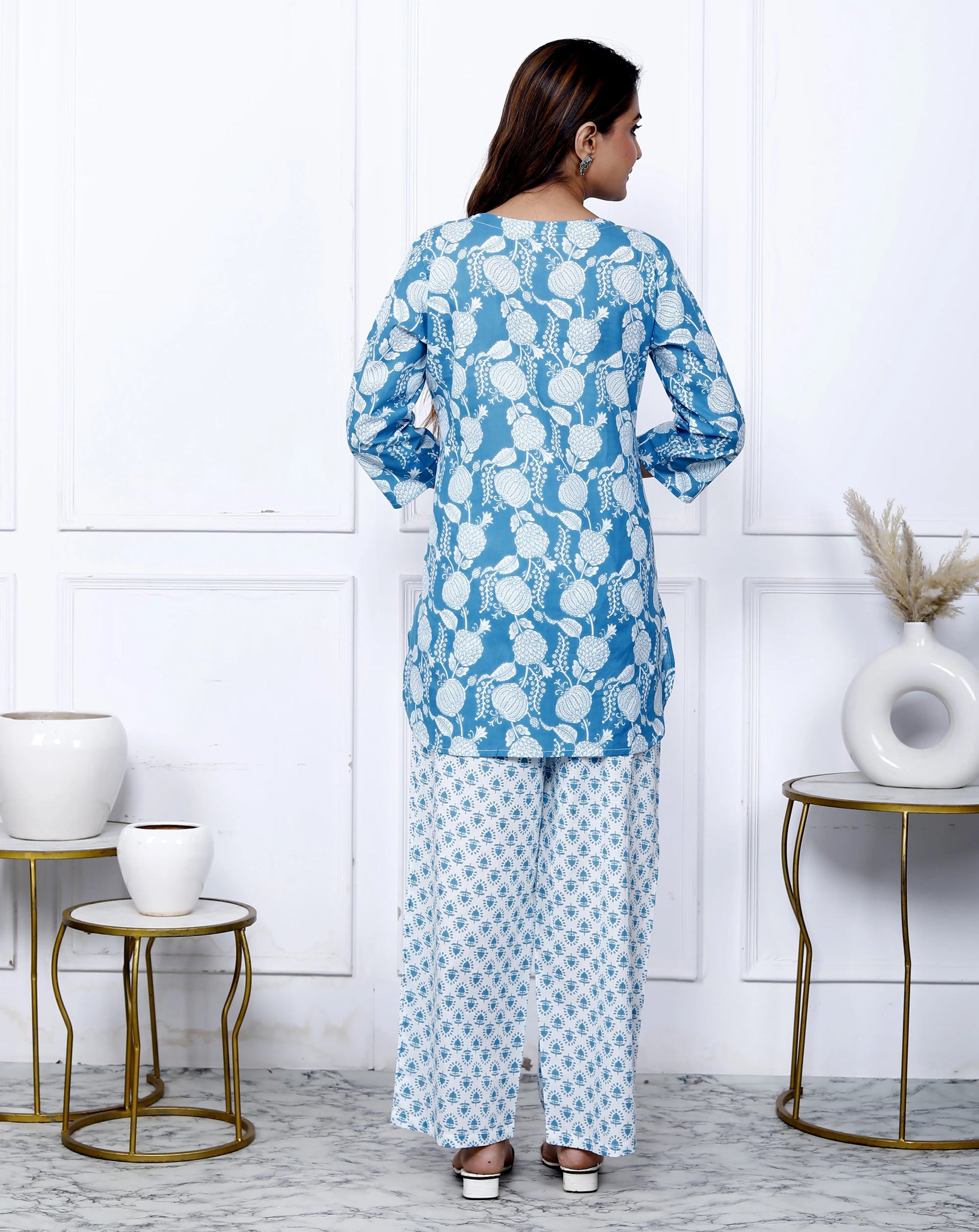 Embrace the effortless elegance of this Blue Botanical Kurta Set, designed to keep you comfortable and stylish all day long.