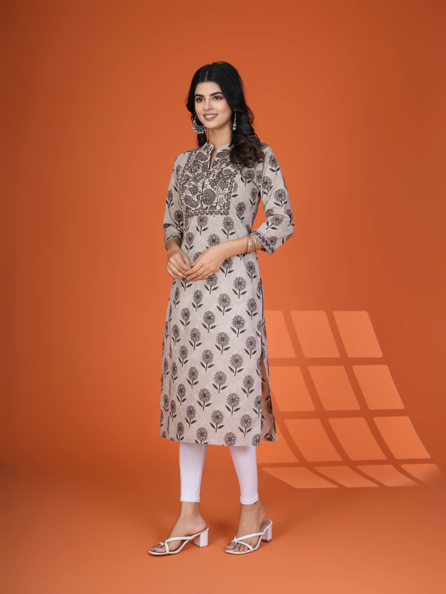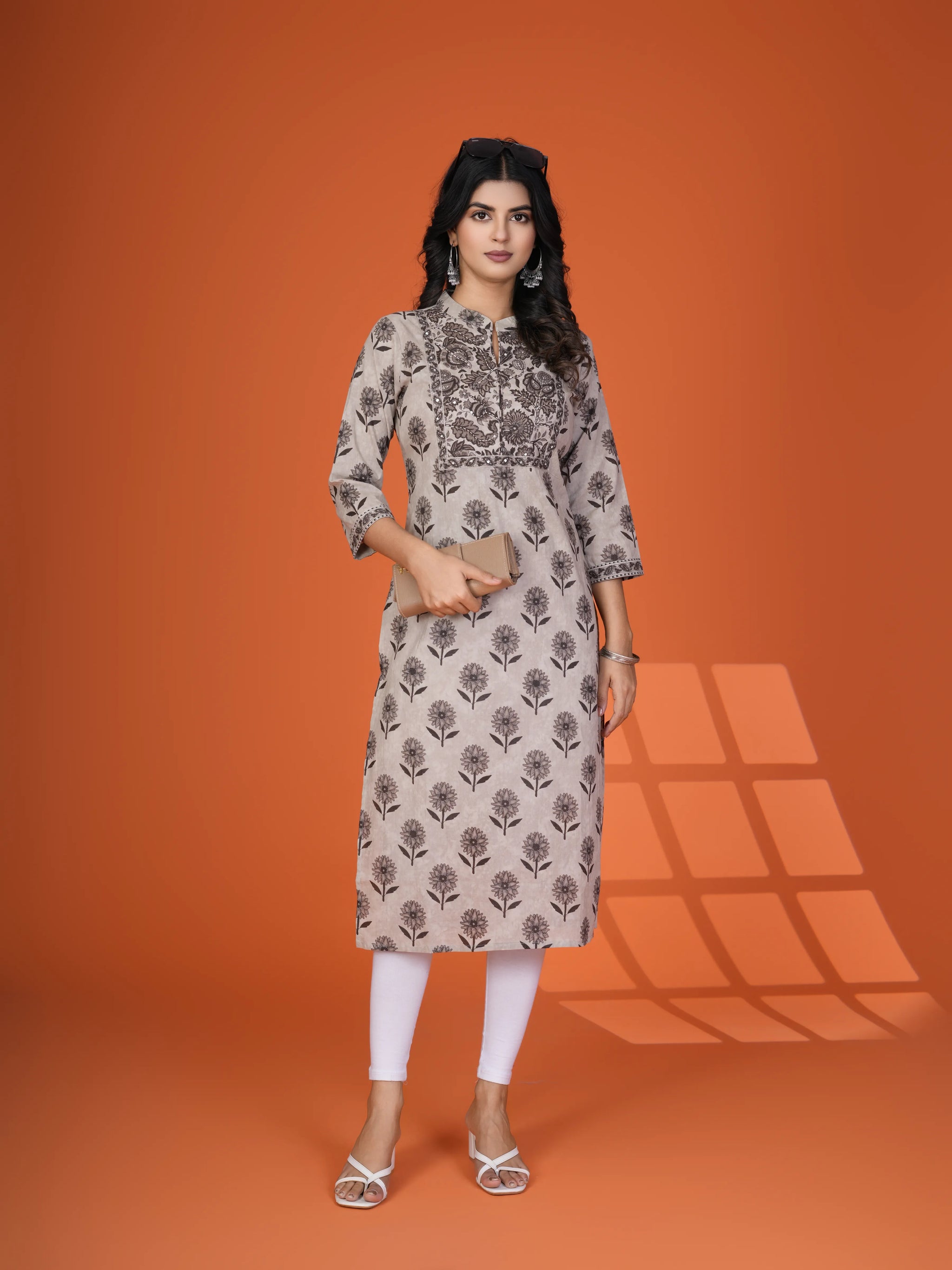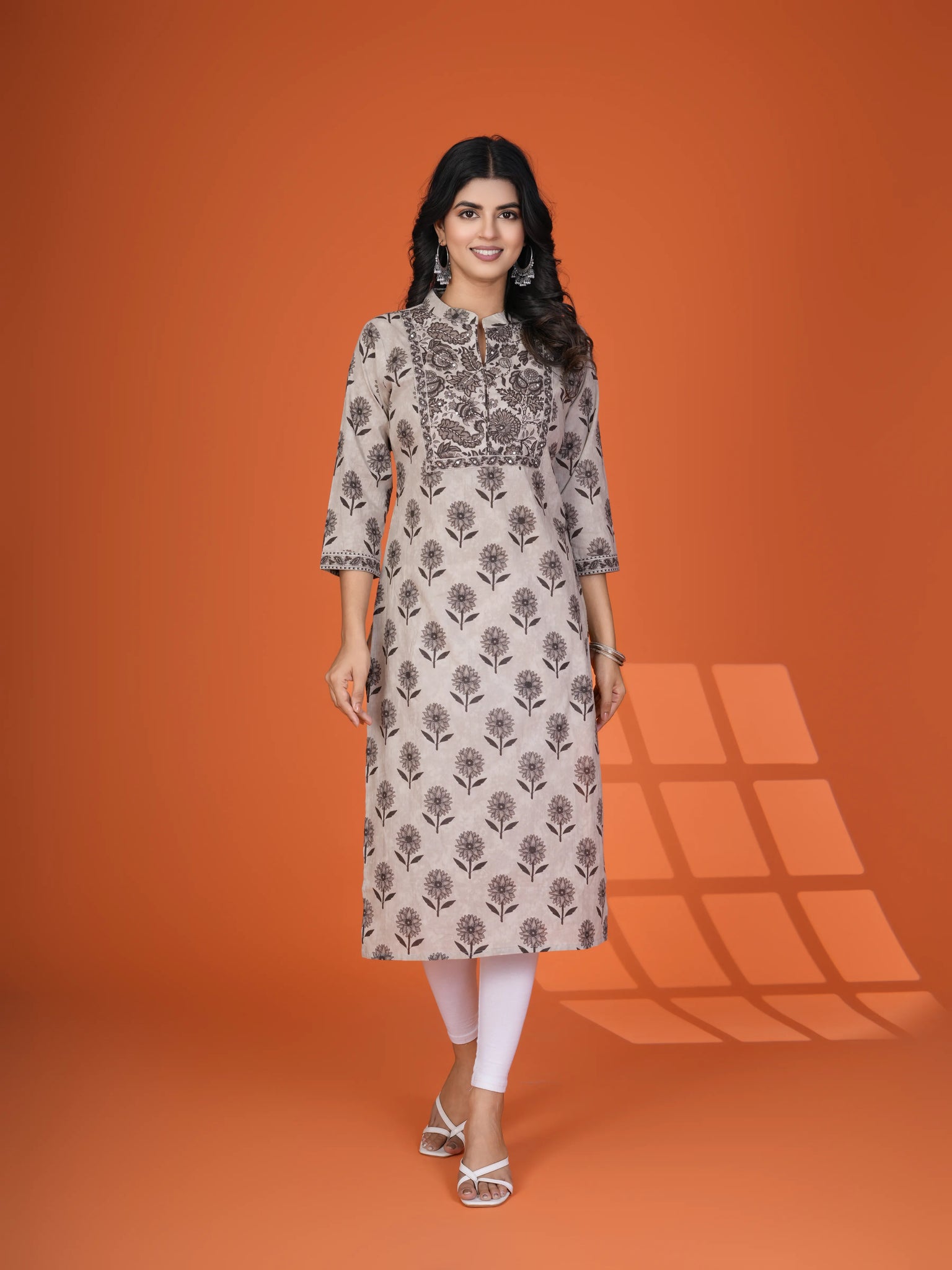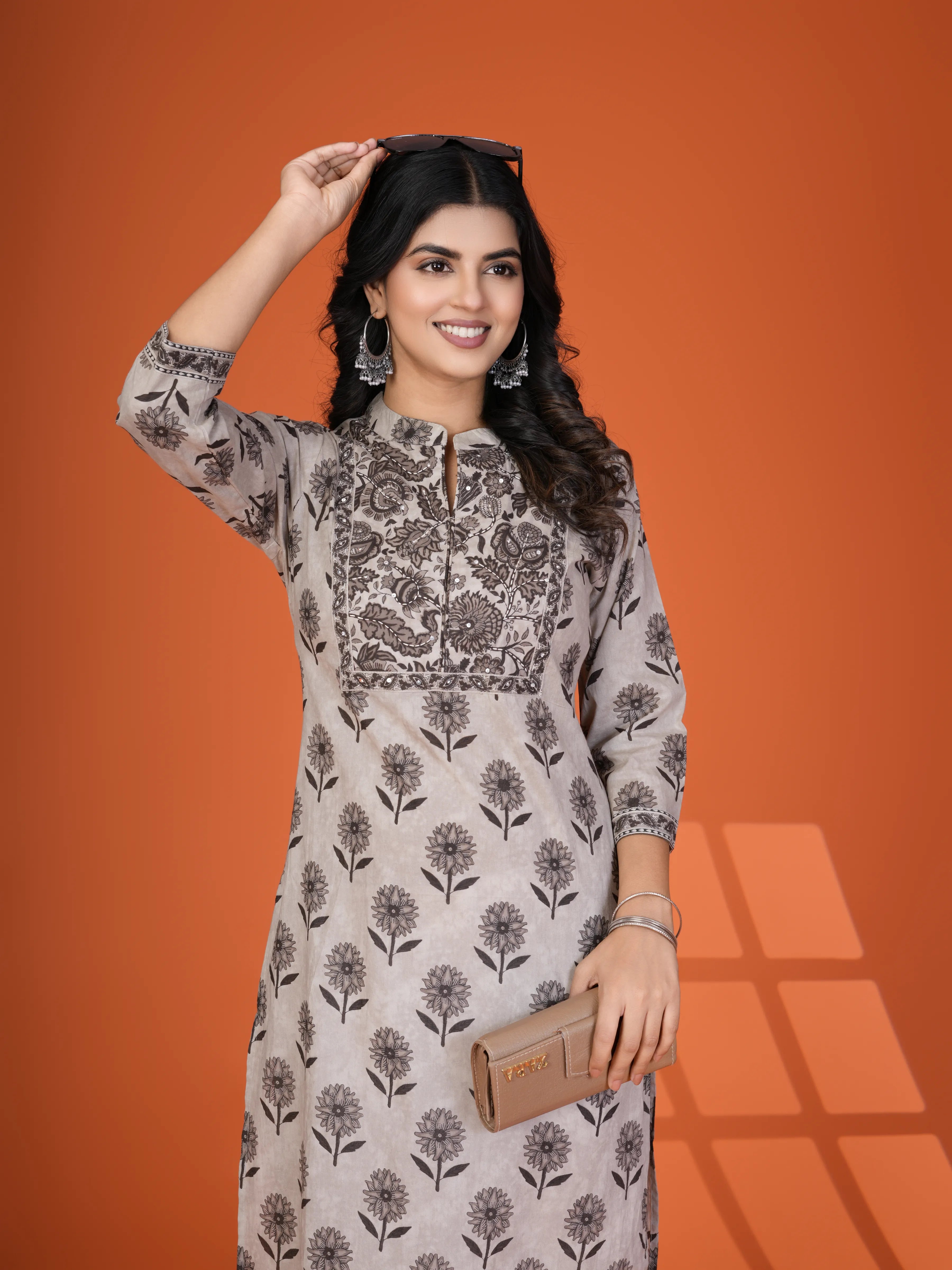 Where tradition meets sophistication—this brown floral printed long kurti brings earthy elegance to your everyday ethnic wardrobe. Made from breathable cotton cambric, the kurti features intricate floral block-inspired motifs and hand-placed sequin detailing that adds just the right hint of festive sparkle.