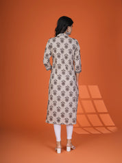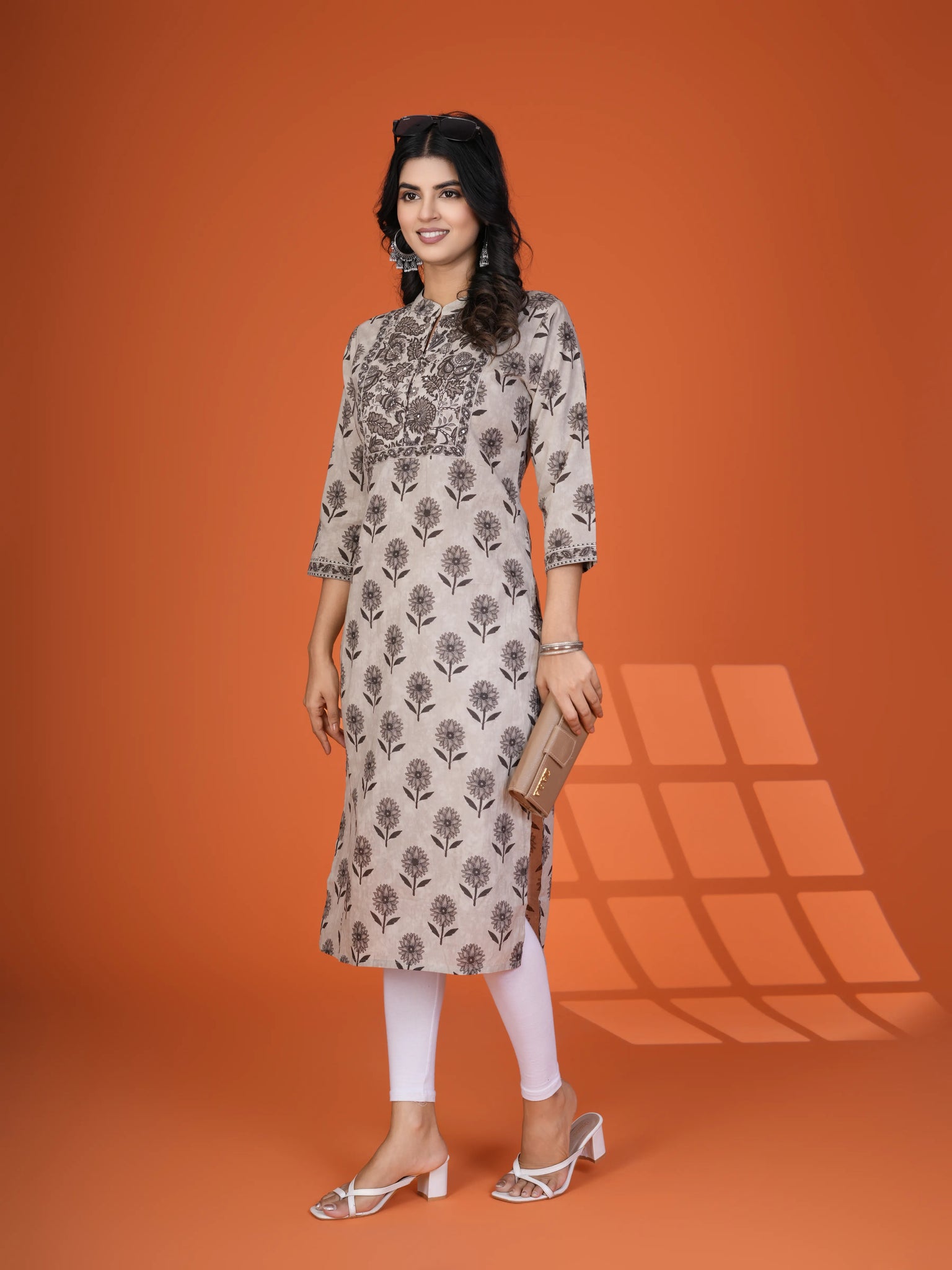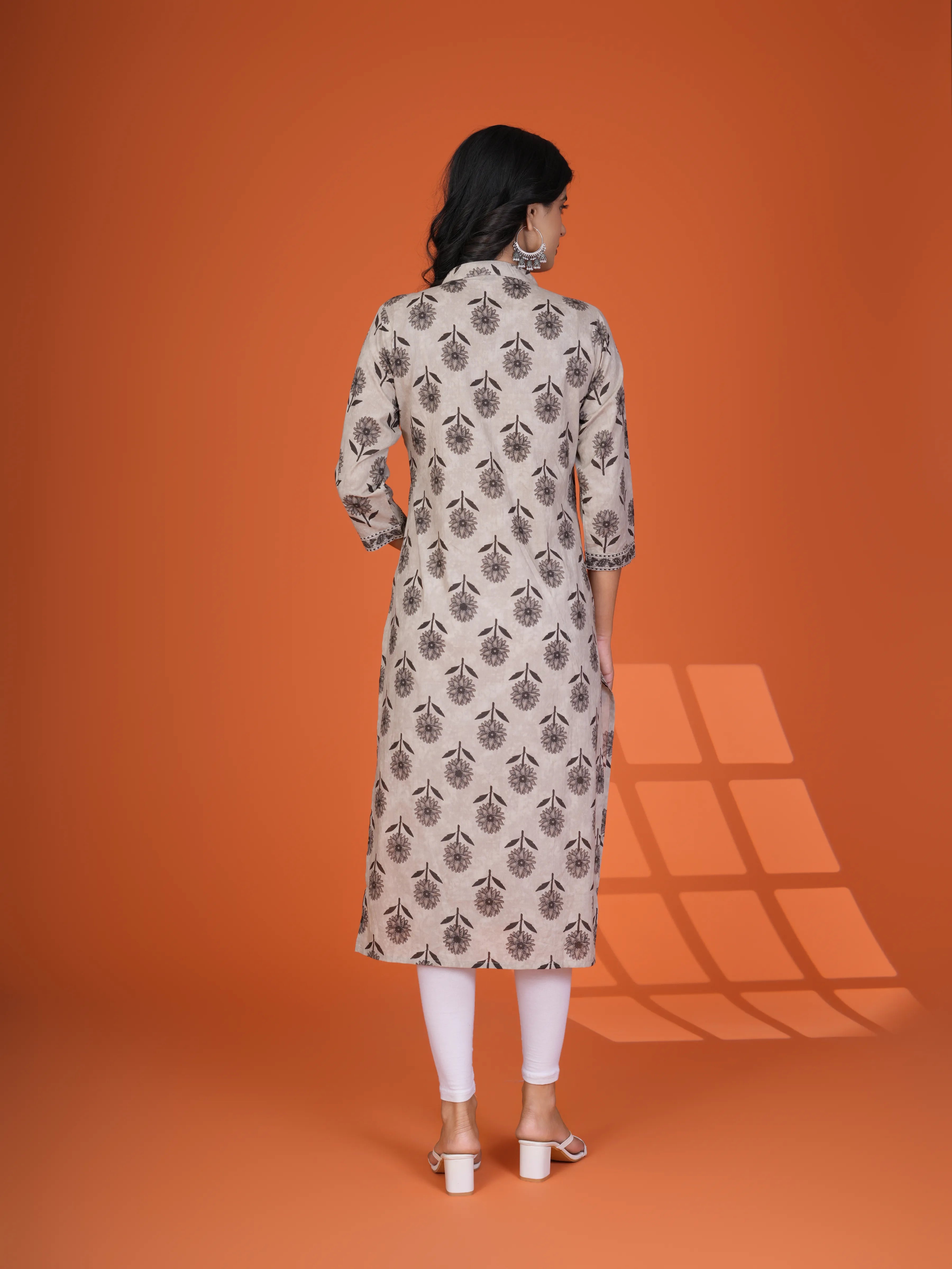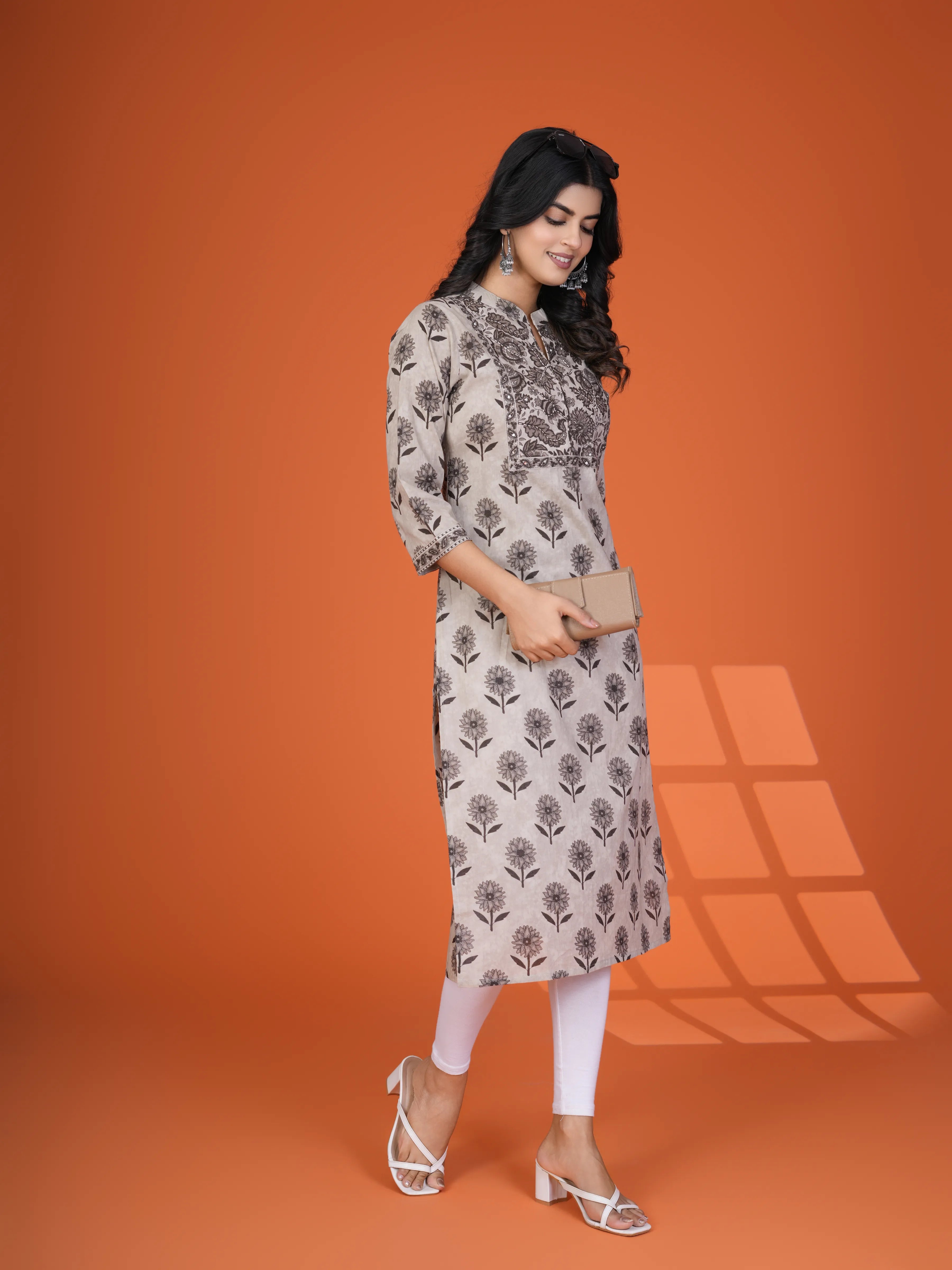 Where tradition meets sophistication—this brown floral printed long kurti brings earthy elegance to your everyday ethnic wardrobe. Made from breathable cotton cambric, the kurti features intricate floral block-inspired motifs and hand-placed sequin detailing that adds just the right hint of festive sparkle.