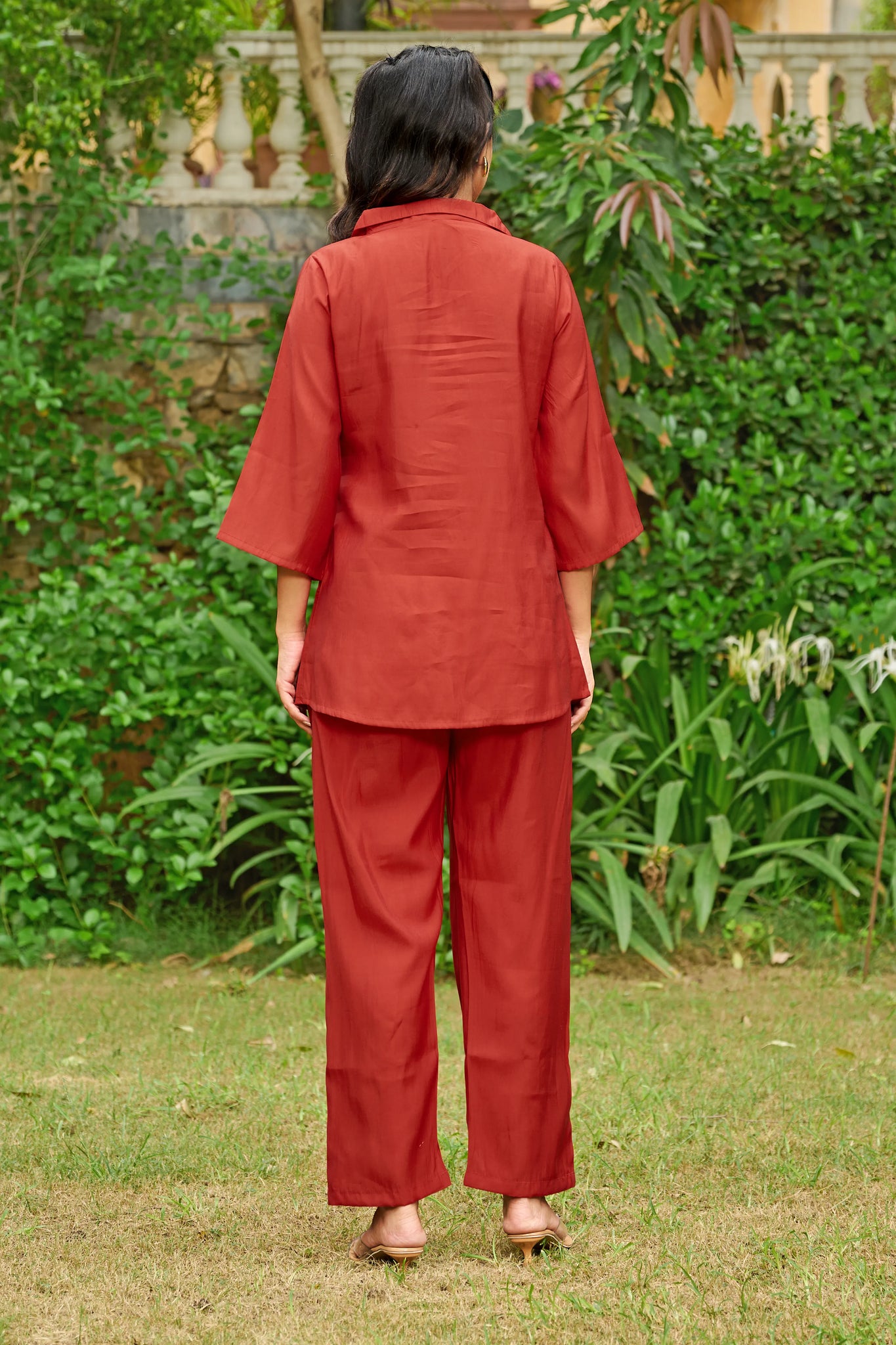 The button-down top features a flattering V-neckline with a structured shirt collar and relaxed 3/4th sleeves, perfectly paired with wide-leg matching trousers for a look that’s equal parts polished and relaxed.