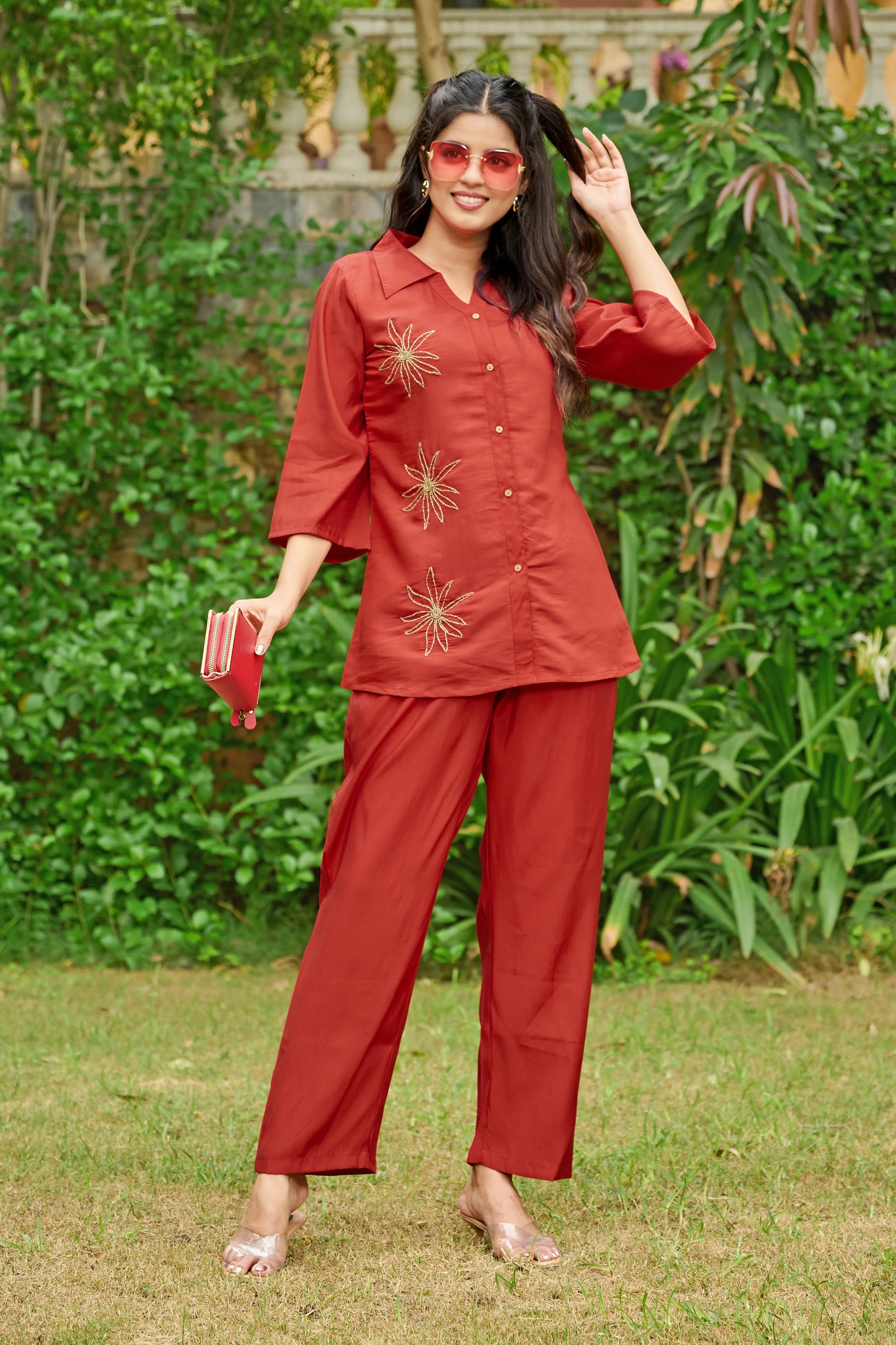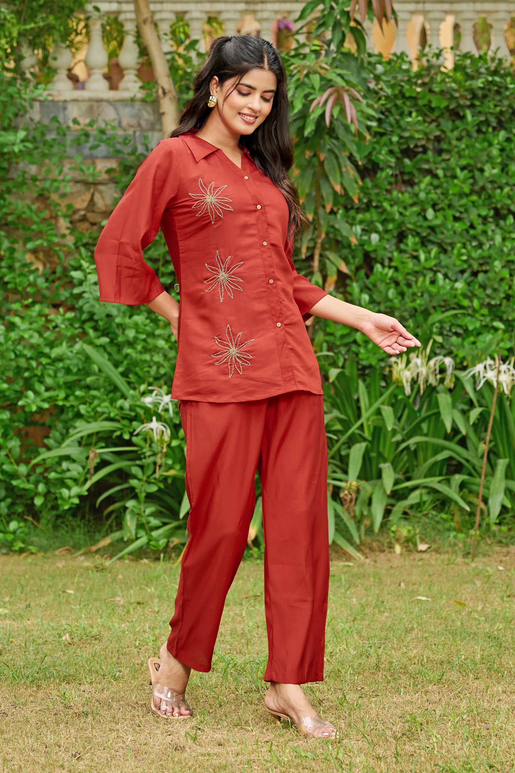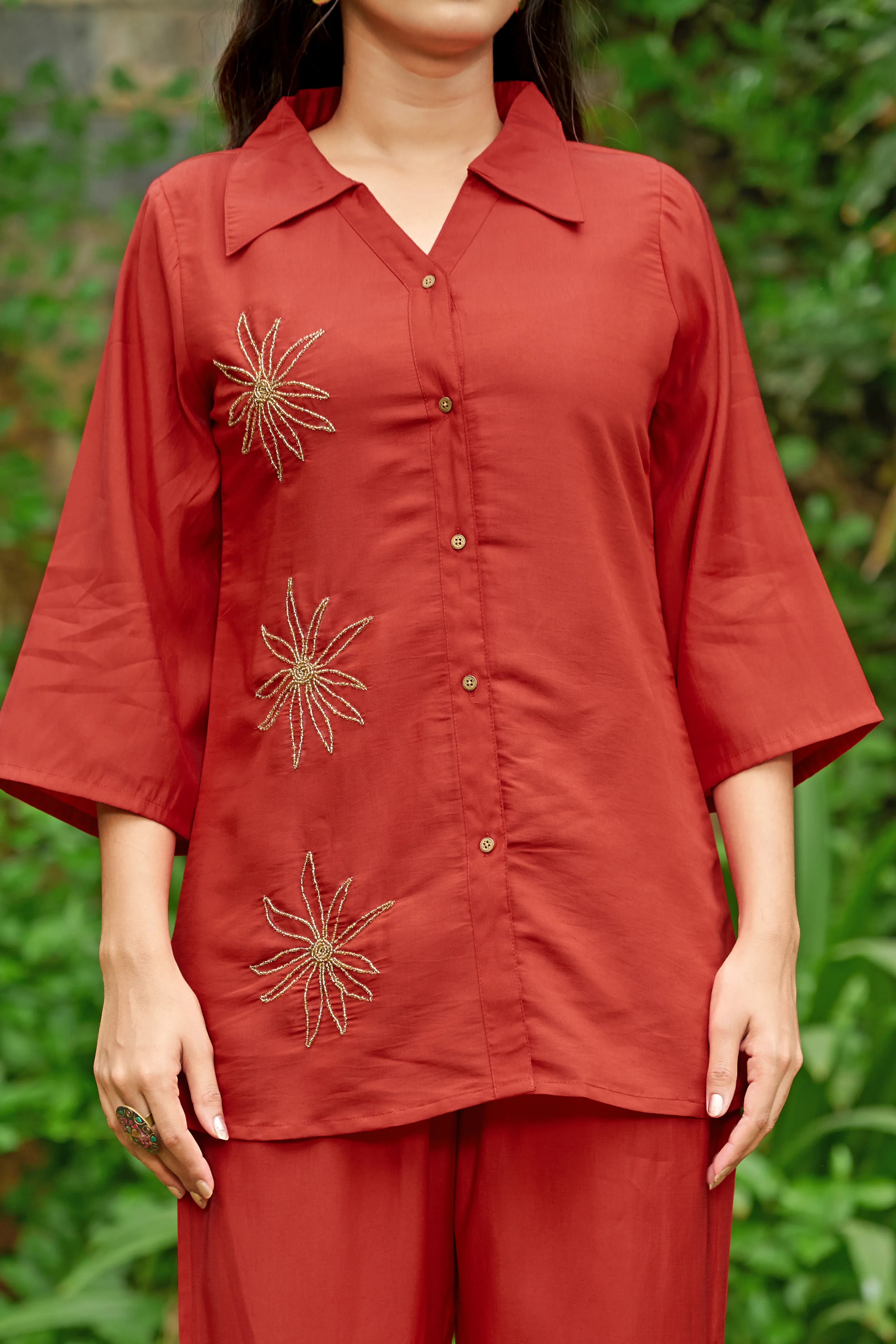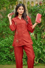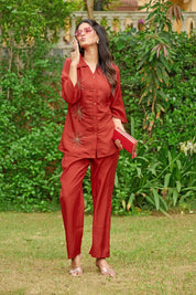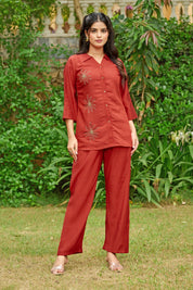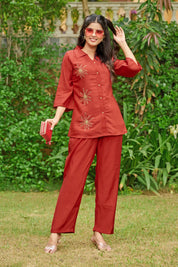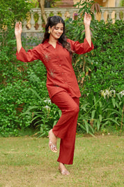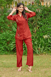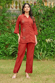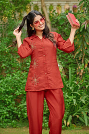 Effortlessly elegant with a bold statement — Crimson Bloom is your go-to ensemble for when comfort meets understated glam. Crafted in smooth Roman silk, this cherry red co-ord set features intricate floral motifs made with shimmering golden beadwork, placed delicately on the shirt front.