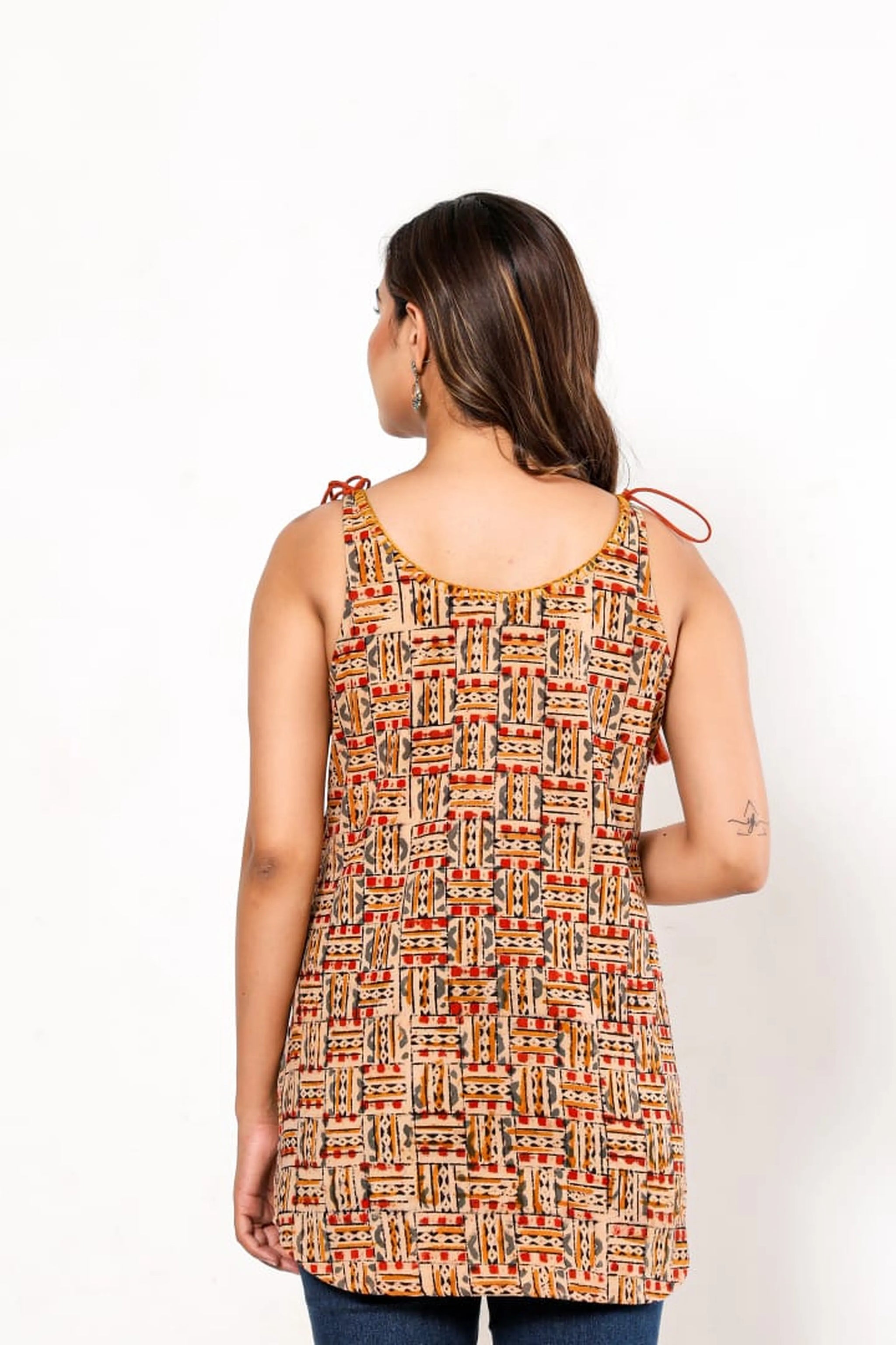 Coral & Mustard Tribal Sleeveless Cotton Cambric Kurti