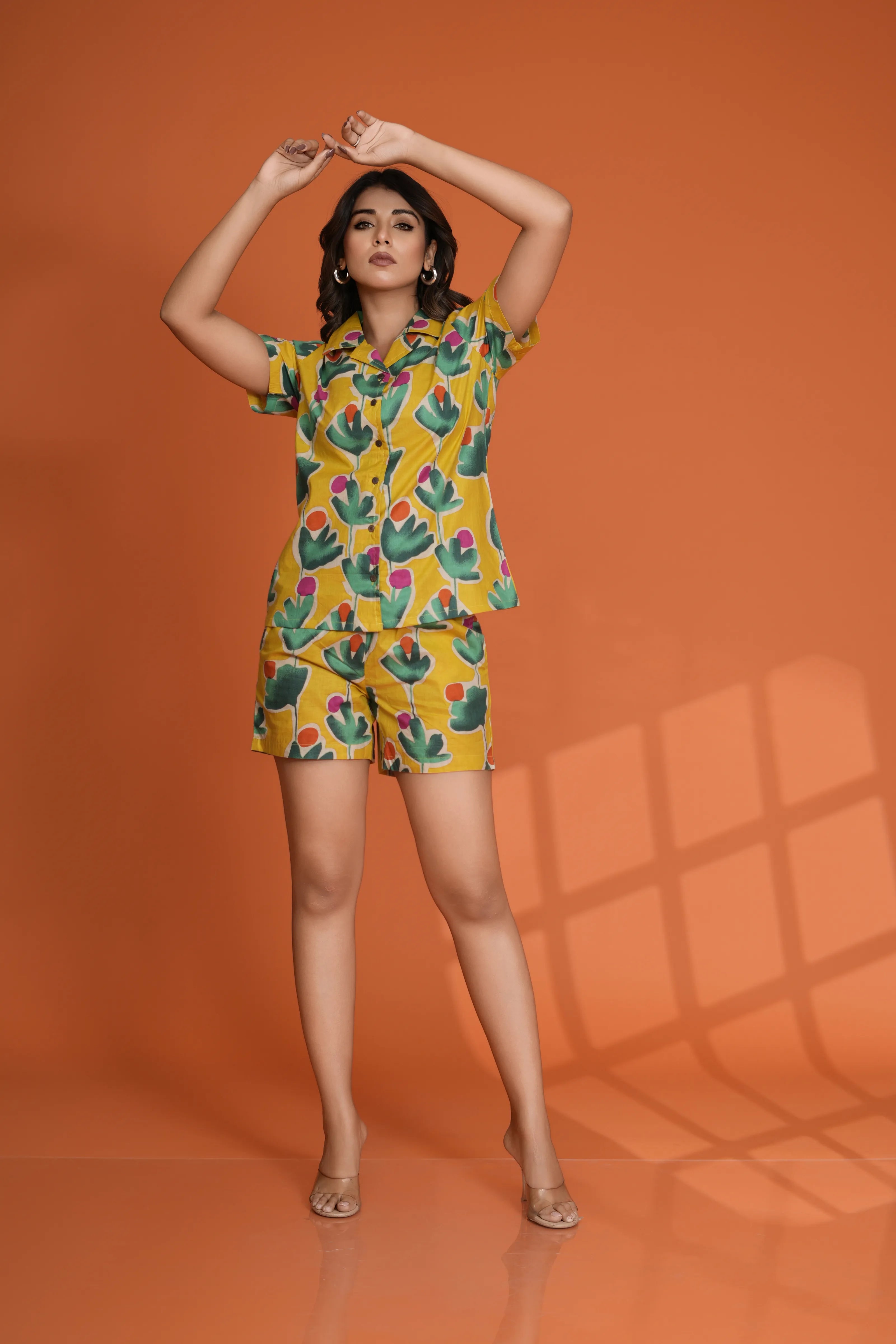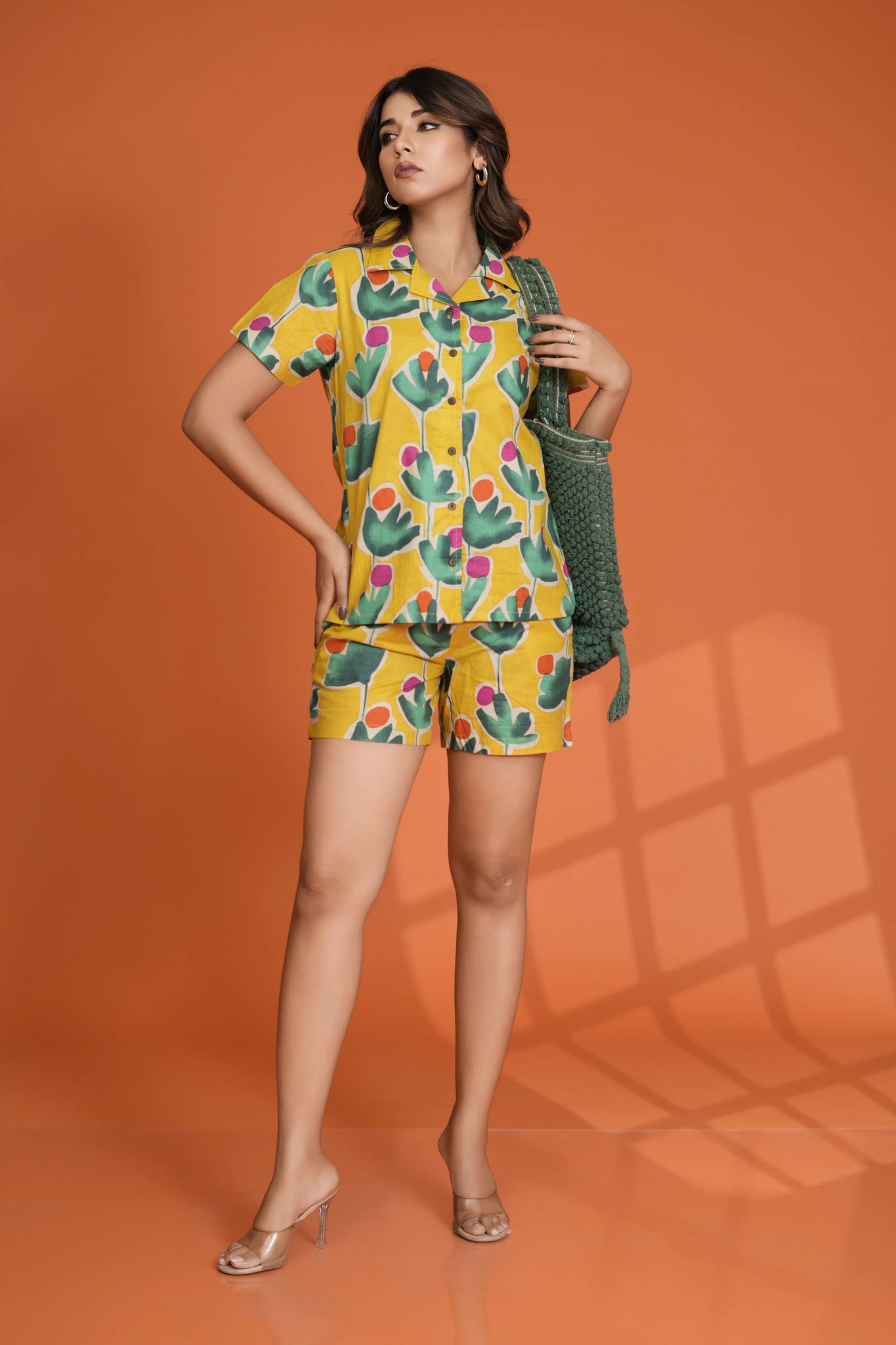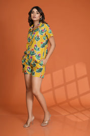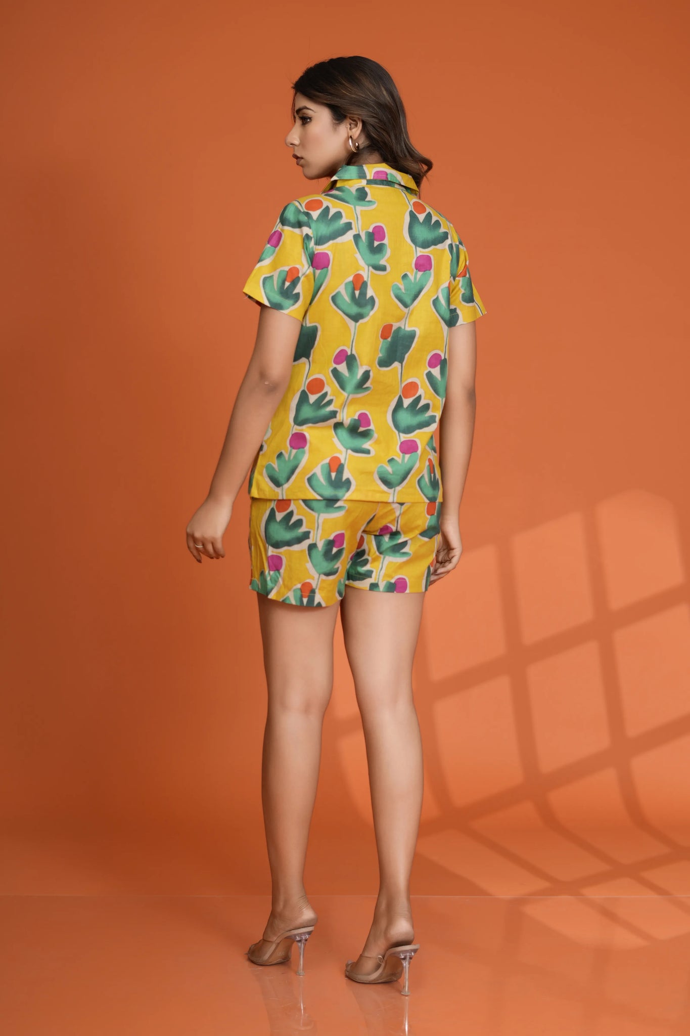 Corn Yellow Abstract Print Cotton Cambric Shirt & Shorts Co-Ord Set