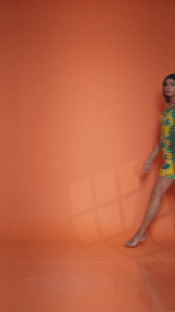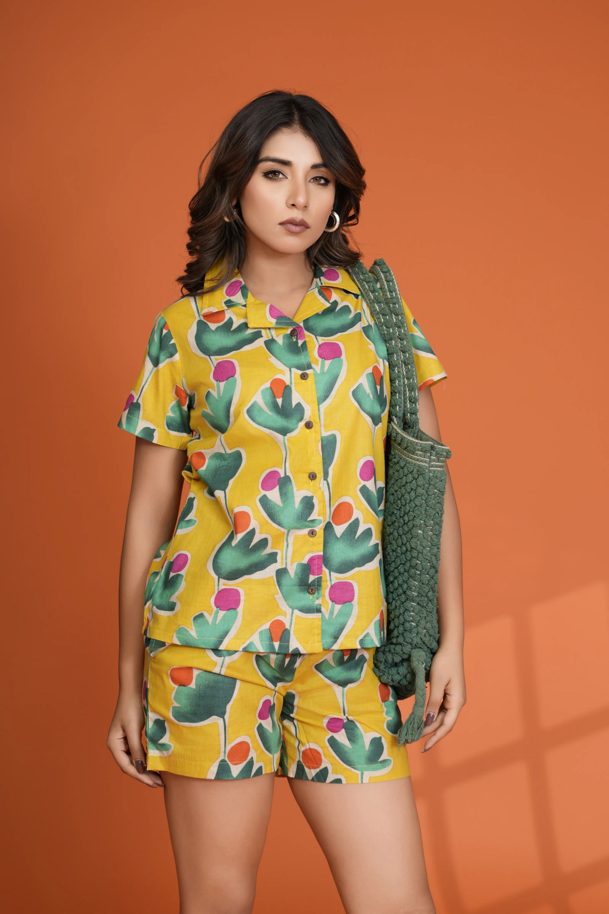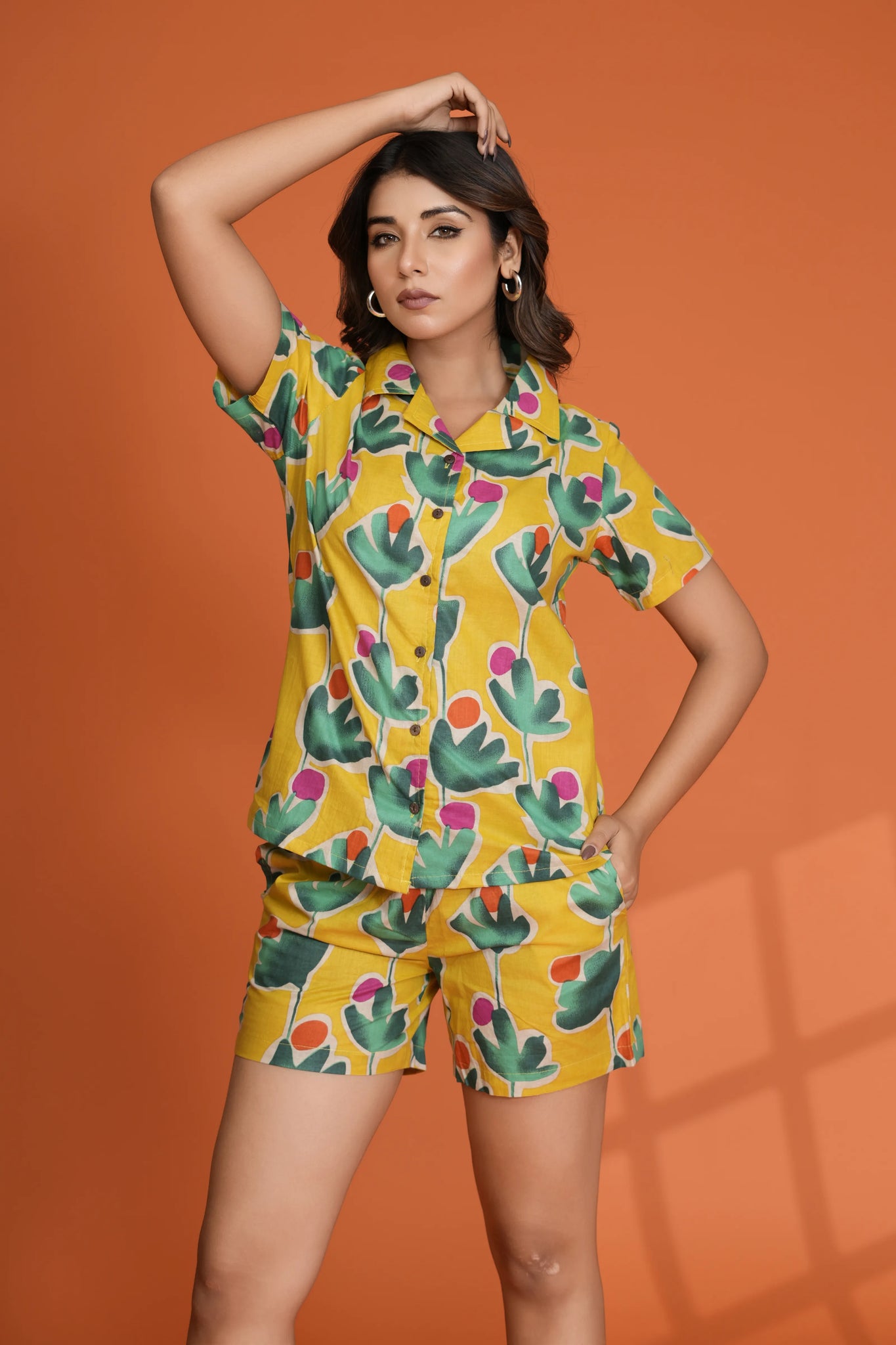 Corn Yellow Abstract Print Cotton Cambric Shirt & Shorts Co-Ord Set