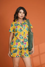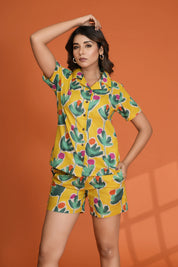 Brighten up your wardrobe with this Corn Yellow Abstract Print Co-Ord Set, a perfect blend of comfort and quirky charm. Crafted in breathable cotton cambric, the set features a shirt collar half-sleeve top paired with easy-fit shorts, ideal for laid-back outings or relaxed holiday vibes.