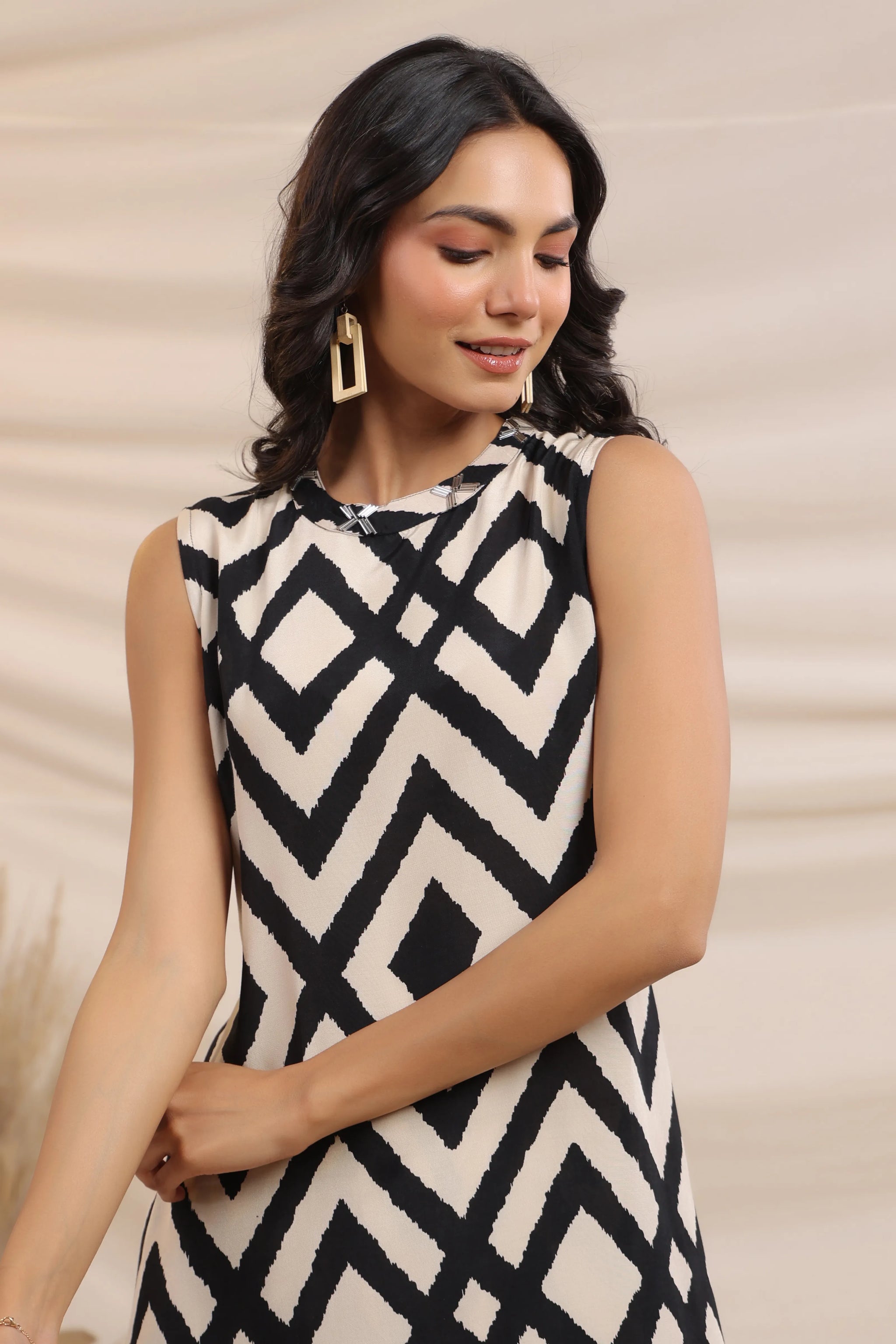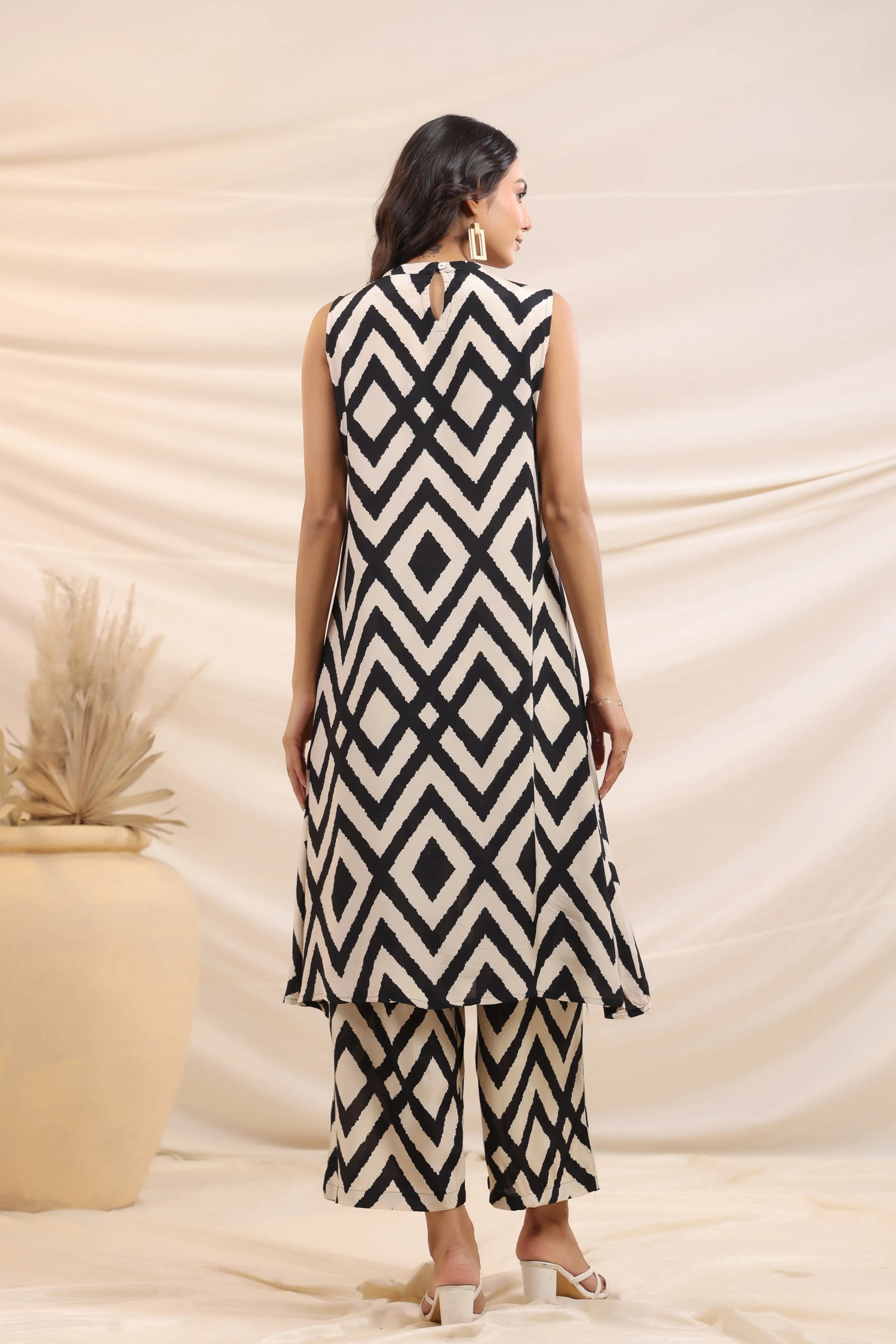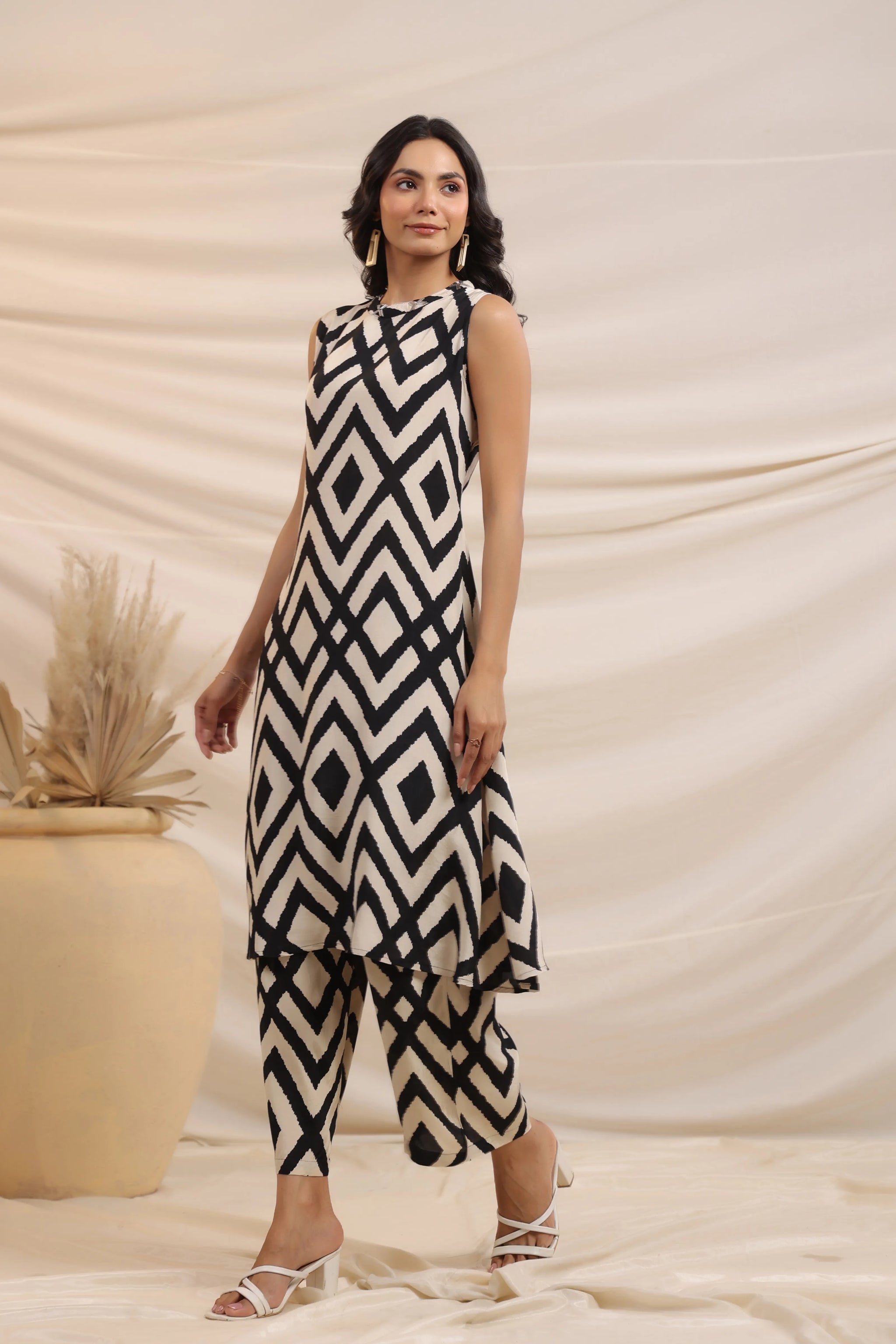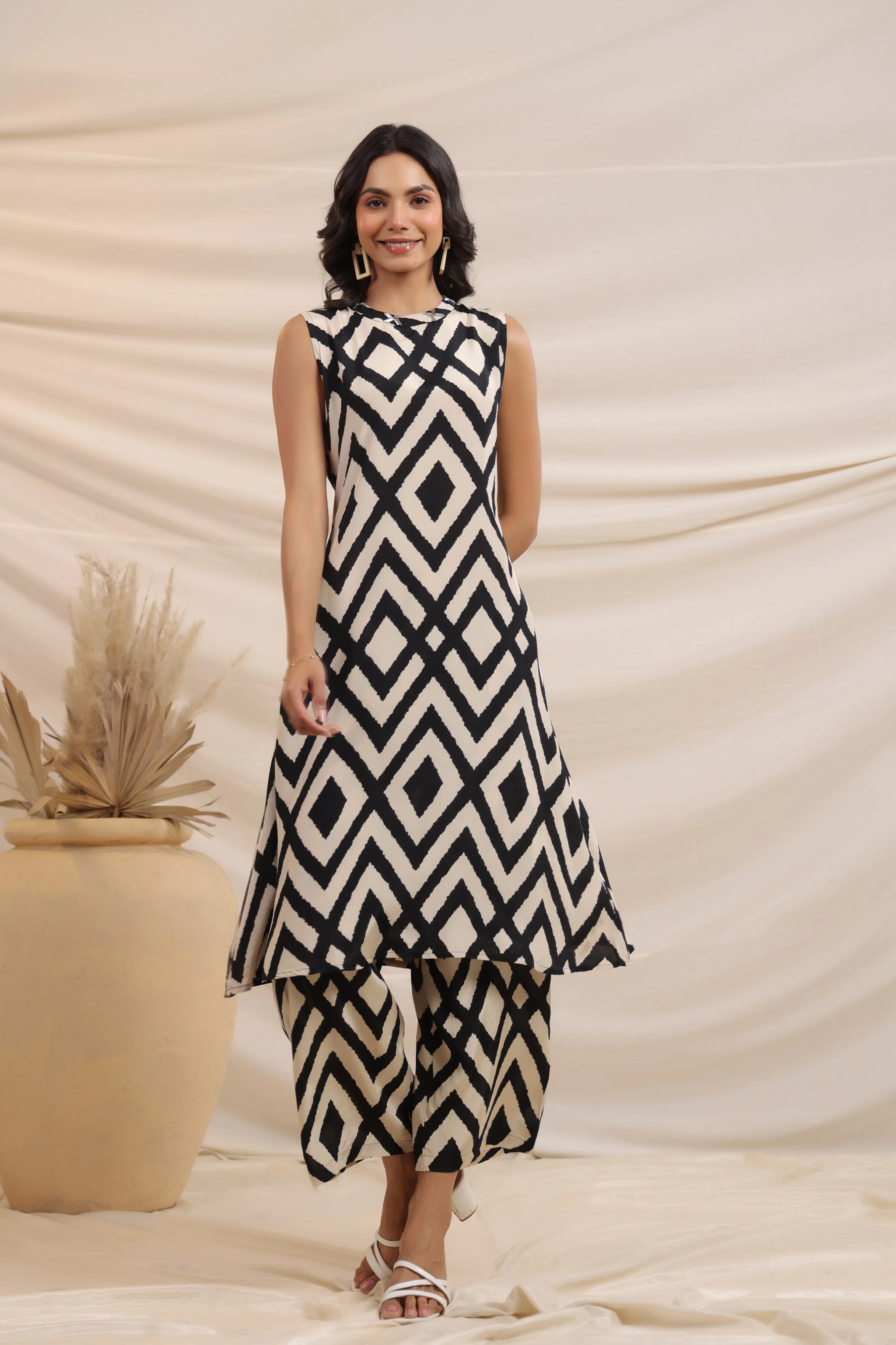 Cream & Black Abstract Geometric Print Kurta Pant Set in Russian Silk