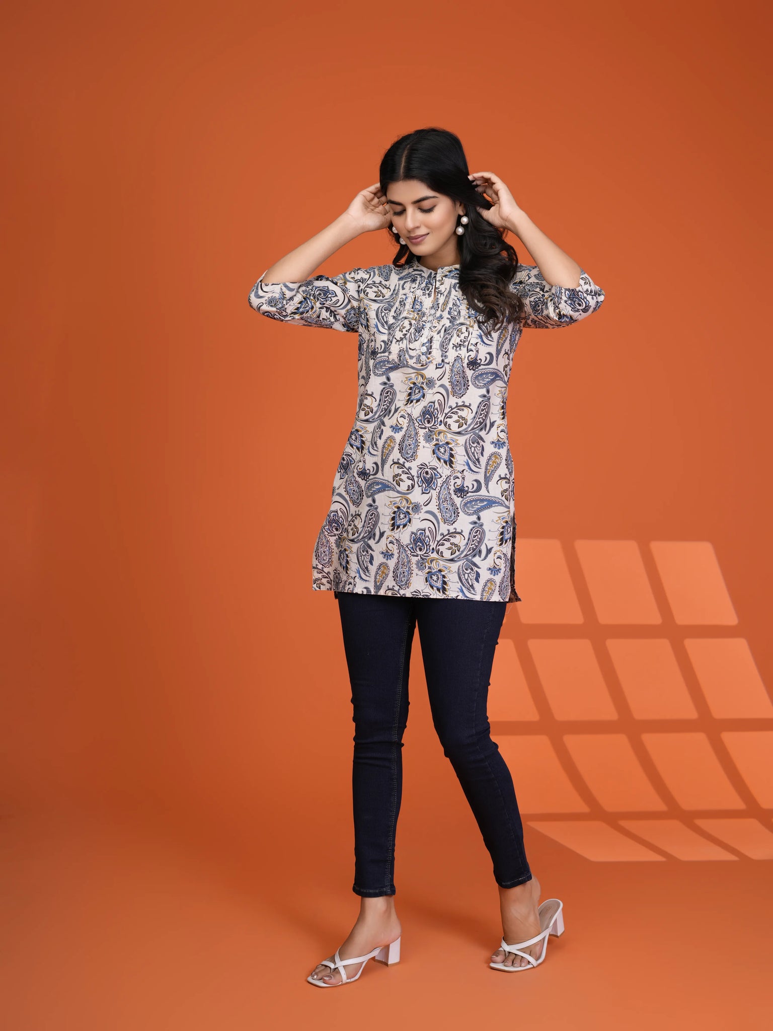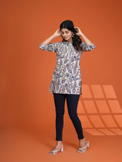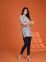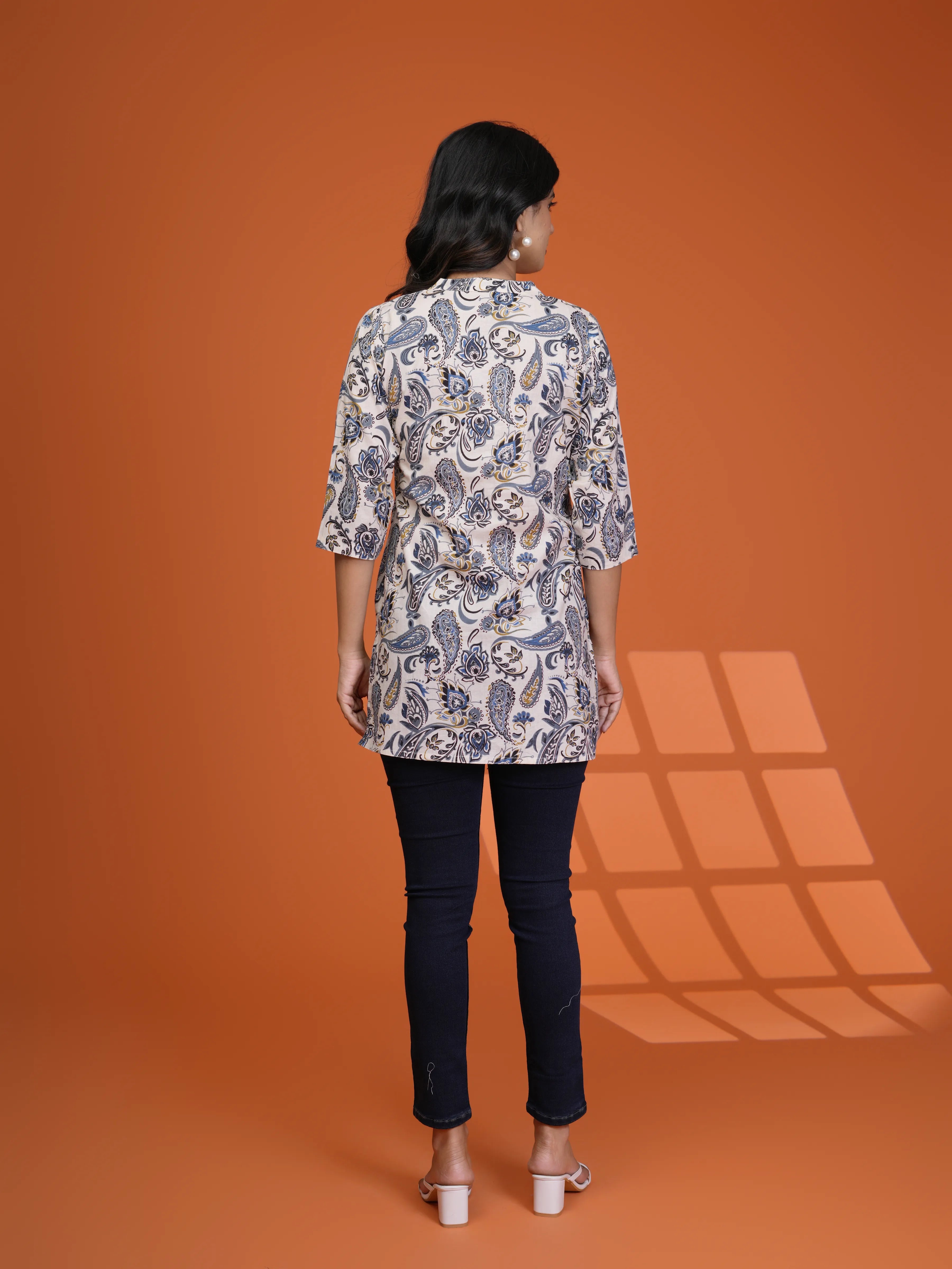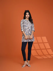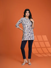 Add a dash of timeless charm to your everyday wardrobe with our Indie Ease short kurti. Set on a calming cream base, it’s adorned with a grey-blue paisley and floral print that feels both classic and contemporary.