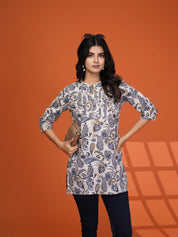 Cream Blue Paisley Pintuck Short Kurti